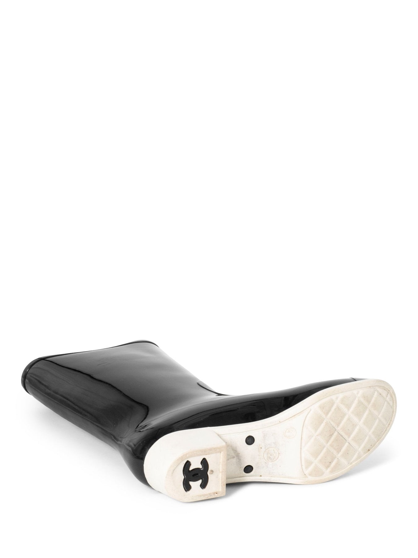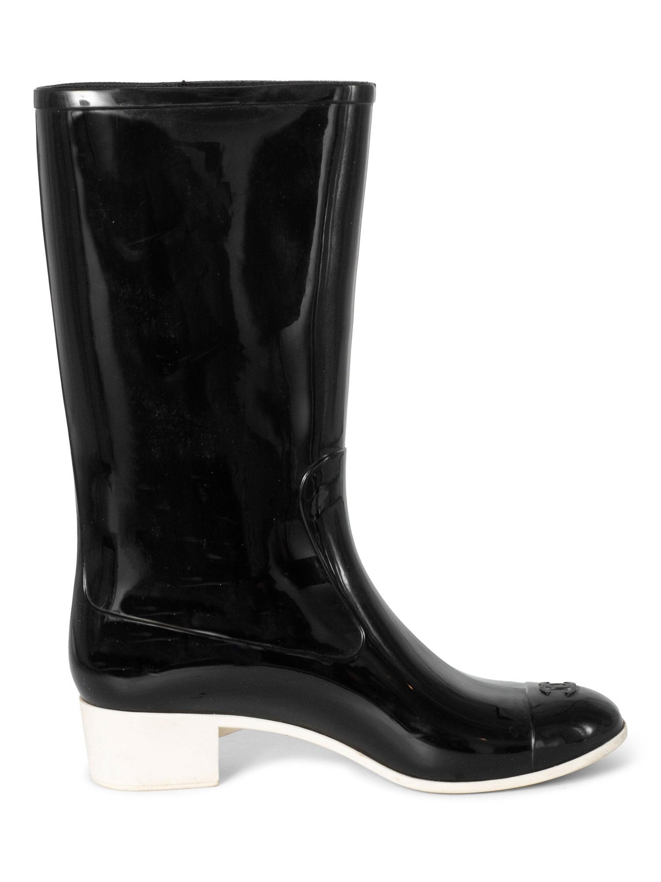 Chanel Rain Boots or . These elegant Chanel camellia rubber rain boots are in black rubber with white and black camellia flowers on each rubber boot. The rain boots feature a 2'' block heel, CC logo on each toe  and gold CC logo interlocking on the camellia flowers.