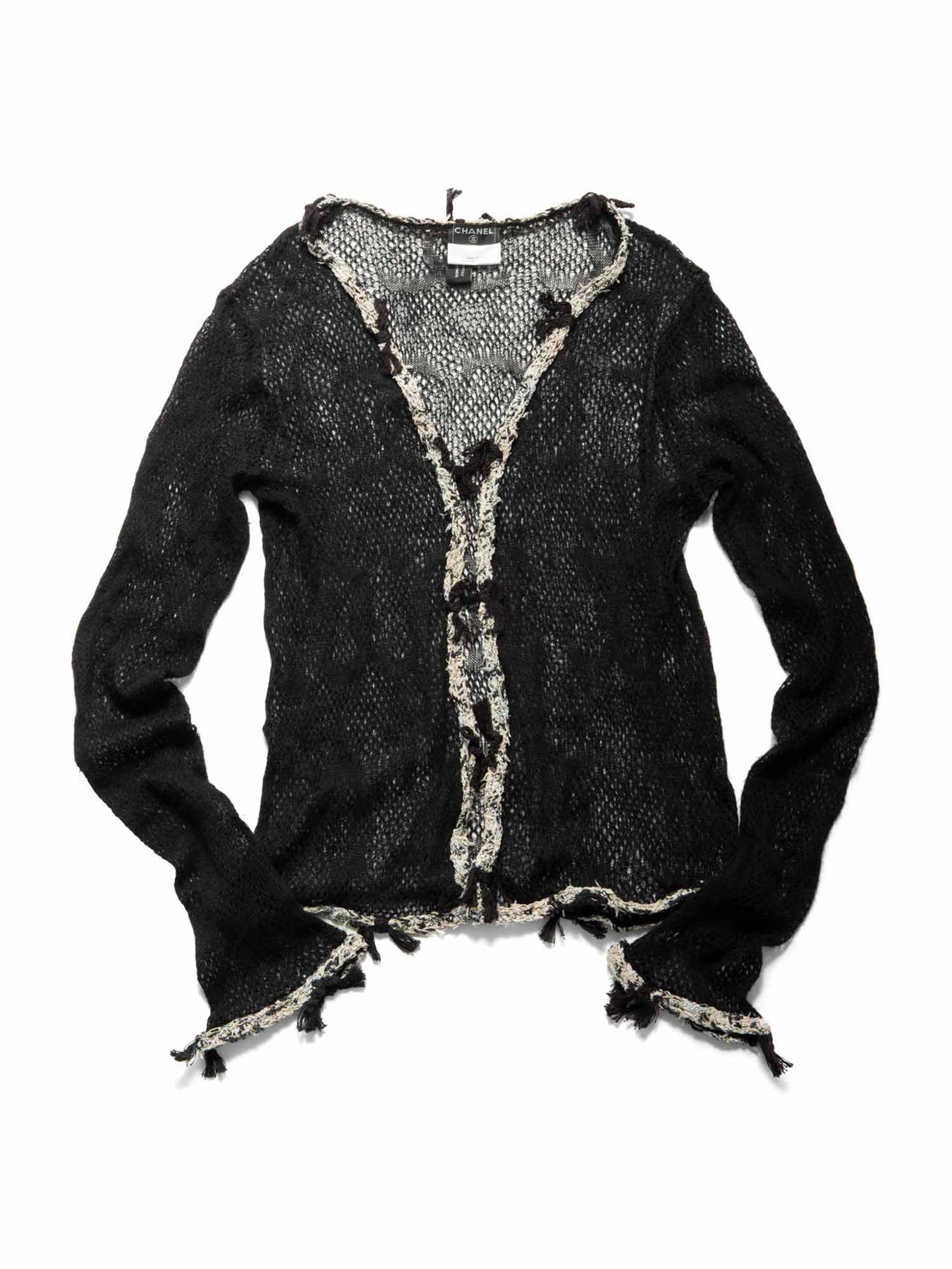 CHANEL CC Logo Cardigan or . This CHANEL cardigan is in a beautiful knitted cashmere featuring a CC Logo throughout. It has distressed tweed trim featuring bow details. Made in Italy.