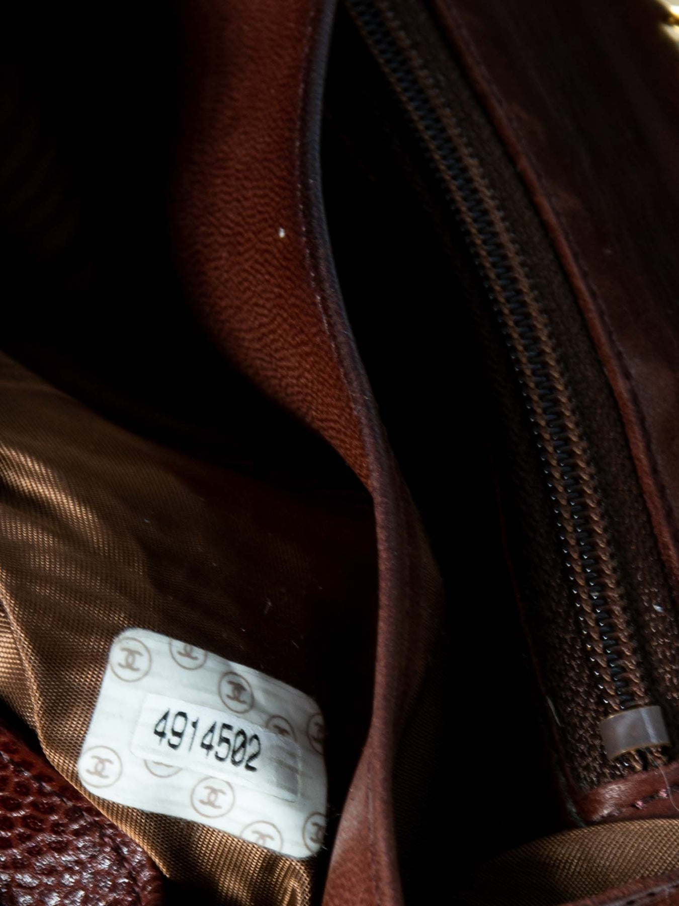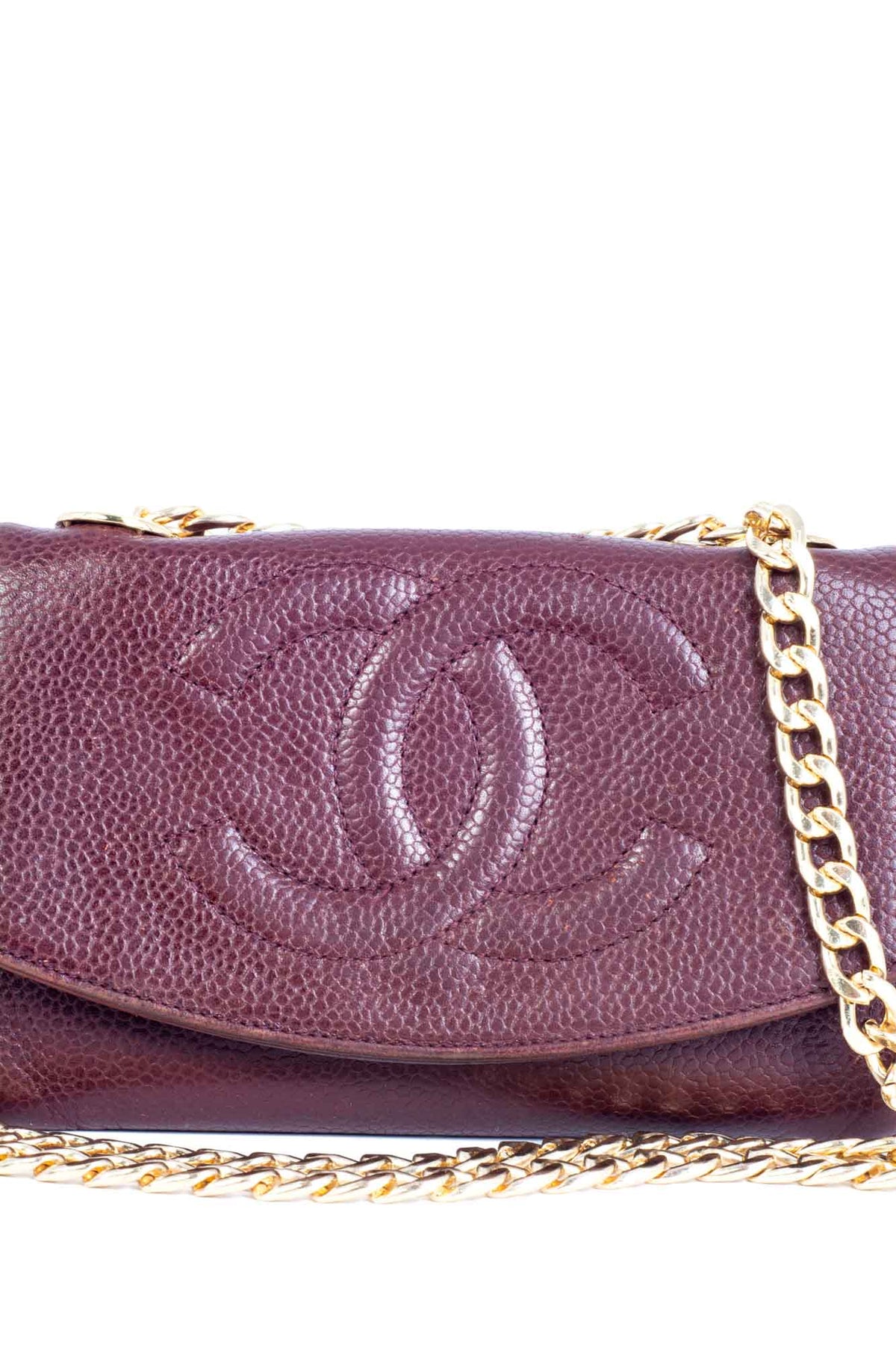 Chanel CC Logo Leather Timeless Mini Wallet On Chain or . The wallet is crafted of gorgeous brown caviar leather with a large Chanel CC stitched onto the frontal flap. The wallet features a gold chain shoulder strap. The flap opens to an interior of leather and fabric with one large pocket, one slip pocket, and one zipper pocket.