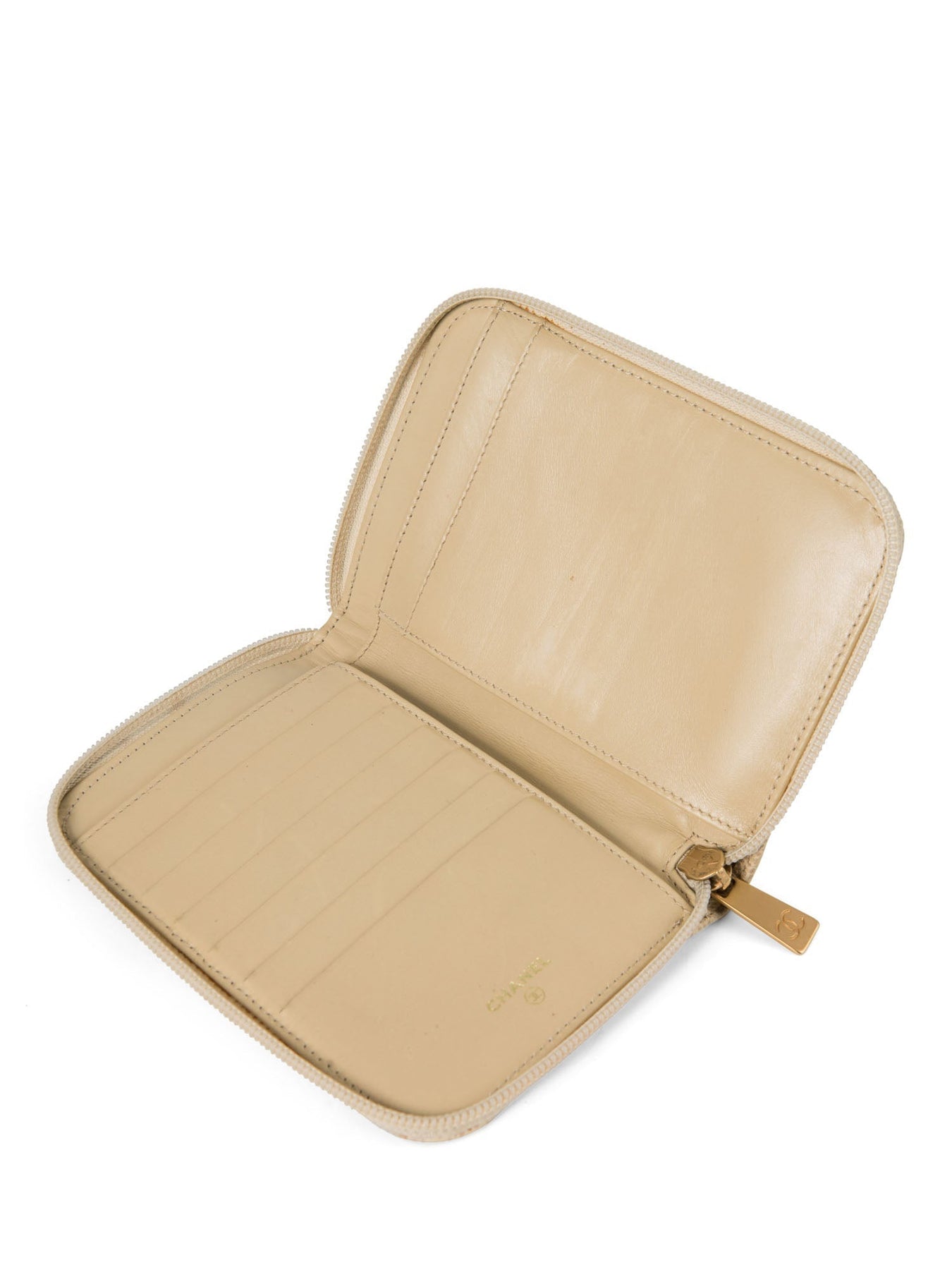 CHANEL CC Logo Caviar Leather Zippered Wallet . This CHANEL logo is in ivory caviar leather featuring jumbo CC logo on the front panel and gold tone hardware. This wallet opens with a zippered closure to a ivory leather lined interior with four slip pockets, six card slots and zippered pocket on the back panel.