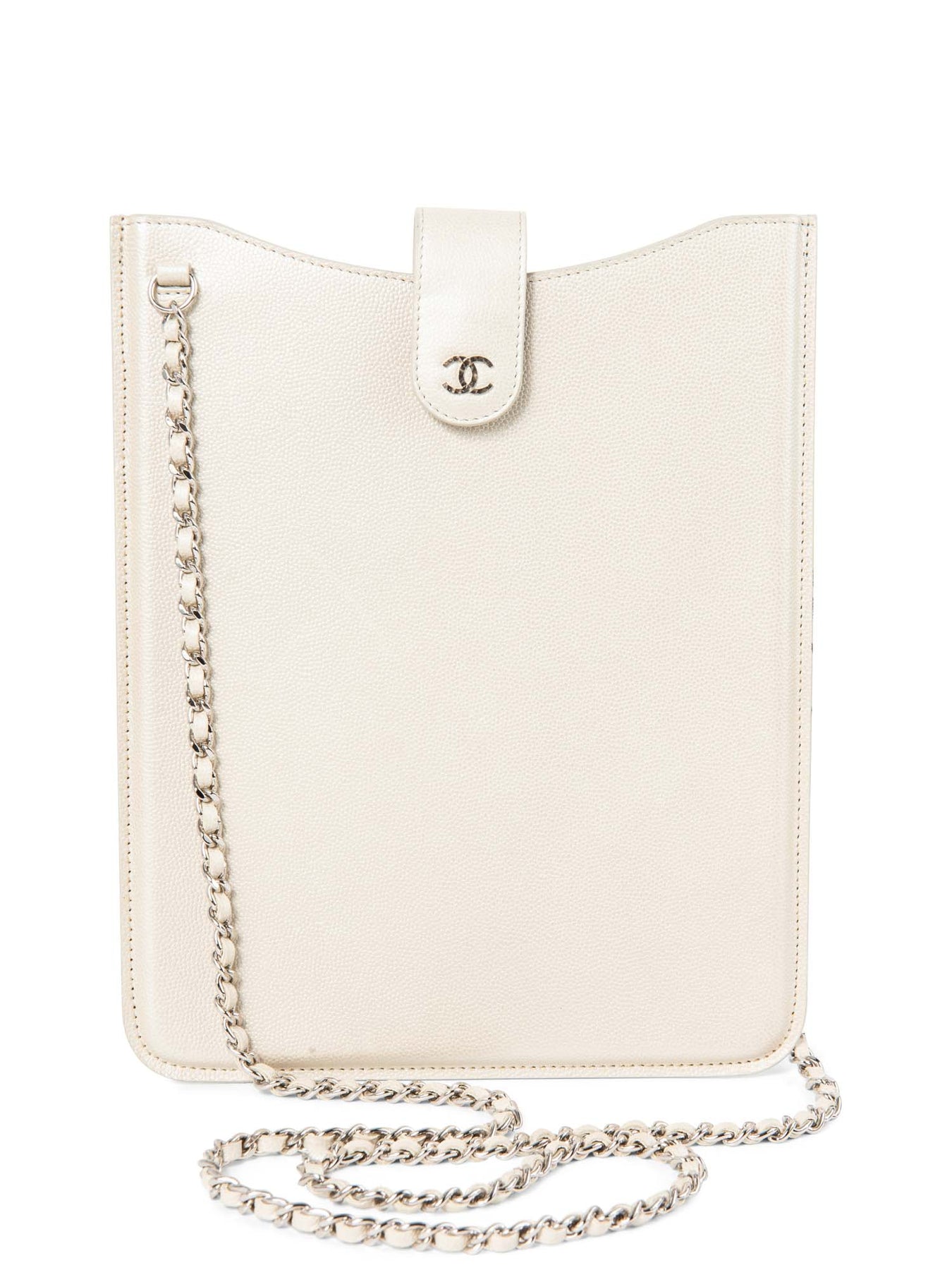 CHANEL CC Logo Caviar Messenger Bag or . This CHANEL bag is in pearl eggshell caviar leather, featuring silver tone hardware. This bag features a CC logo on the front and a chain strap.