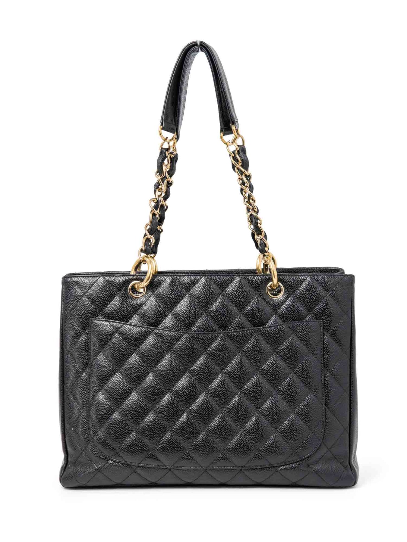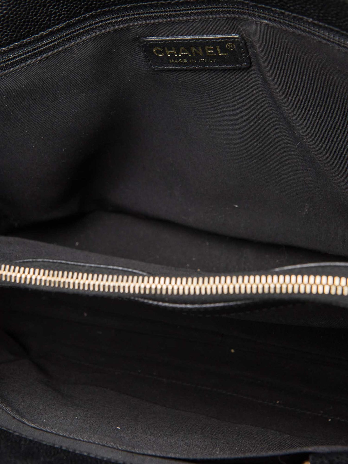 Chanel Tote Bag or . This Chanel bag is in black caviar quilted leather with gold tone hardware. It features a double woven leather strap with shoulder guards, frontal stitched CC Logo, rear slip pocket, attached key clip, zipped compartment divider, black inner lining with one patch pocket and one zipped pocket