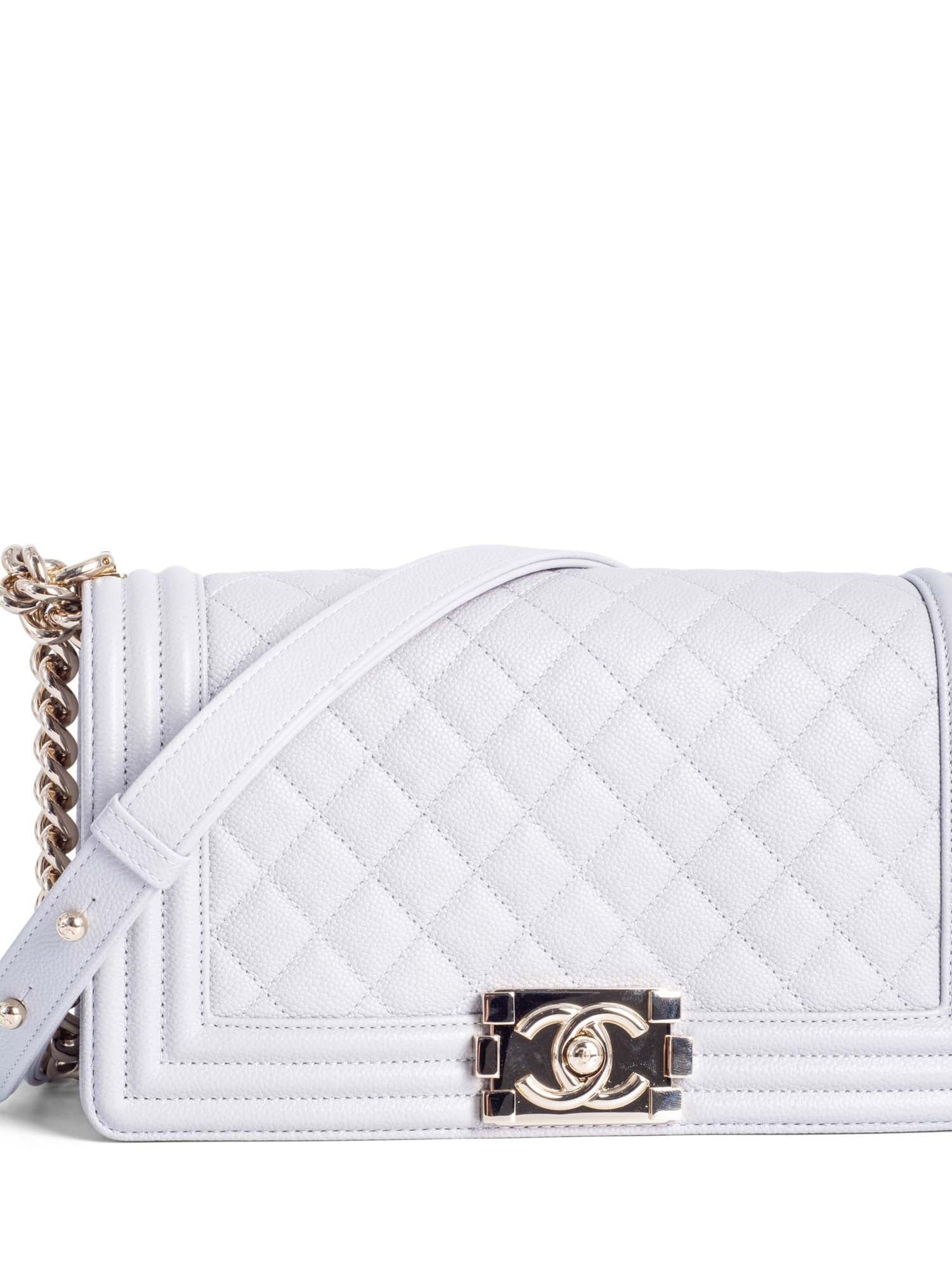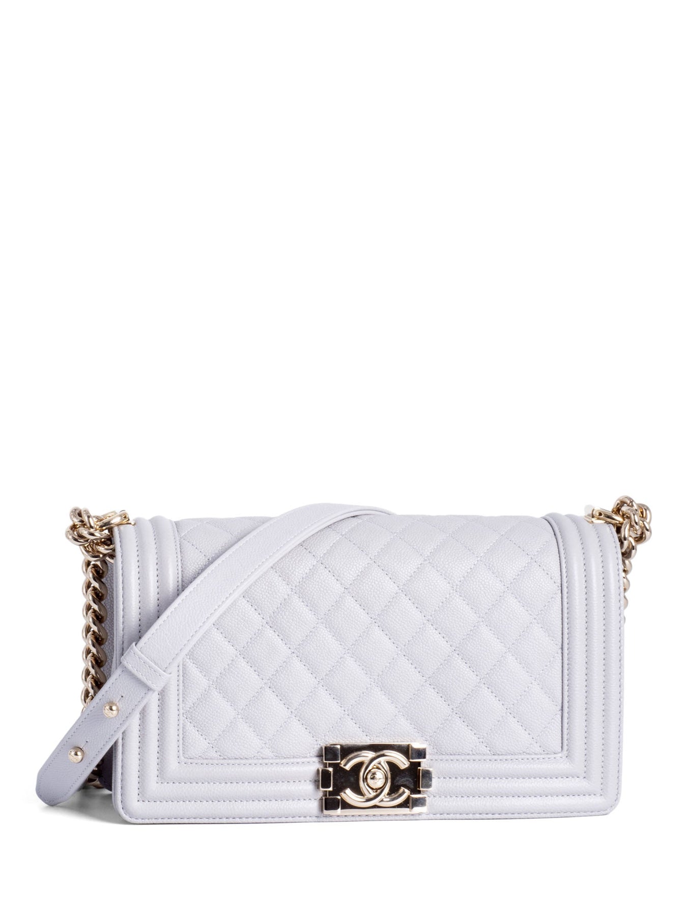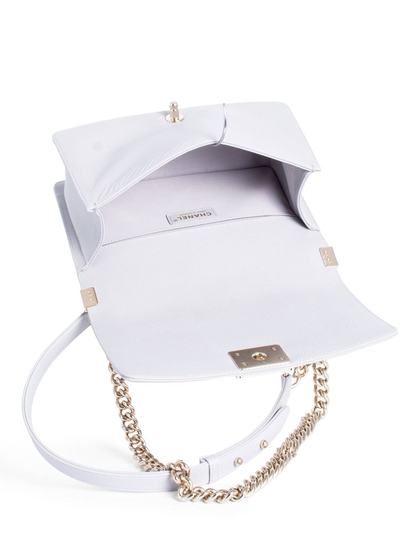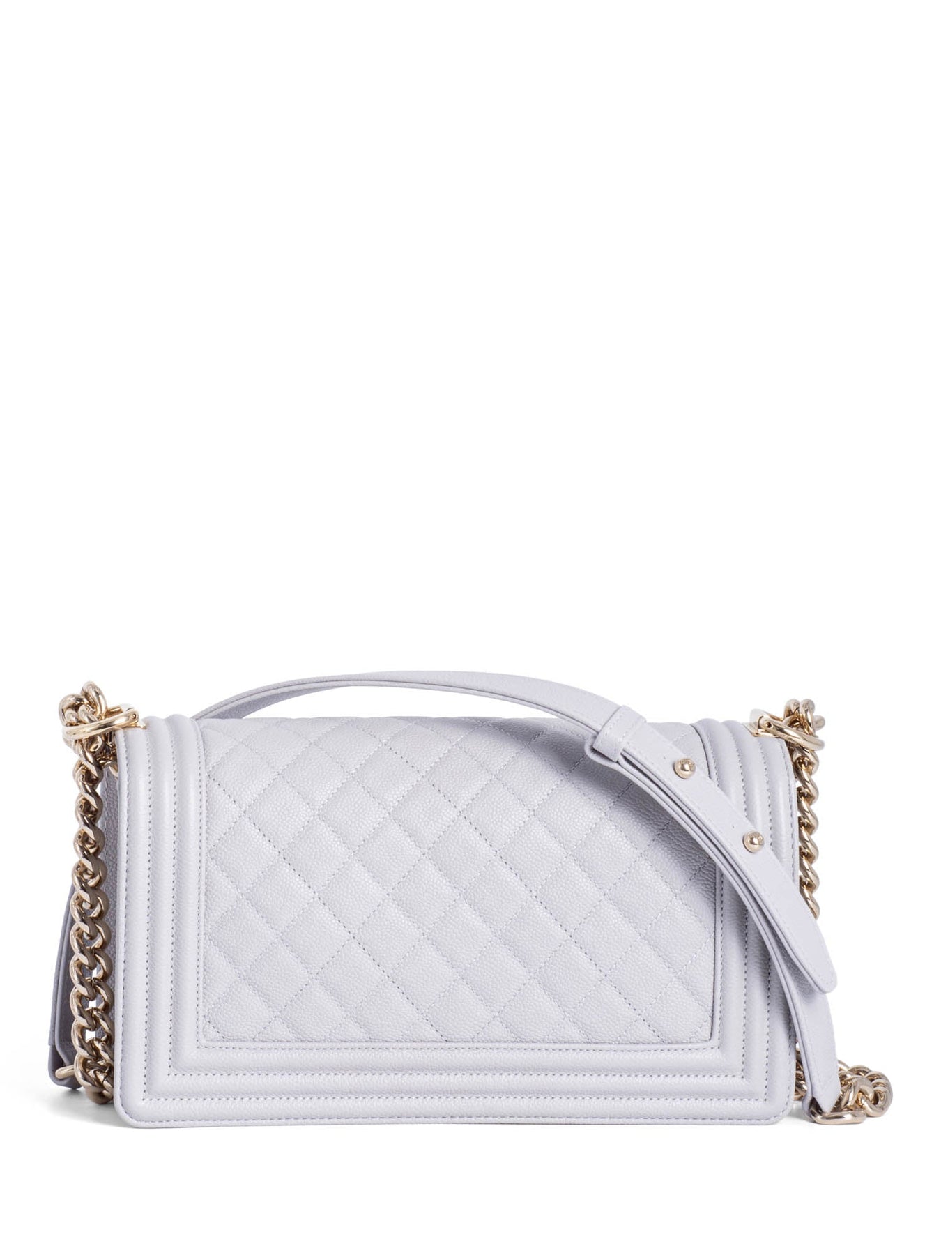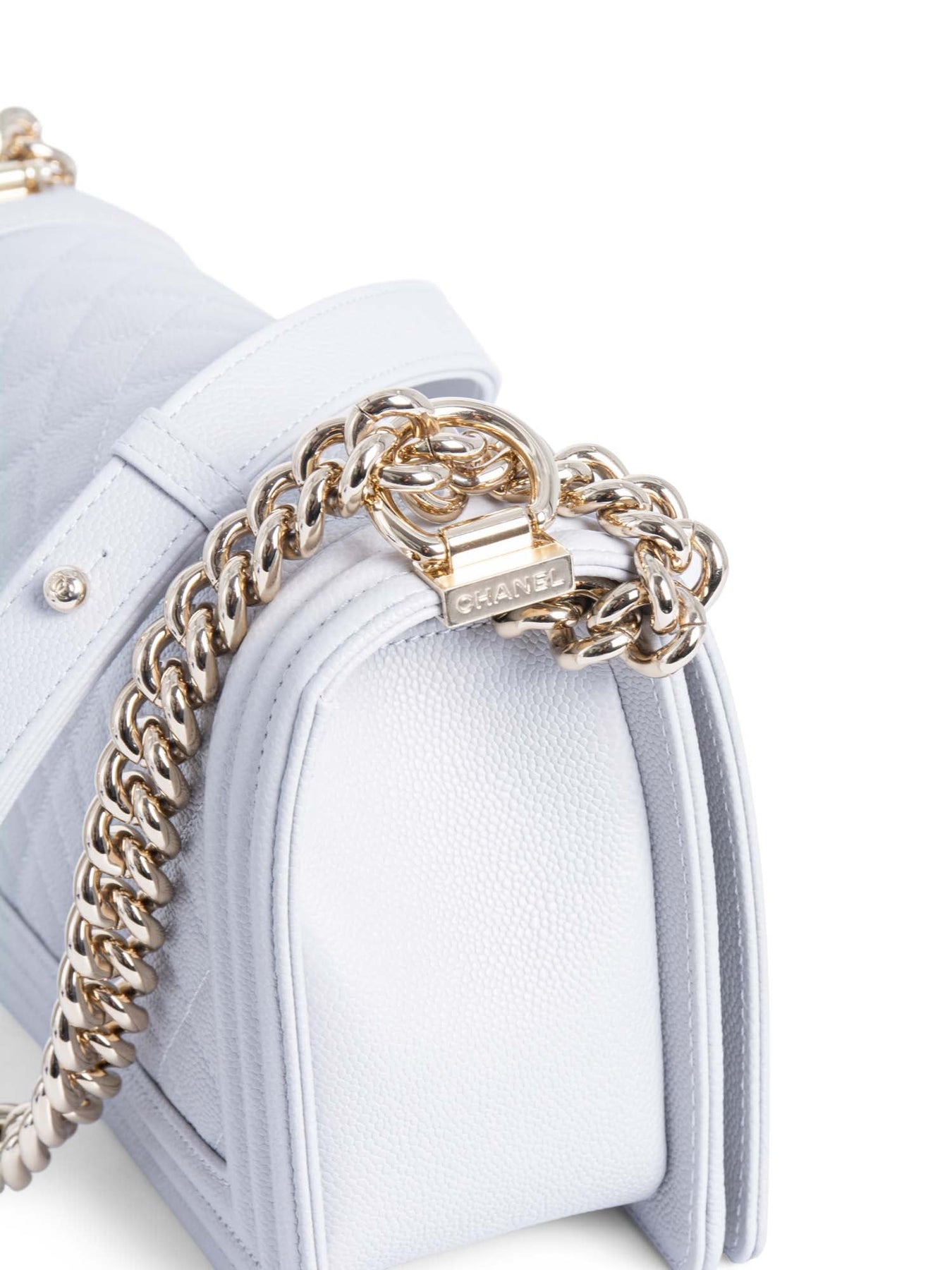 Chanel CC Logo Medium Leather Boy Bag or . This bag is crafted in light grey quilted caviar leather with an adjustable strap and champagne-tone hardware. The bag features a CC logo push-lock front closure and light grey lined interior with one slit pocket.