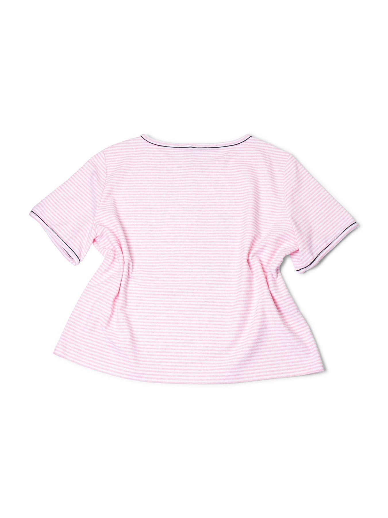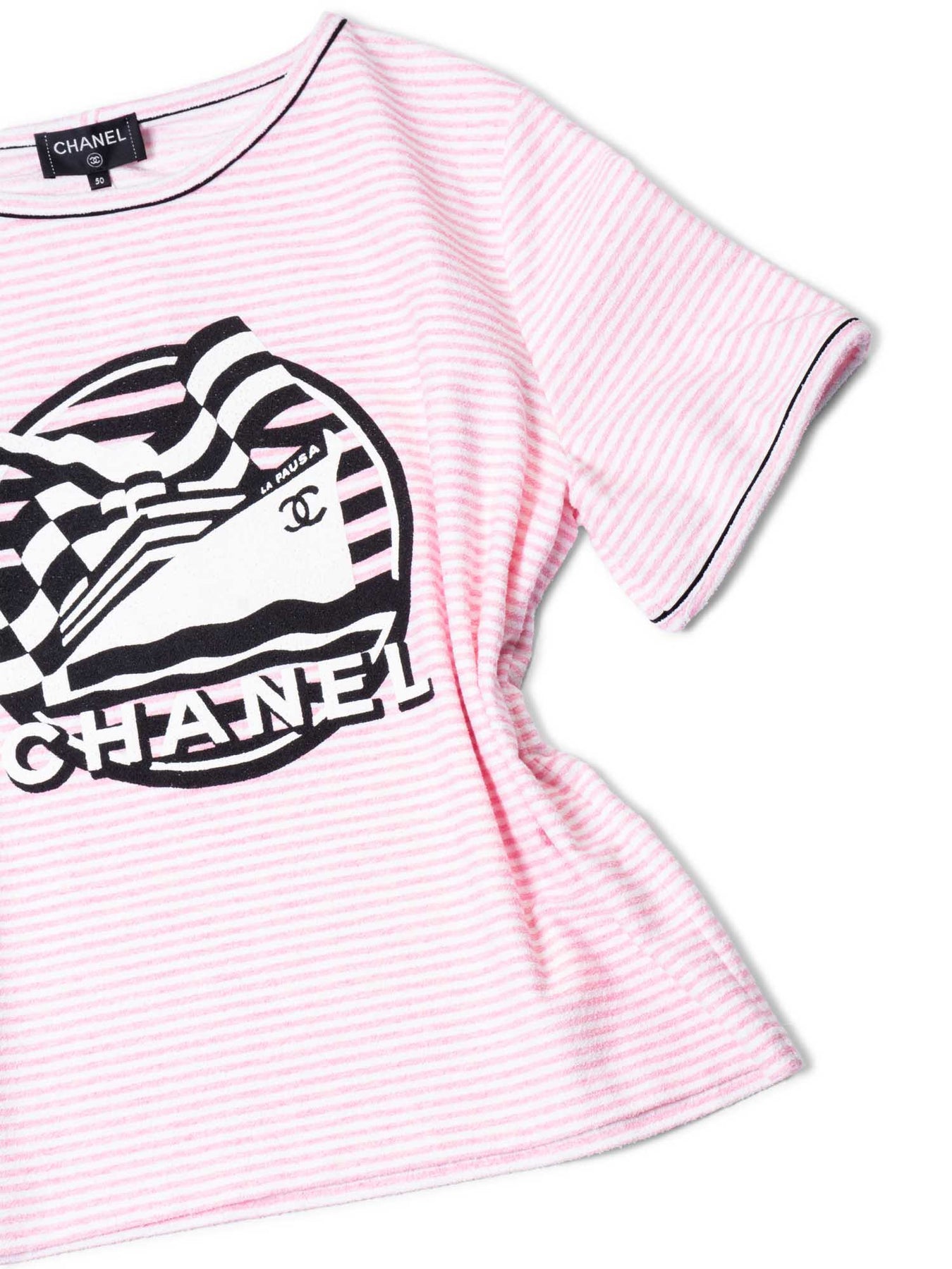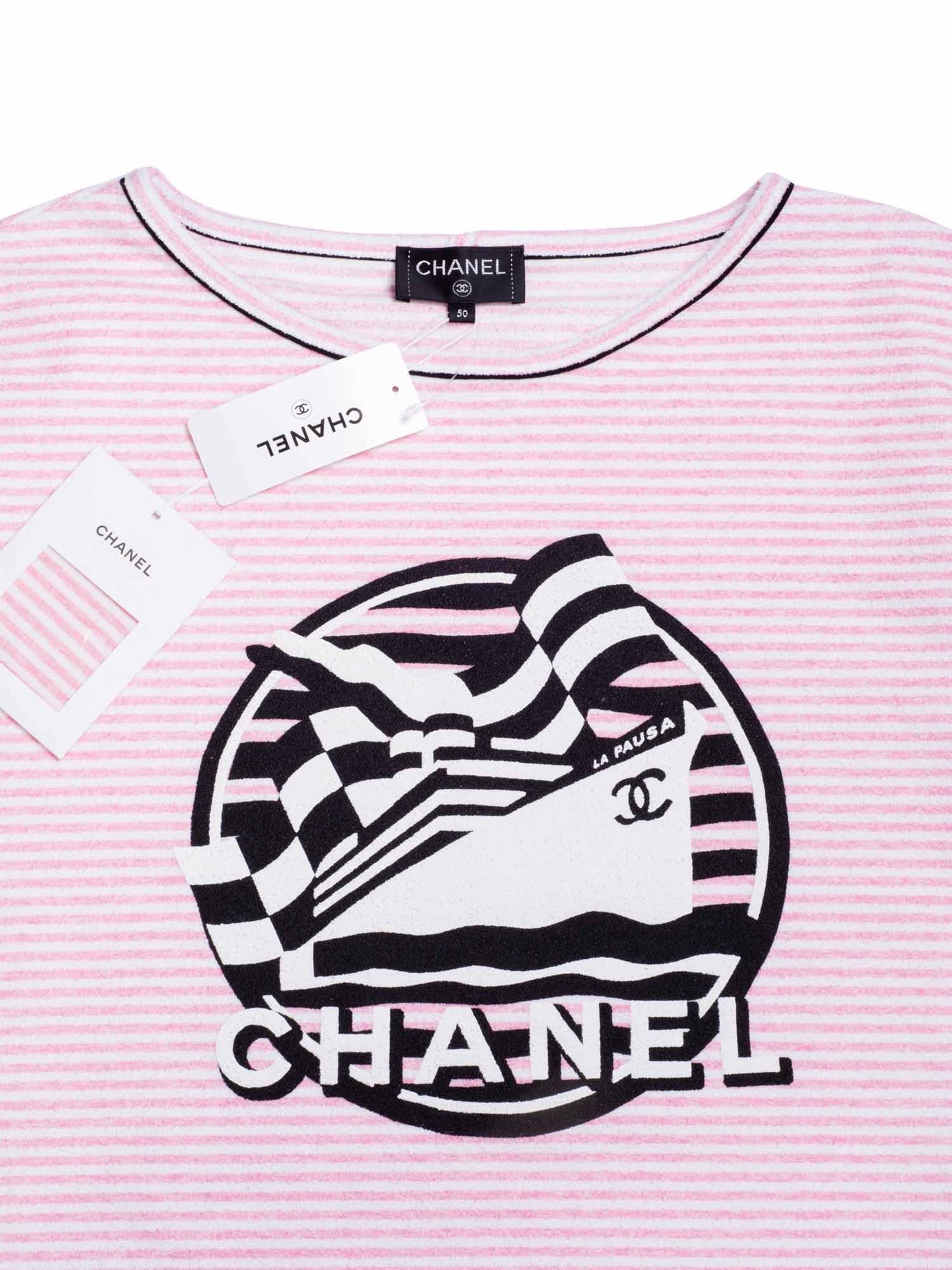 Chanel La Pausa or . This top is in cotton terrycloth with pink and white stripes. It features a large Chanel cruise design with a CC logo and black trim along a bateau neckline and the sleeves. This is apart of one of Karl Lagerfeld's last collections. The perfect top for Chanel lovers this summer!