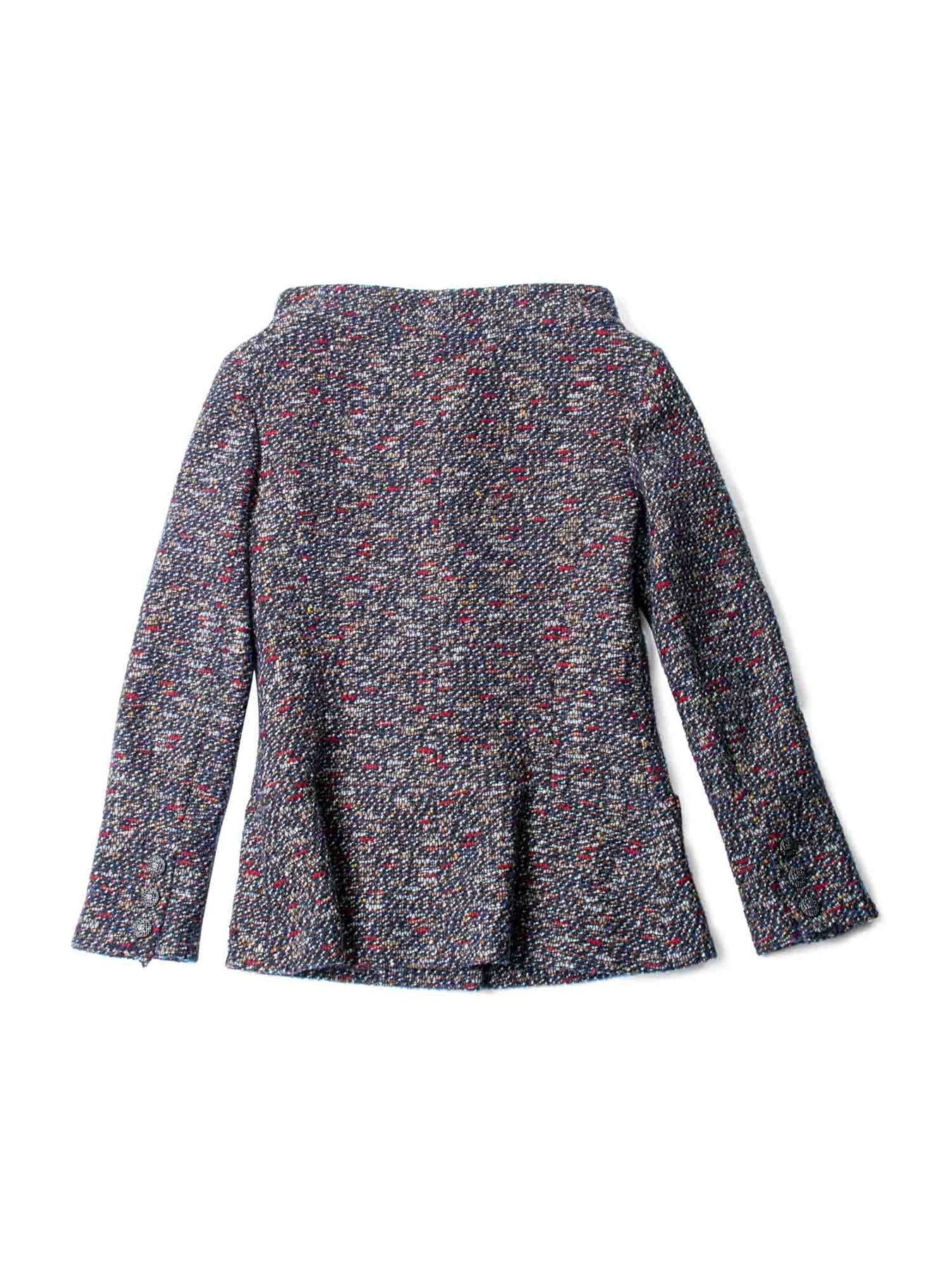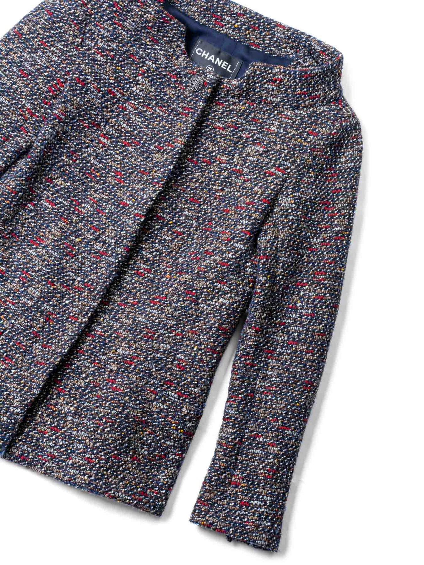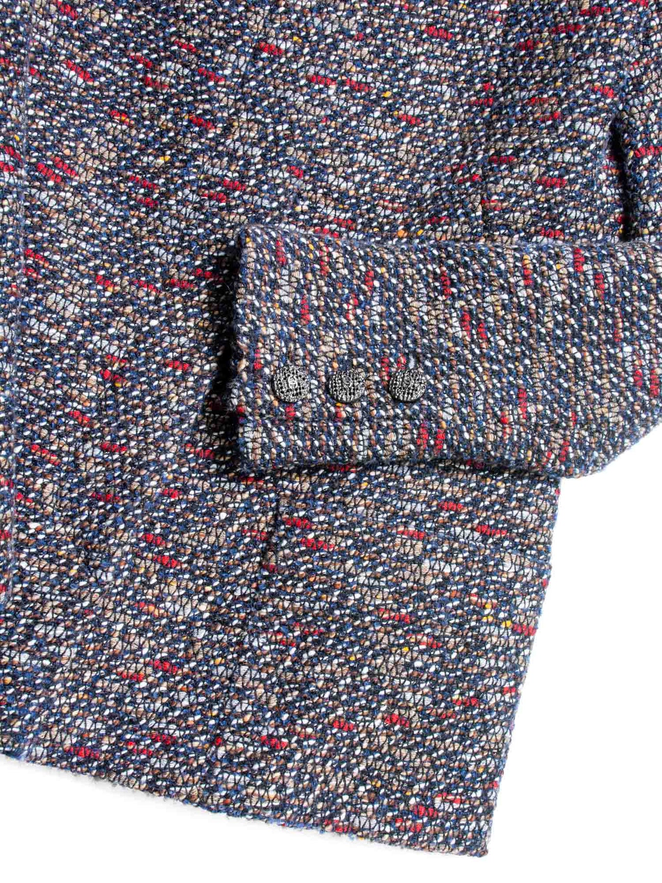 CHANEL jacket or . This CHANEL jacket comes in a beautiful multicolor fantasy tweed with a brown hue. It features silver tone CHANEL CC logo buttons, two front pockets, and a camellia silk inner lining.