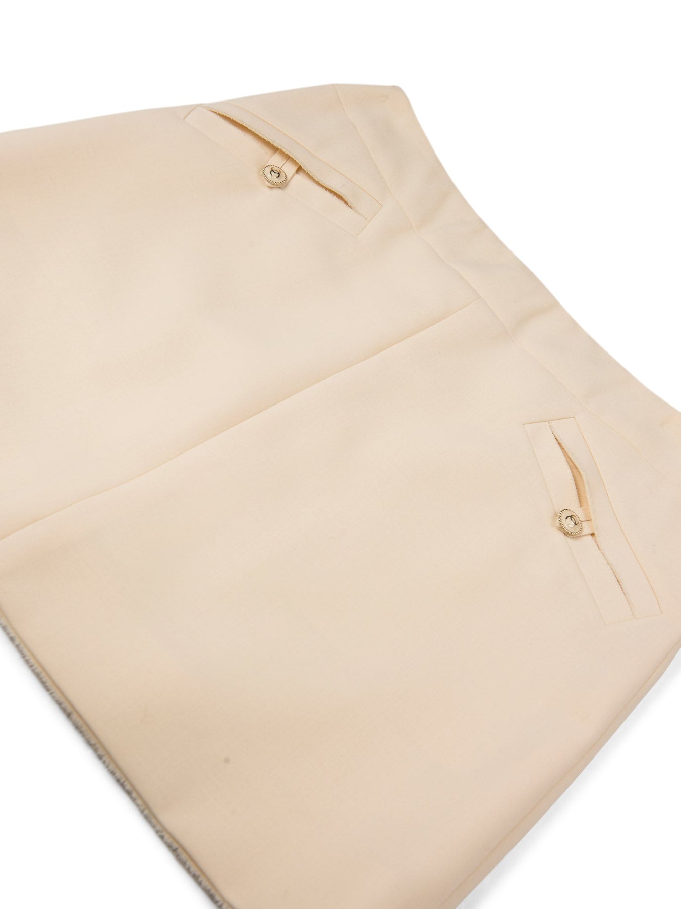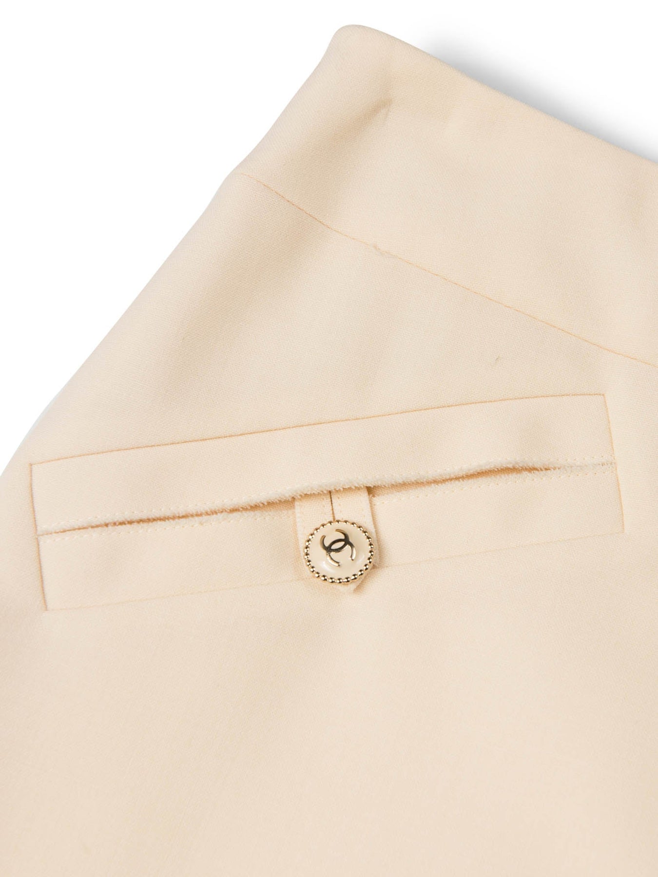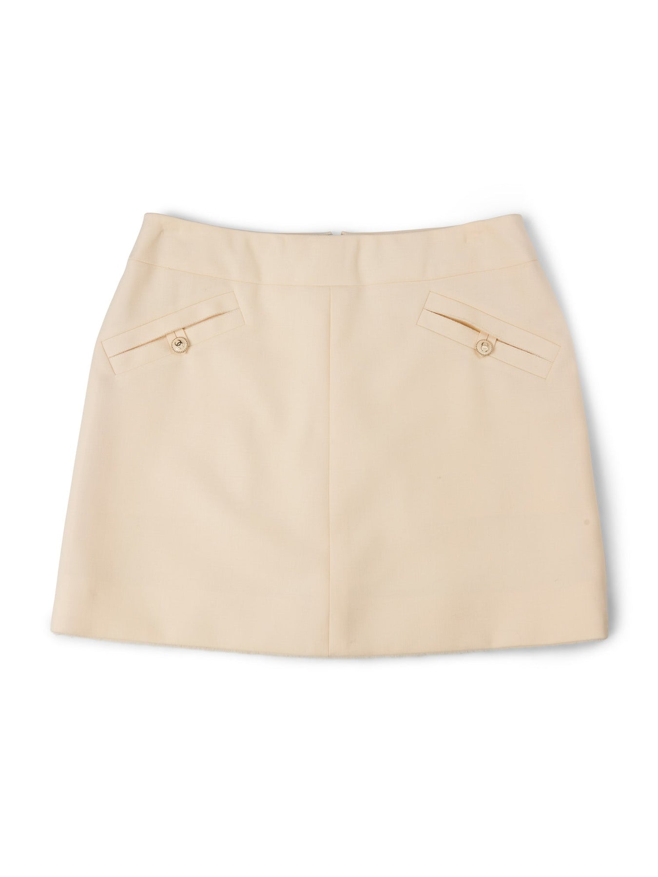 CHANEL CC Logo Skirt or . This Chanel mini skirt is in ivory color with two front pockets featuring CC logo buttons. It is lined with silk and features fringe detail on the trim and pockets. This skirt is from Chanel spring 2007 collection.