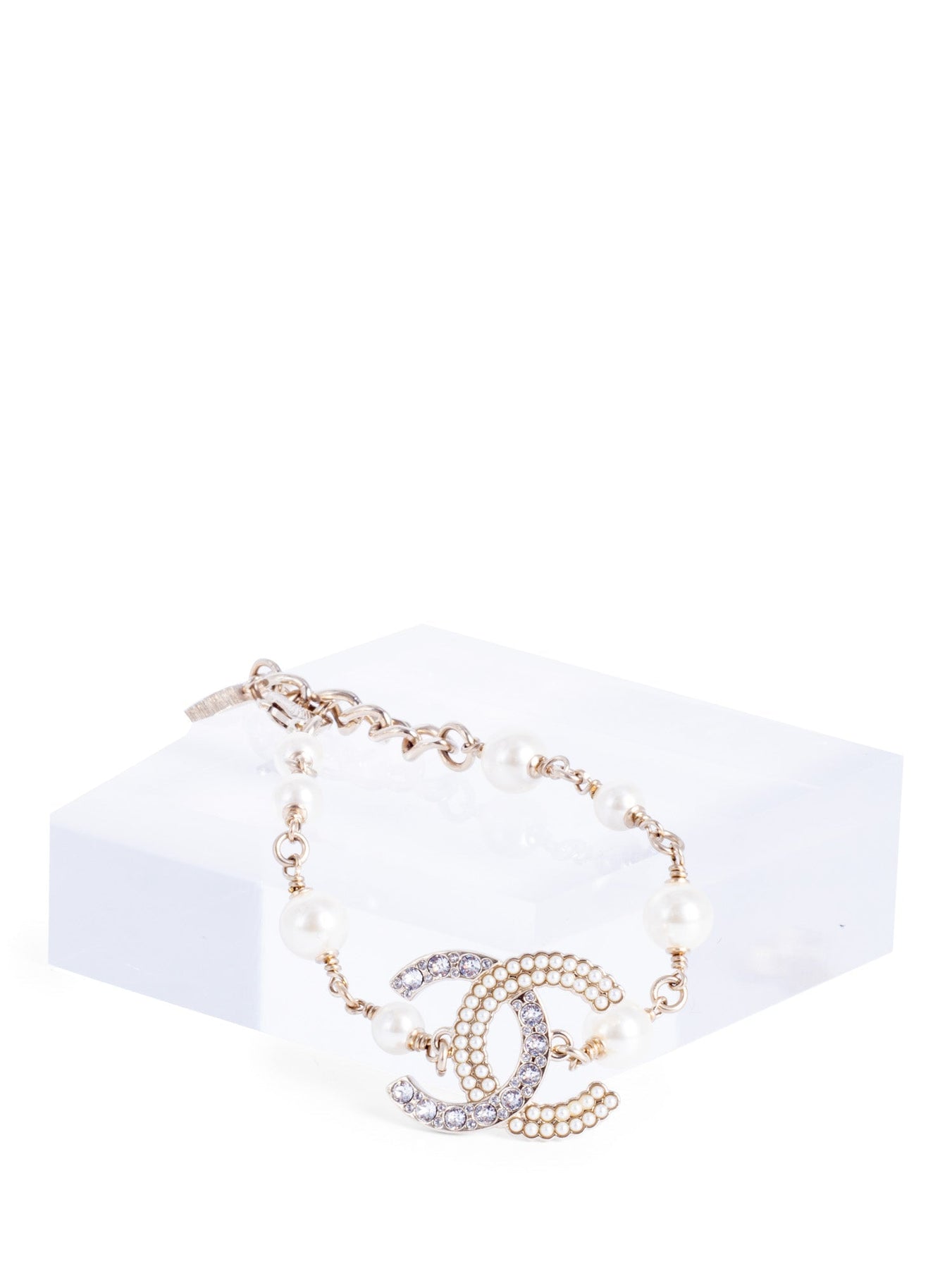 CHANEL Gold Pearl Bracelet or . This bracelet is in gold with pearl detailing. It features a CC logo charm embedded with pearls and crystals as well as a smaller hanging CC logo charm. It is all held together by a chain and hook closure,