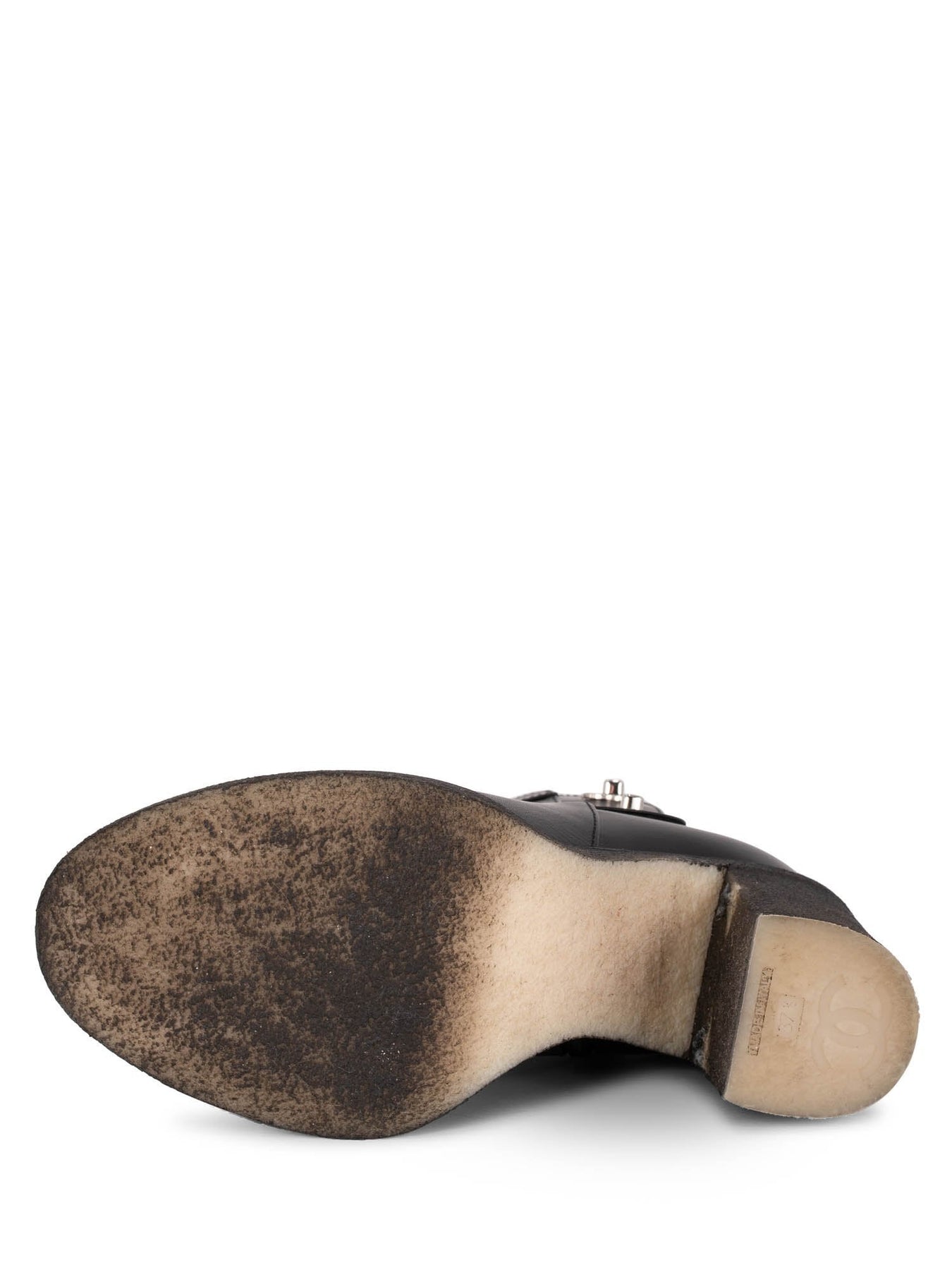 Chanel CC Logo Ankle Boots or . These boots are in black leather with solver hardware. They feature a side zip closure, block heel, silver CC logo accents, and a round toe.