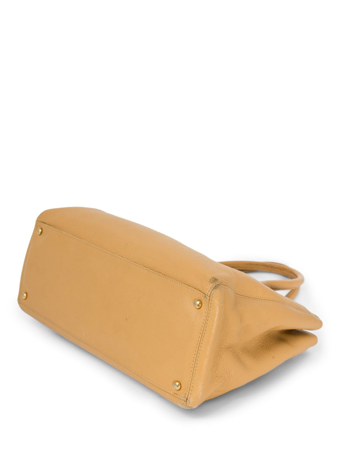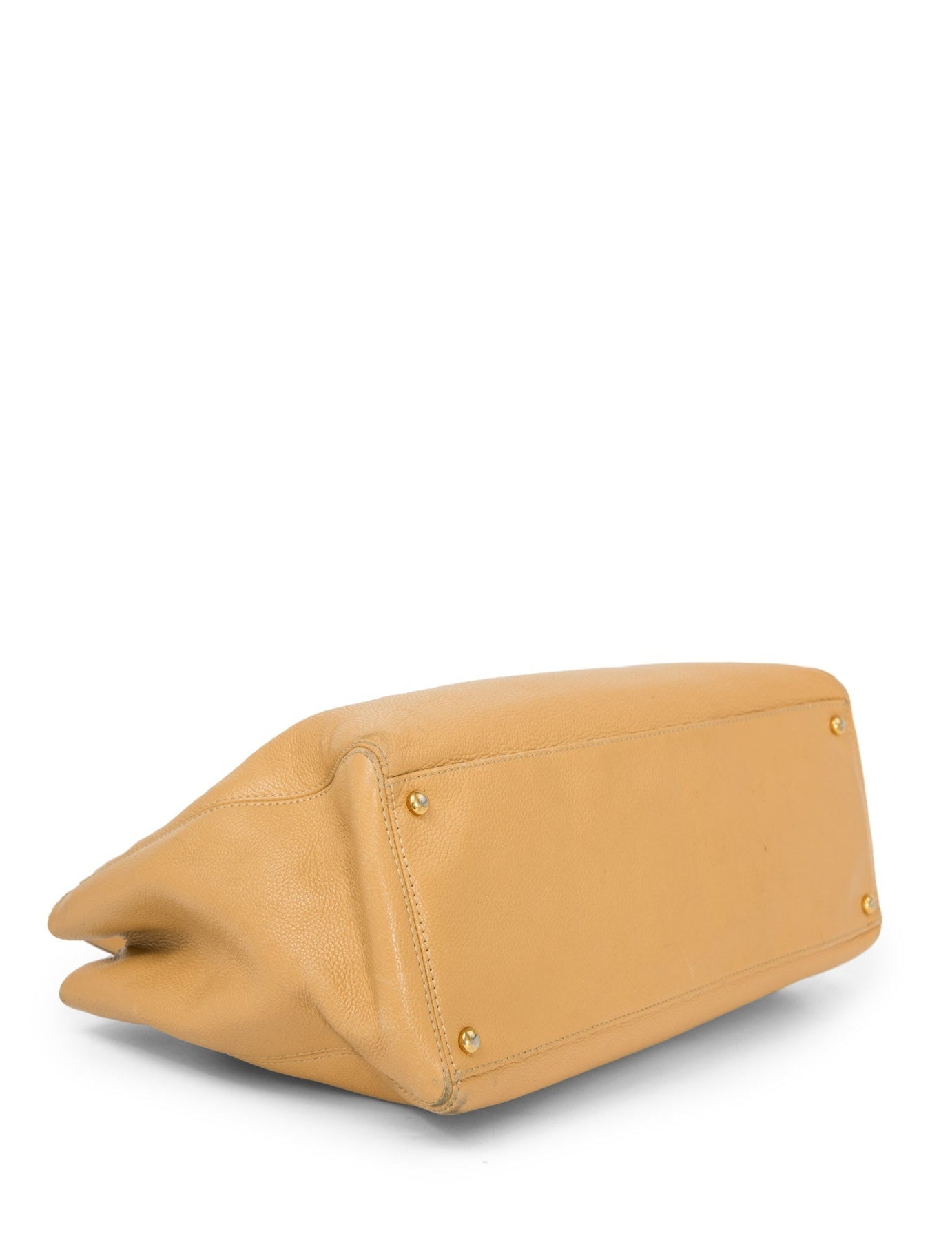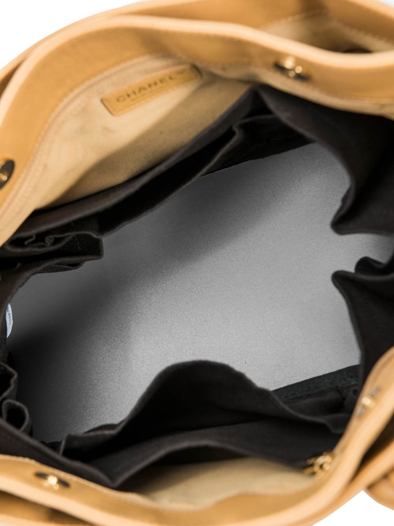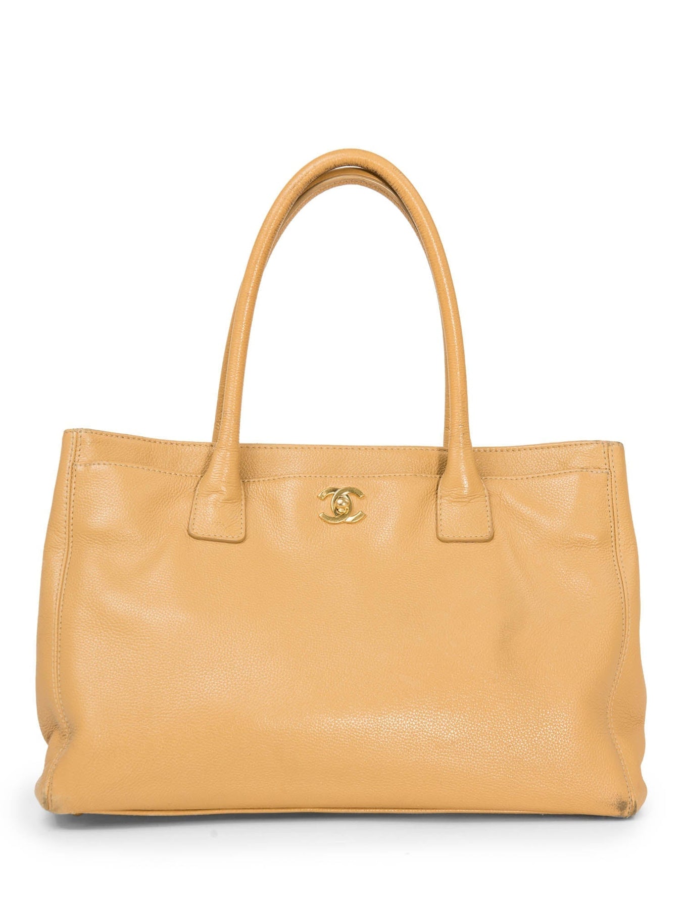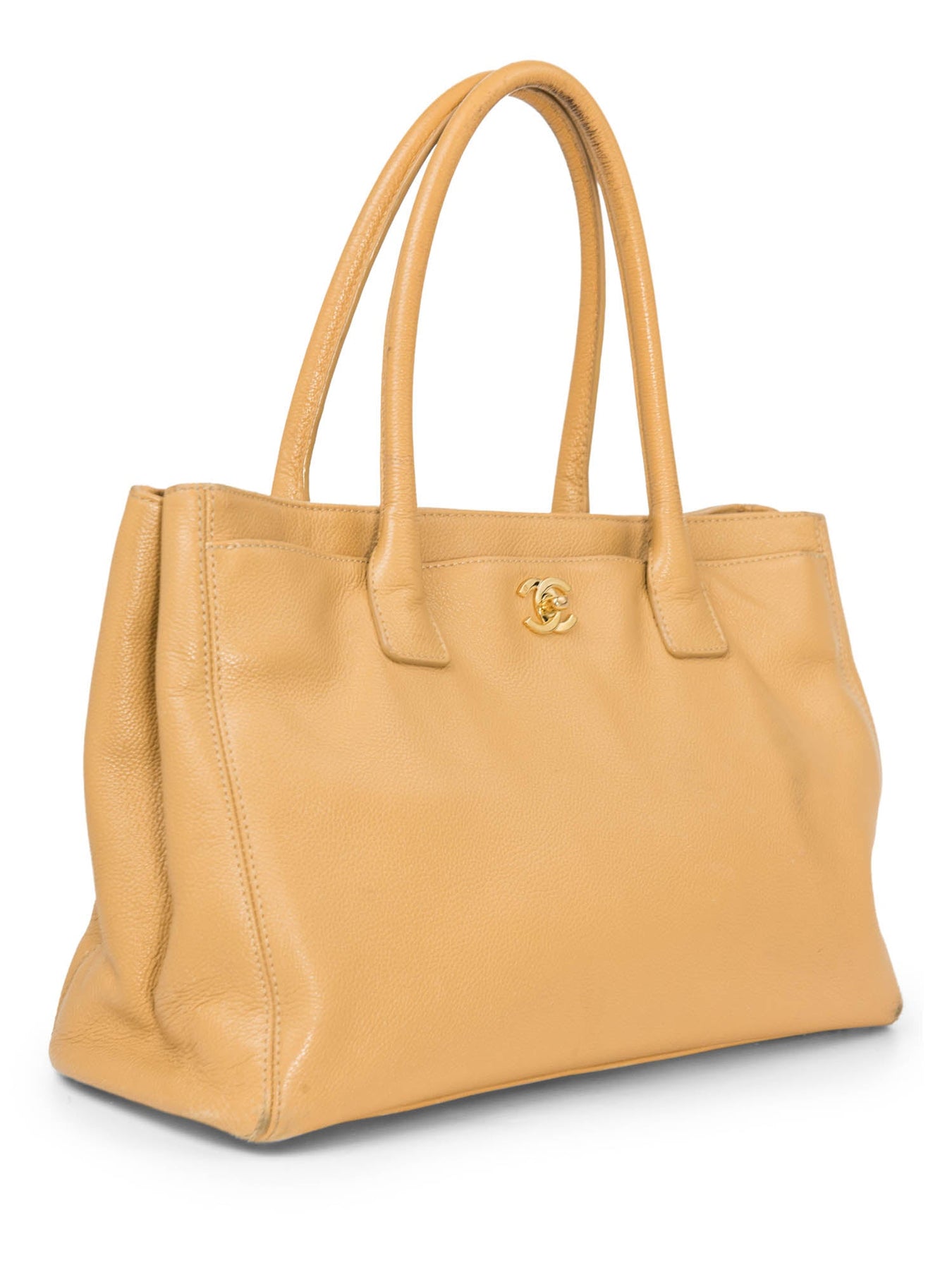 CHANEL CC Logo Leather Cerf Tote or . This Chanel bag is in beige leather with gold hardware and features rolled leather top handles, a large patch pocket sealed with a gold Chanel CC twist lock closure and a matching interior to compliment the exterior with zipped pockets.