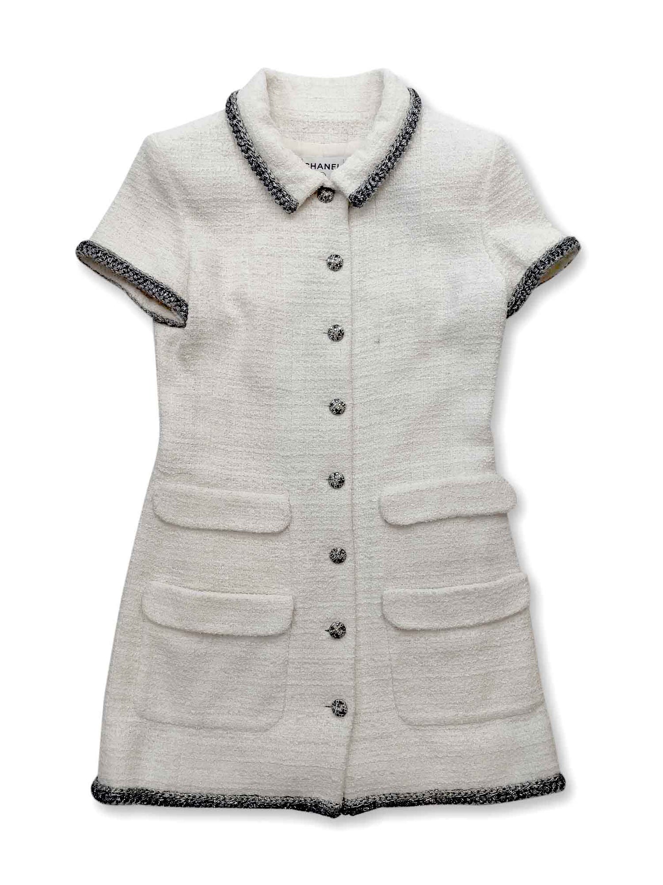 Chanel Dress or . This dress in in white lesage tweed with silver braided fringe trim. It features a  structured collar, CC logo Gripoix buttons, 4 front pockets, and a white silk lining.