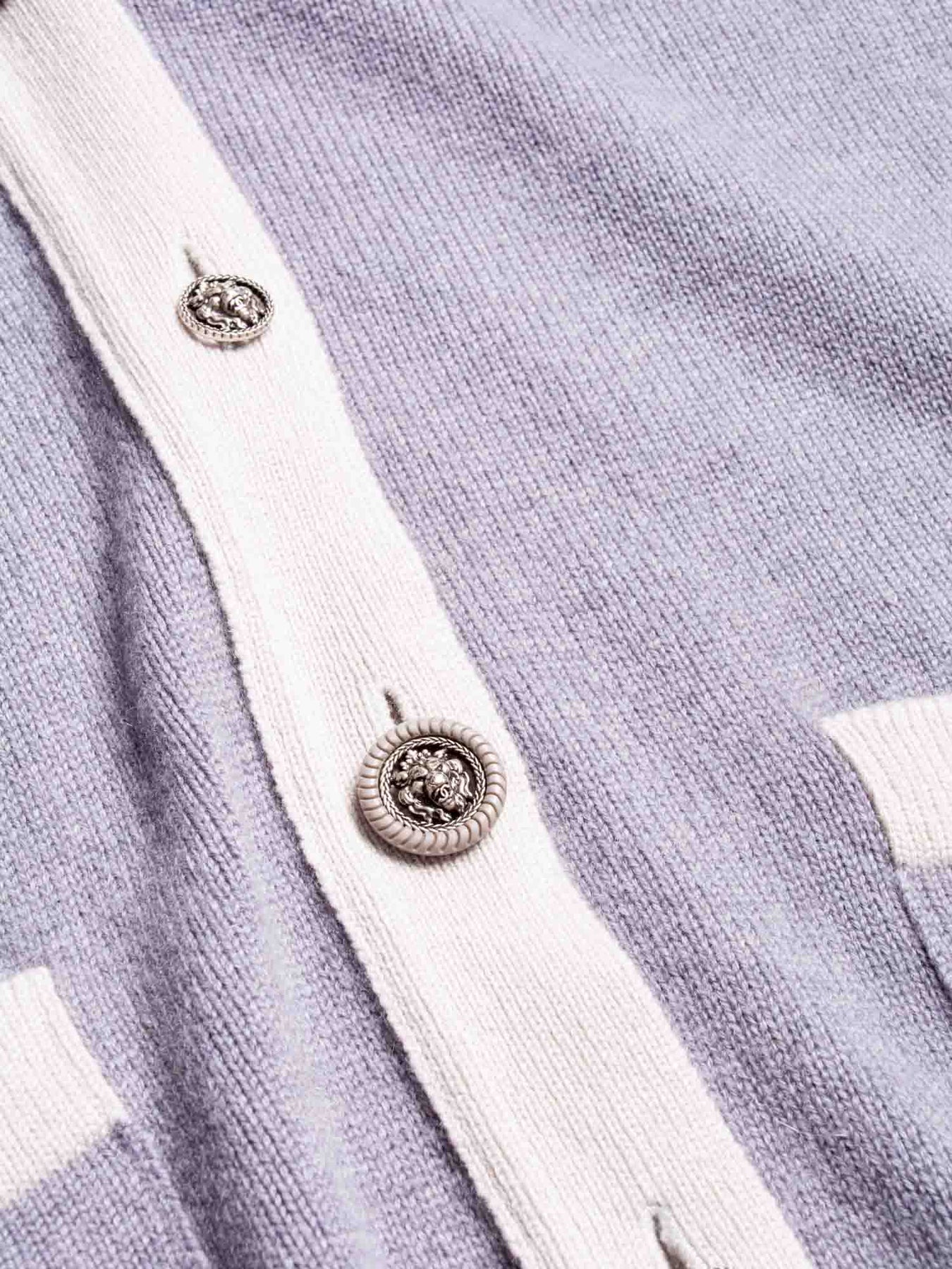 Chanel Cardigan or . It is in a soft cashmere fabric, featuring two frontal buttoned pockets, and buttons with CC logos and lion heads.
