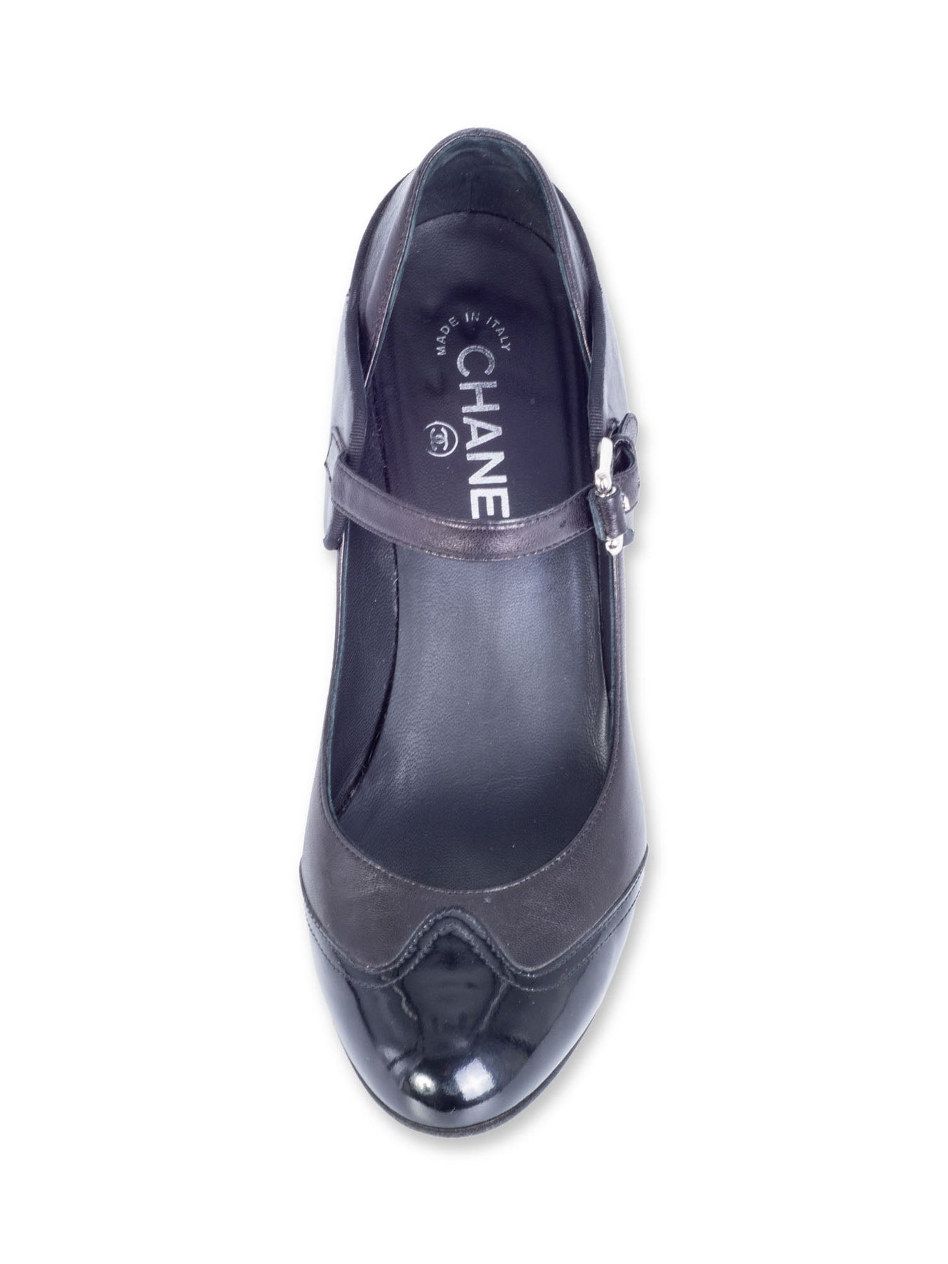 CHANEL CC Logo Mary Jane Block Heels or . These CHANEL heels are in smooth black leather with patent leather cap toe featuring block heel, silver tone hardware and classic mary jane silhouette. They feature CC logo on the heel and adjustable strap with a buckle.
