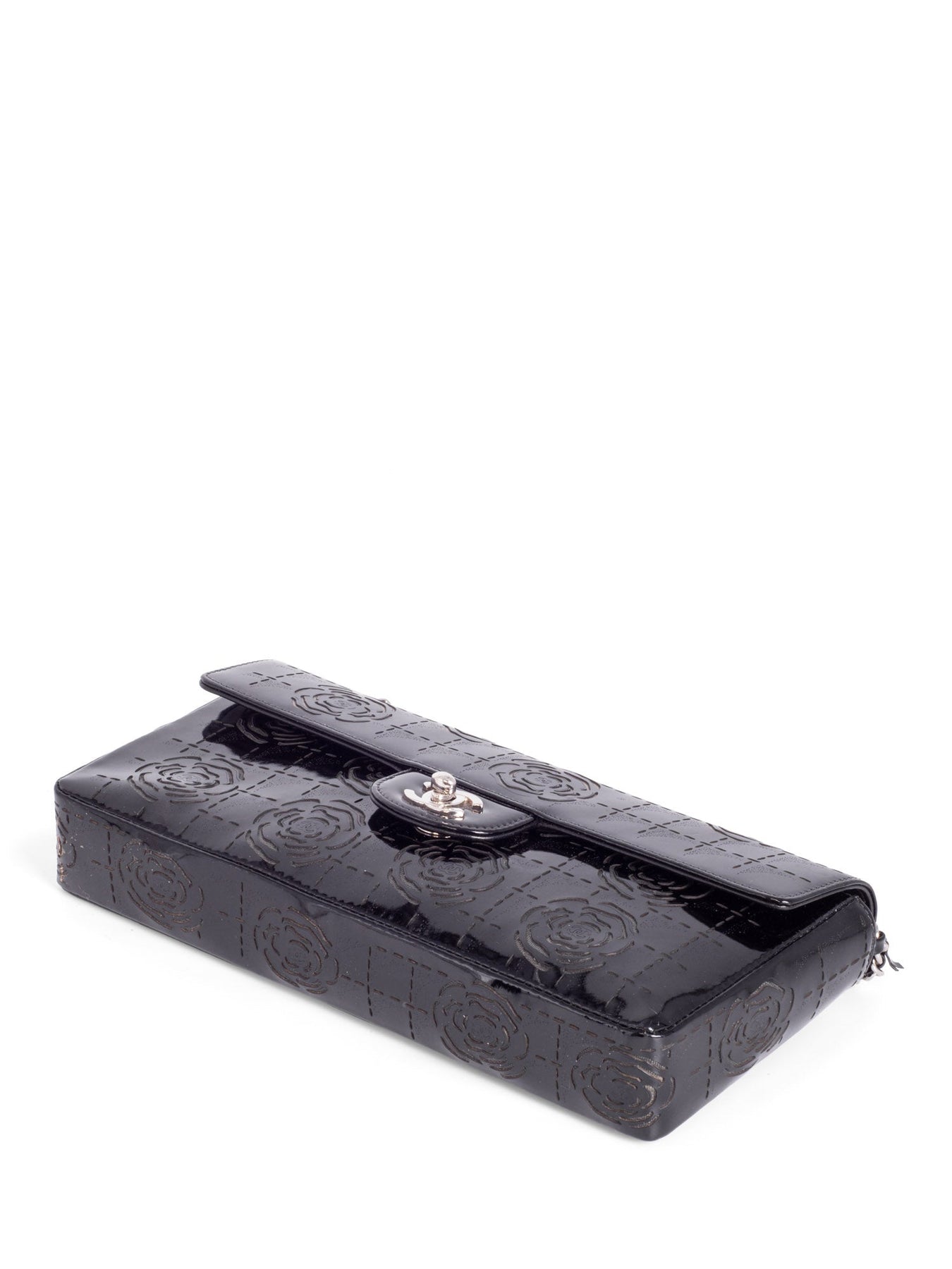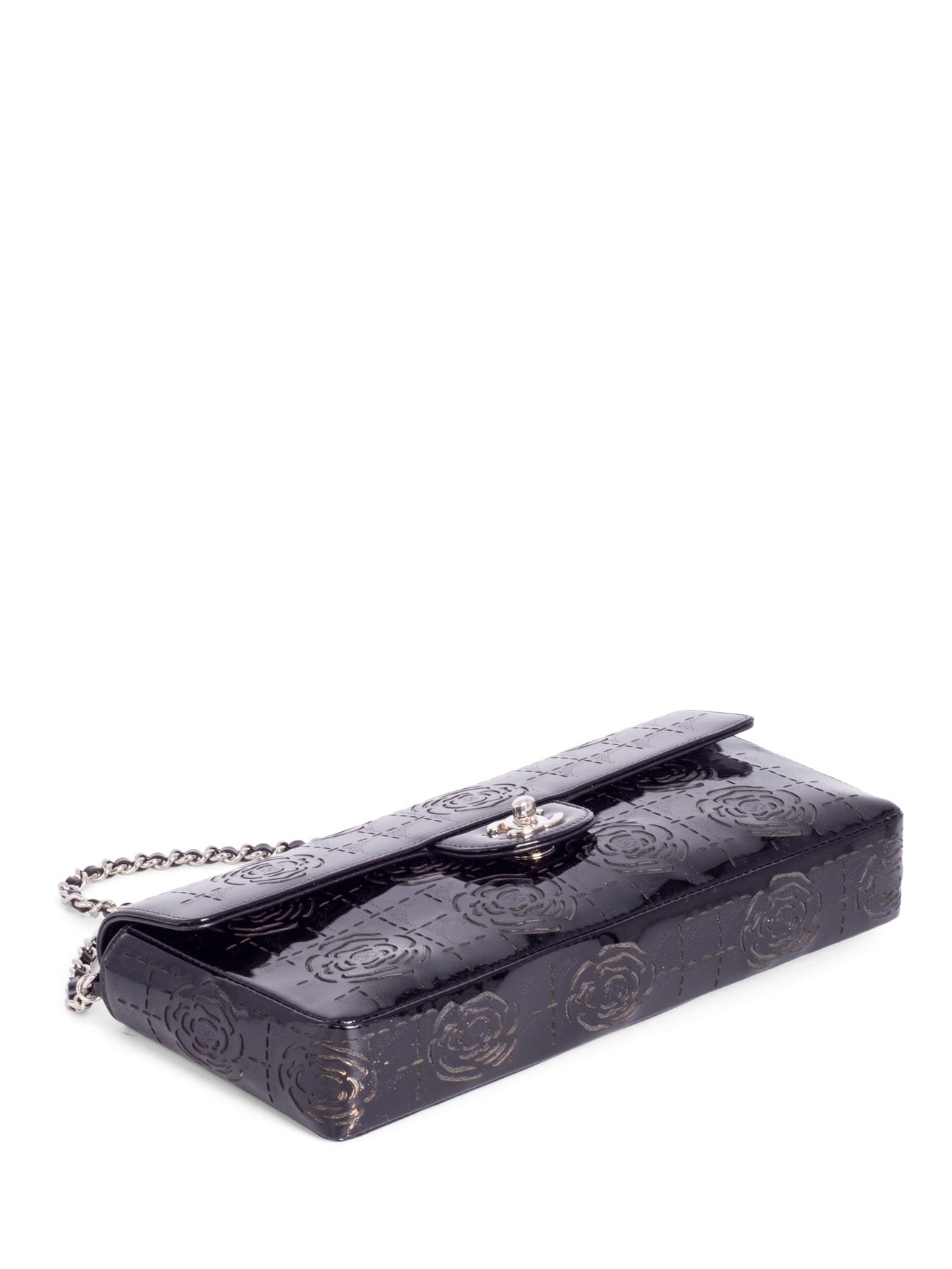 Chanel Flap Bag or . It is in black patent leather with embossed camellia flowers. It features a prominent silver-tone CC logo on the front, single silver chain and two inner pockets.