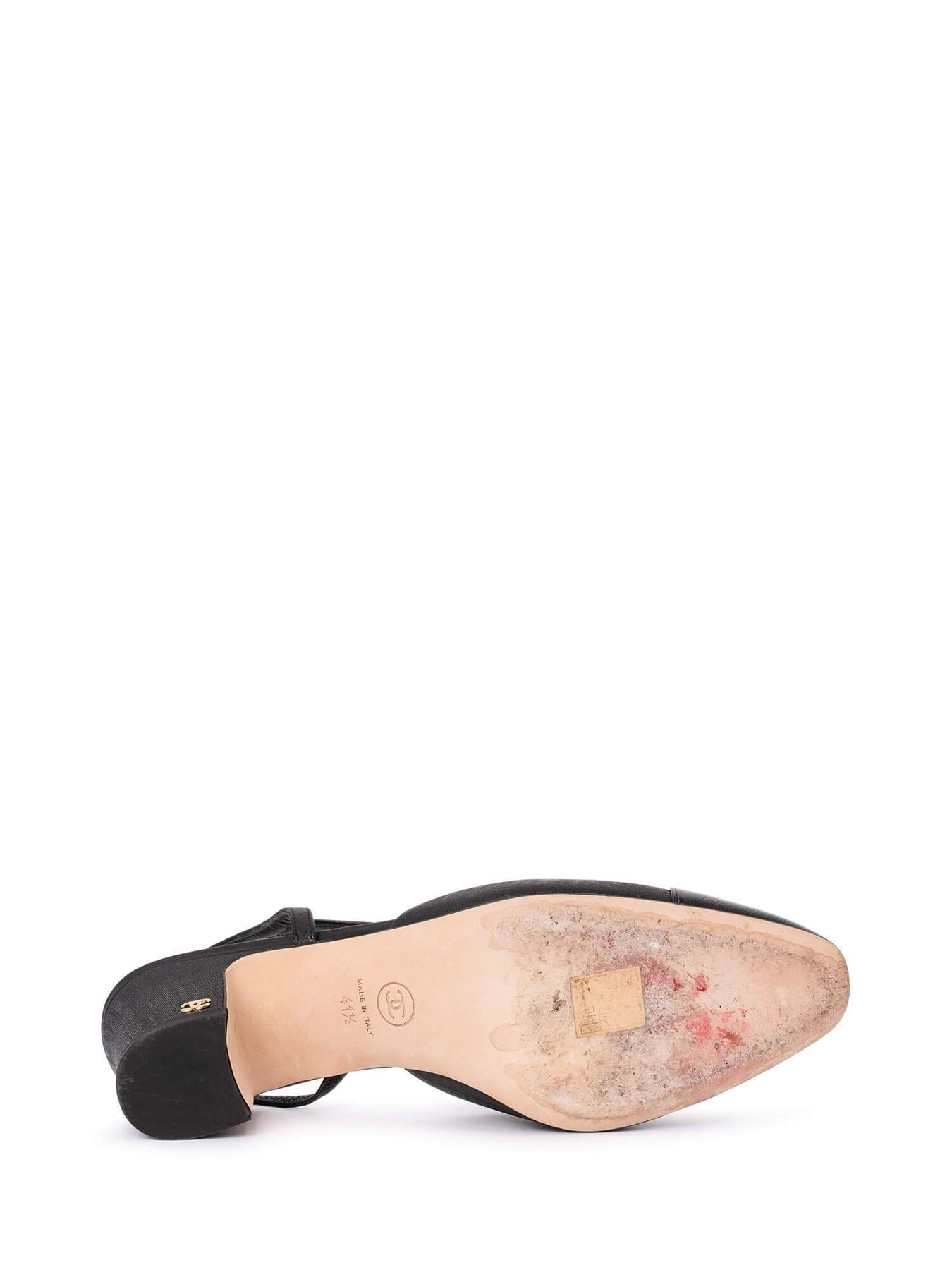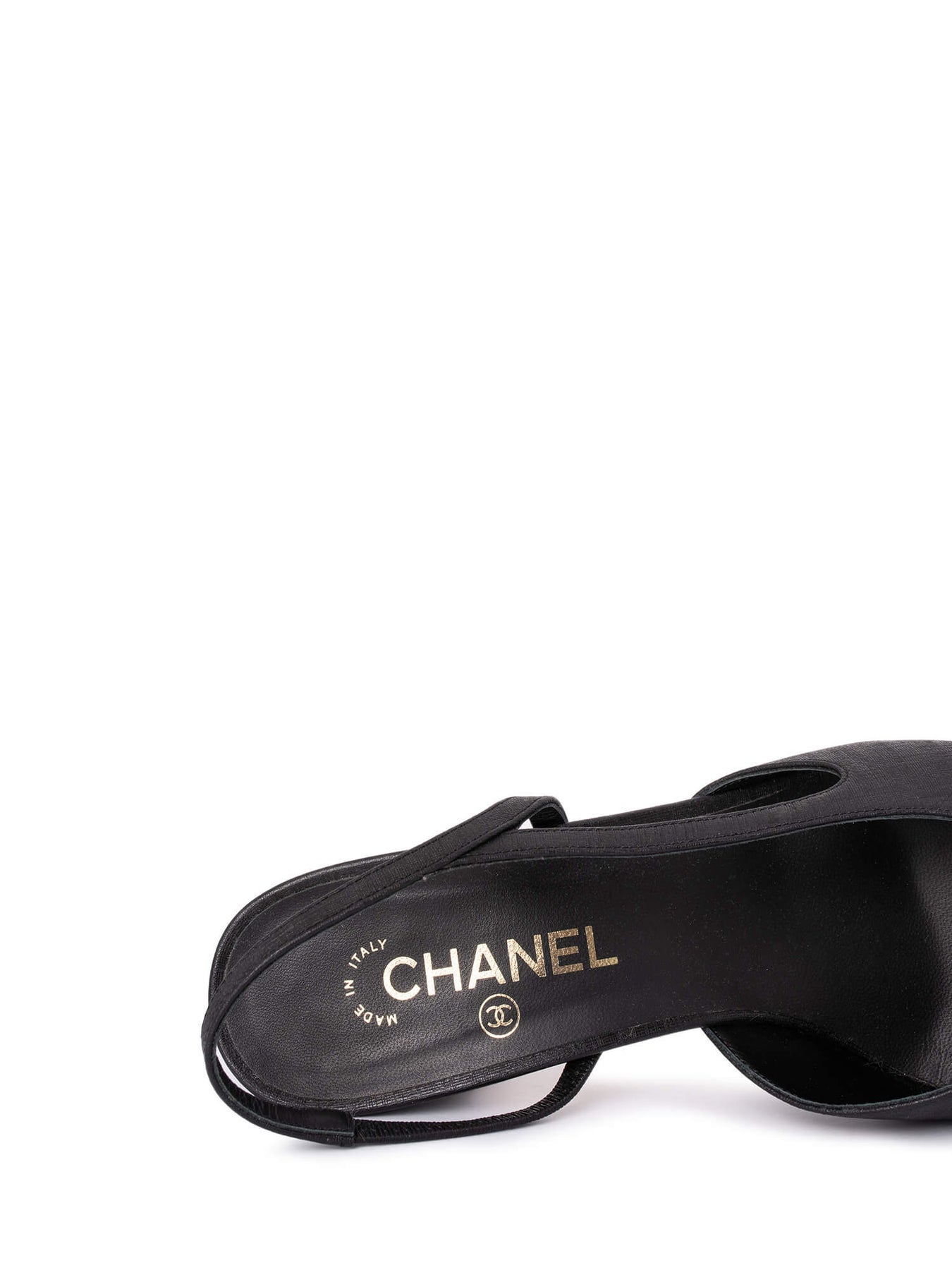 Chanel CC Logo Pump Shoe or . These shoes are in black patent and stamped leather and feature a gold CC logo on the heel.