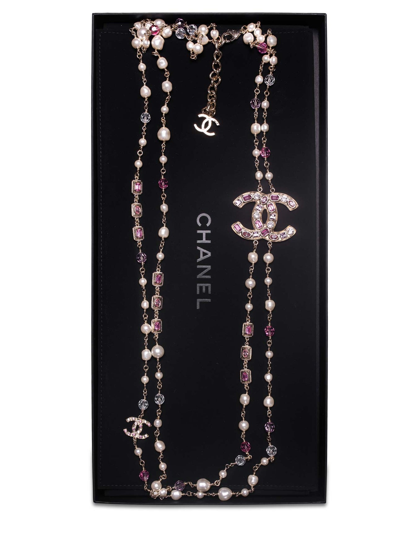 Chanel CC Logo Pearl Crystals Long Necklace, or . This necklace features multi sized double strand pearls, with Swarovski crystals, and gold chainlink hardware. It has double CC logos and a clasp closure.