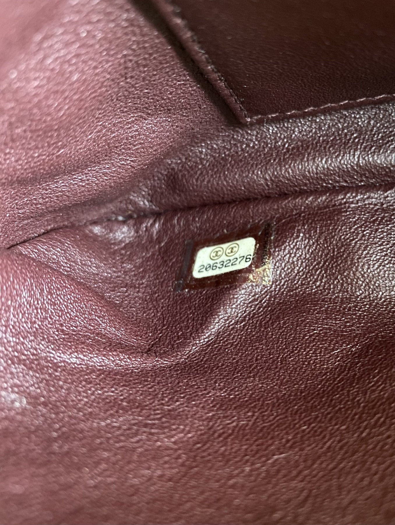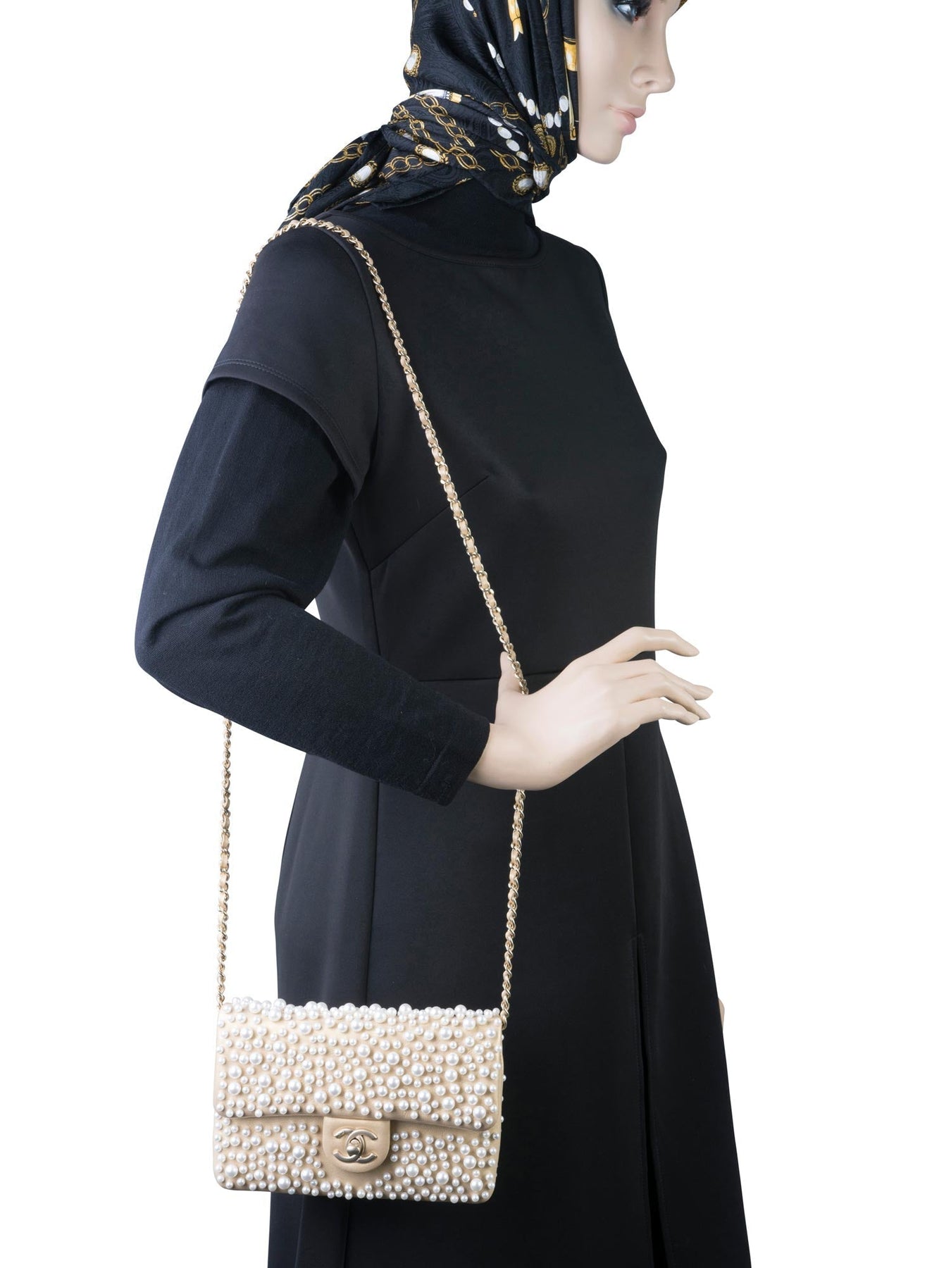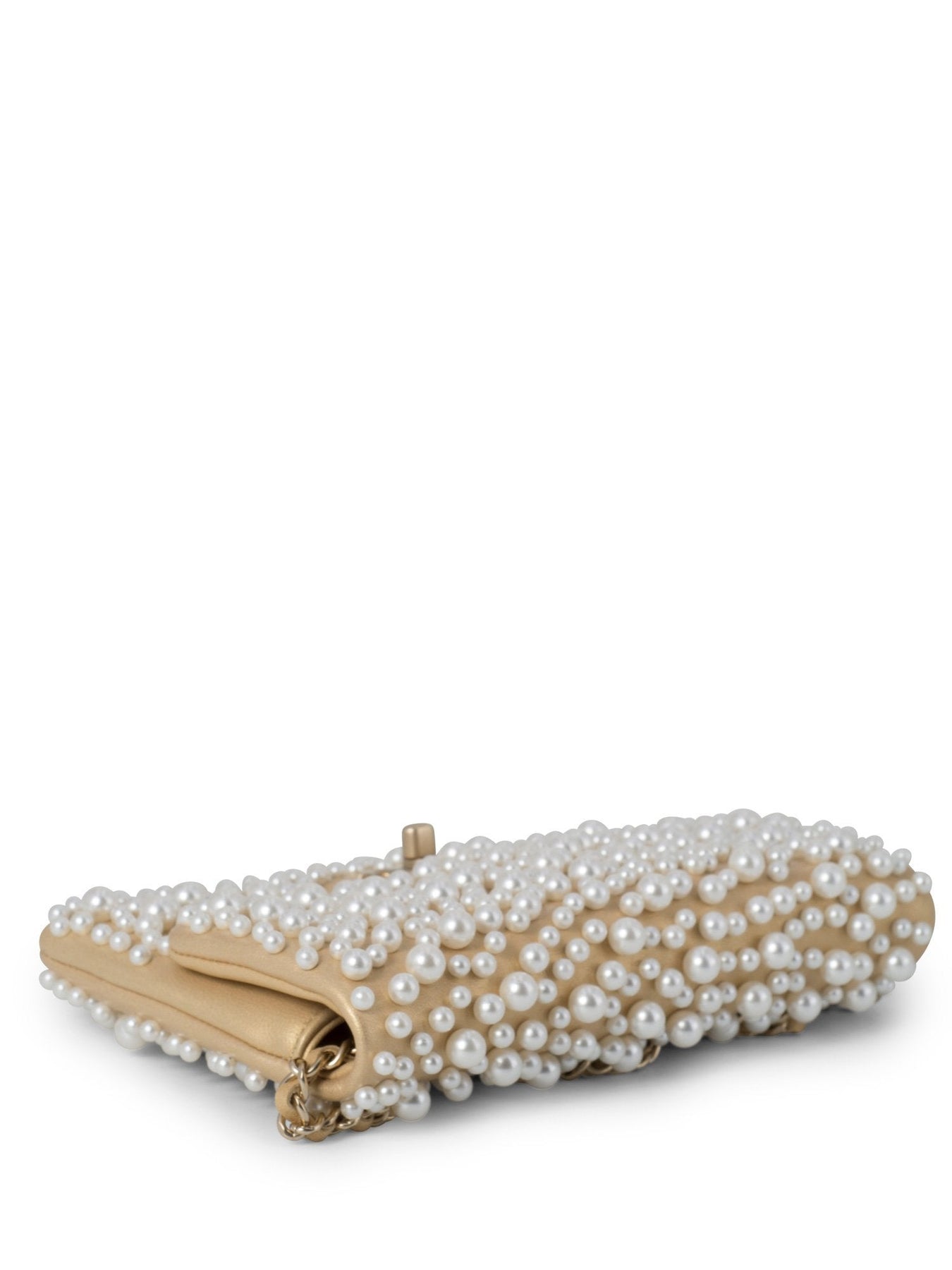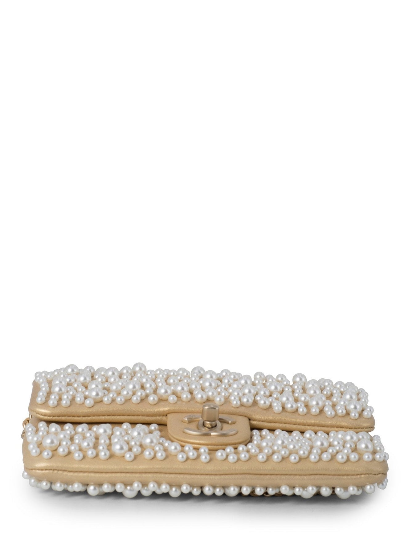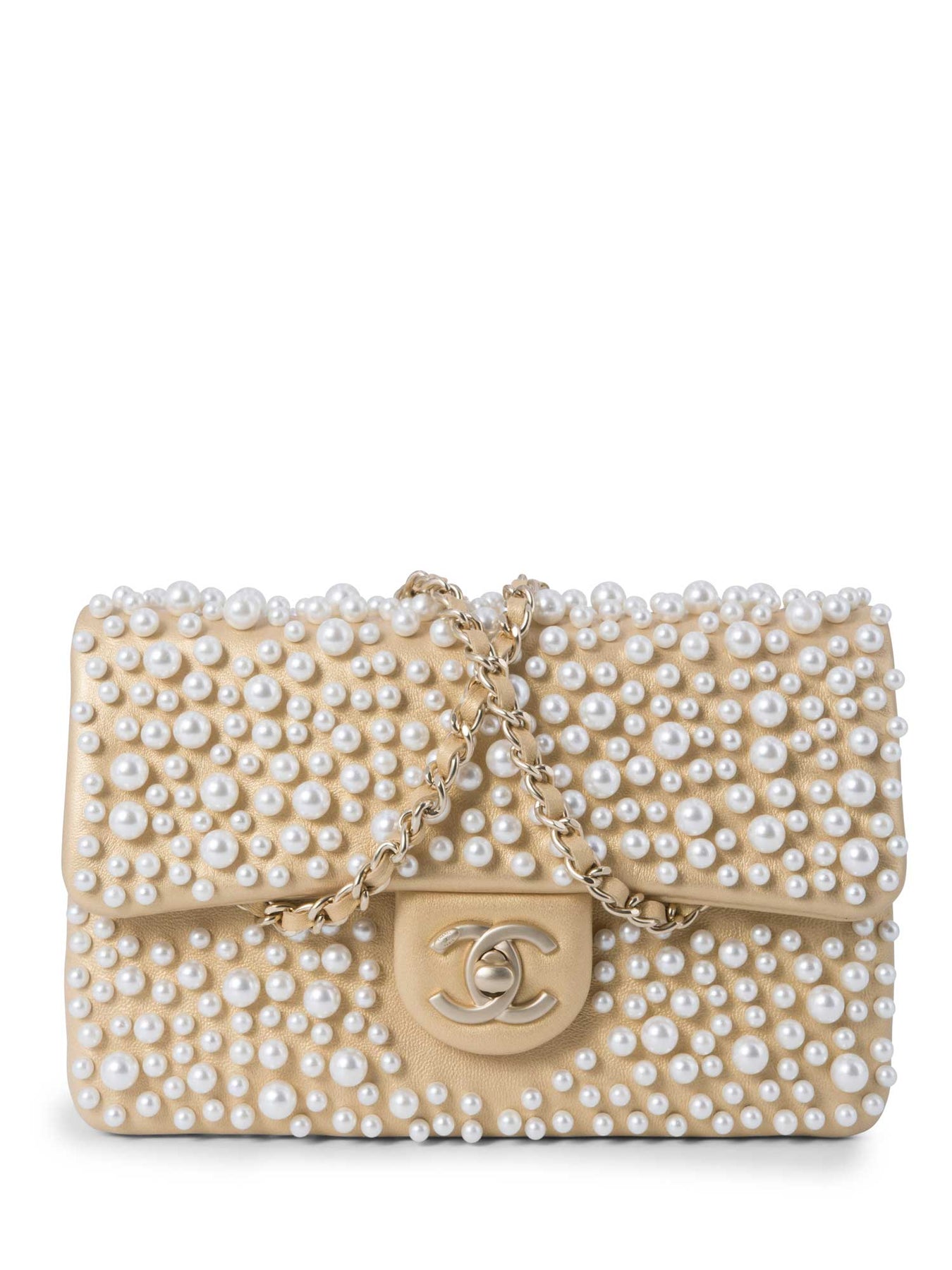 Chanel Pearl Flap Bag or . This bag is in gold-toned leather with white pearls all around to compliment the exterior. The bag features a gold chain that can be used as a shoulder bag or crossbody, a CC logo turn lock closure. It opens to a burgundy leather interior with one open interior pocket.