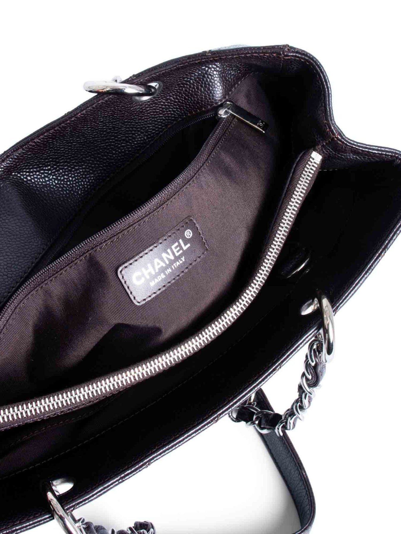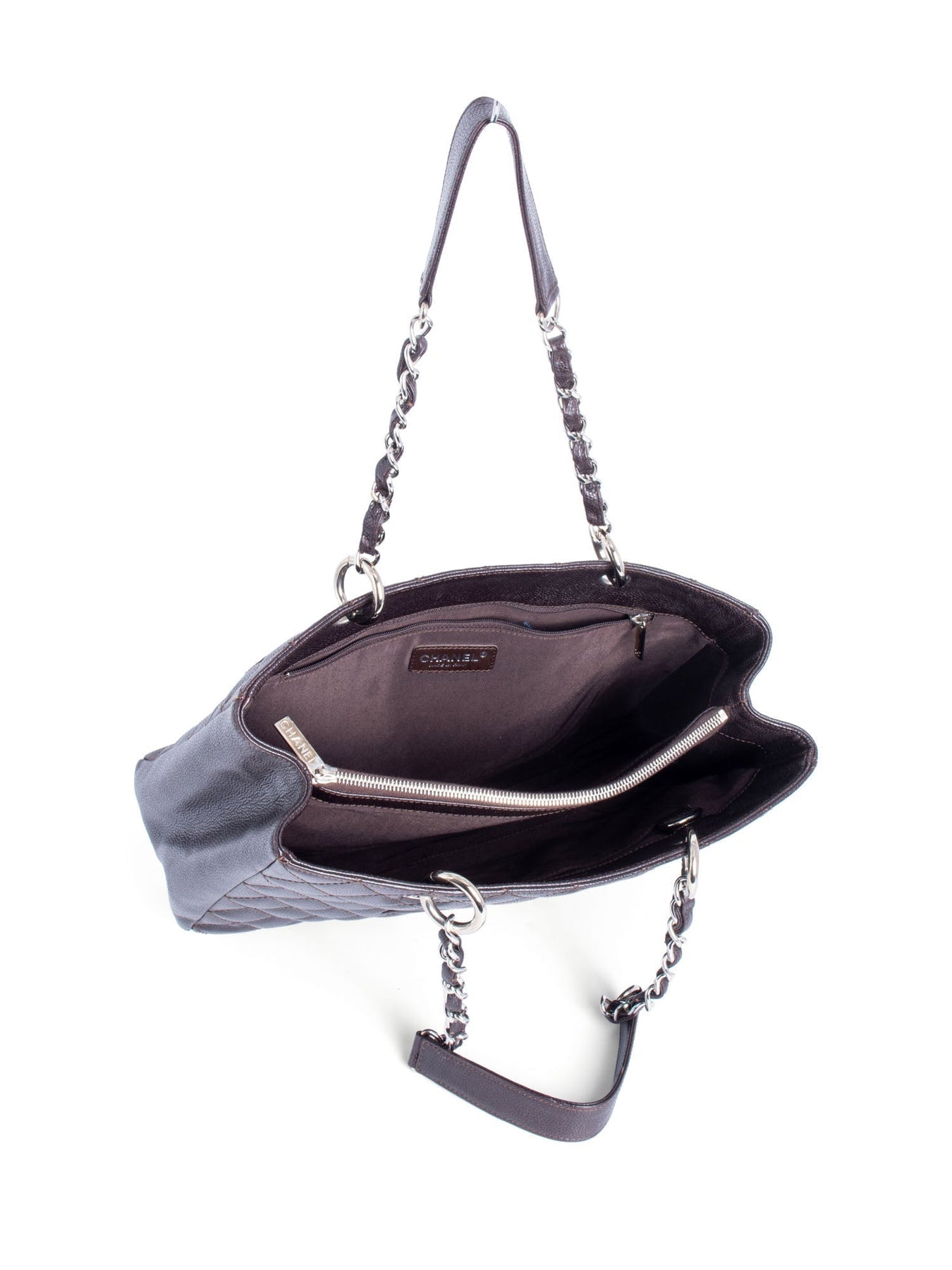 Chanel Caviar Quilted Shopper Bag or . It is in brown quilted caviar leather with silver hardware, a frontal CC logo, a large back pocket and silver chain shoulder straps. This bag opens to a very spacious dark brown canvas interior with two zippered pockets and one slip pocket.