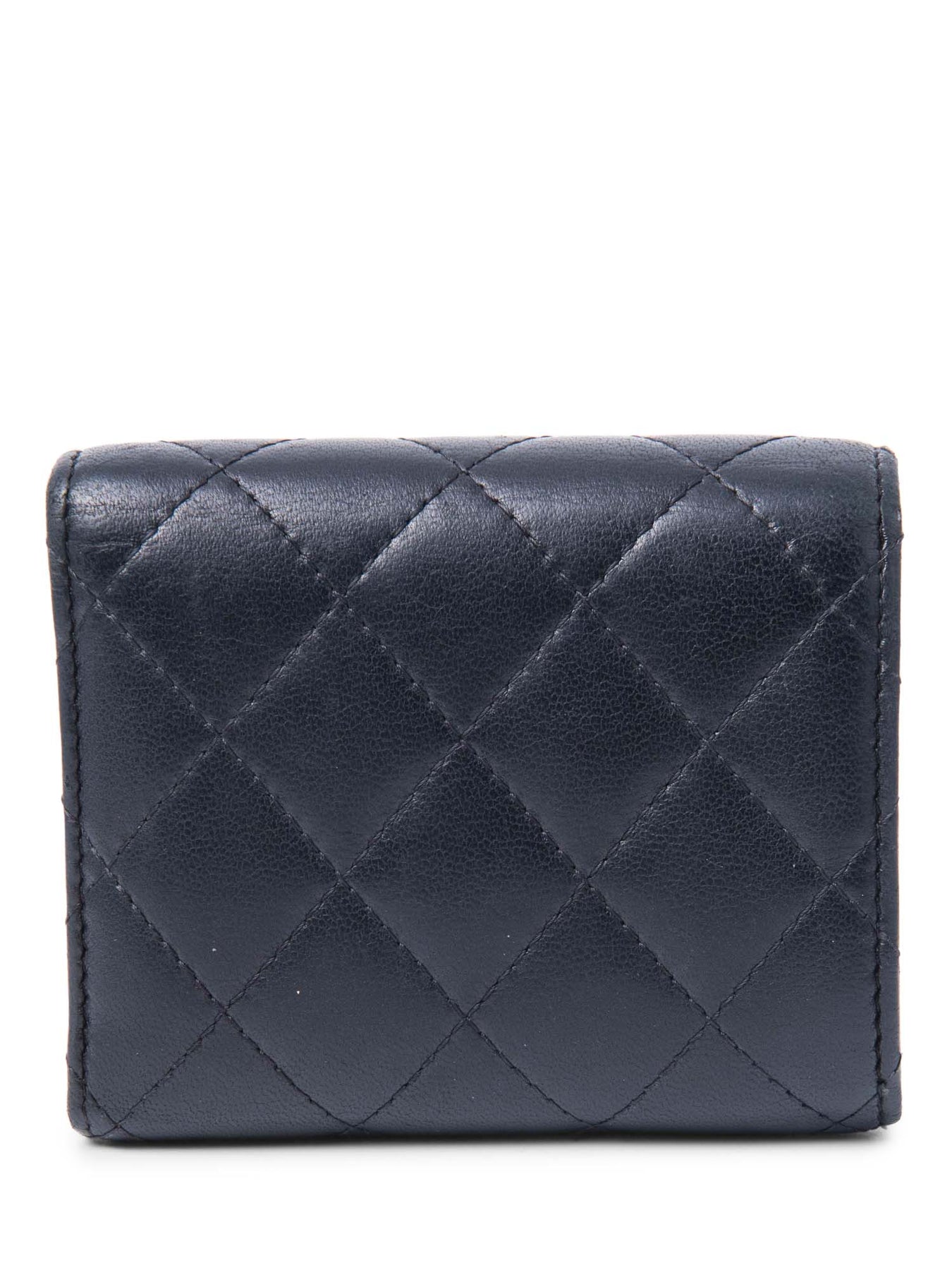 CHANEL CC Logo Quilted Compact Wallet or . This CHANEL wallet is in black leather with gold tone hardware. This wallet has a zippered closure with leather zipper pull. It opens to black leather interior with graphic canvas and features one card slot and, two patch pockets, and 4 card slots.