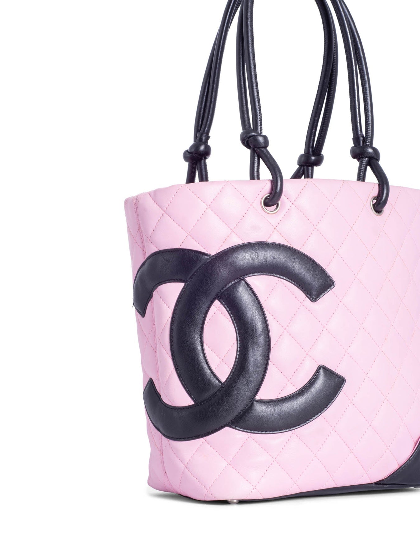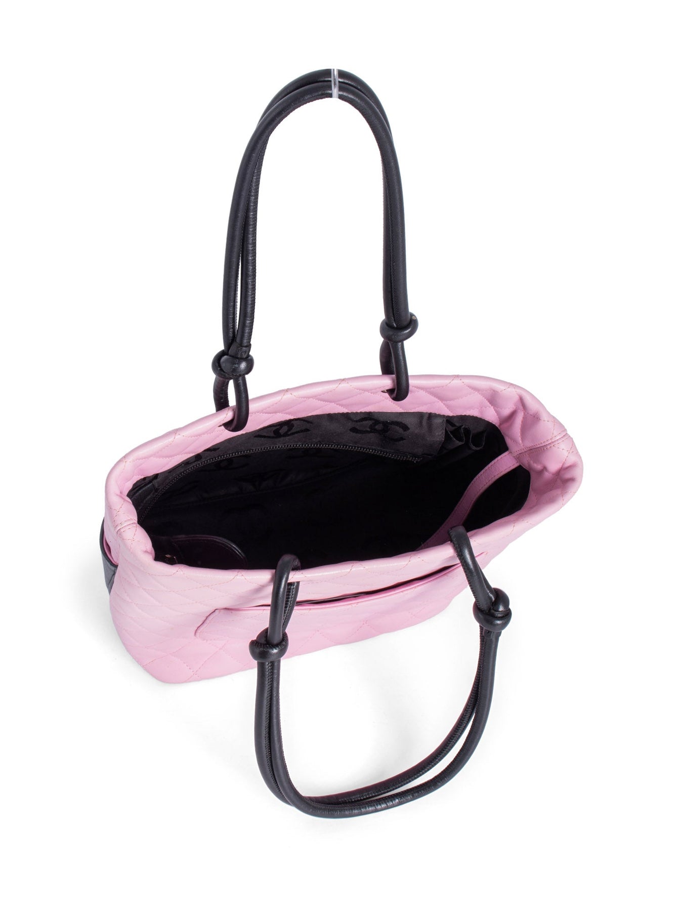 Chanel Tote or . This Chanel tote is in pink quilted lambskin leather from their signature "Cambon" collection, featuring a prominent CC logo on the front in black leather, back open pocket and top zipper closure. The interior is lined in black canvas to compliment the exterior.