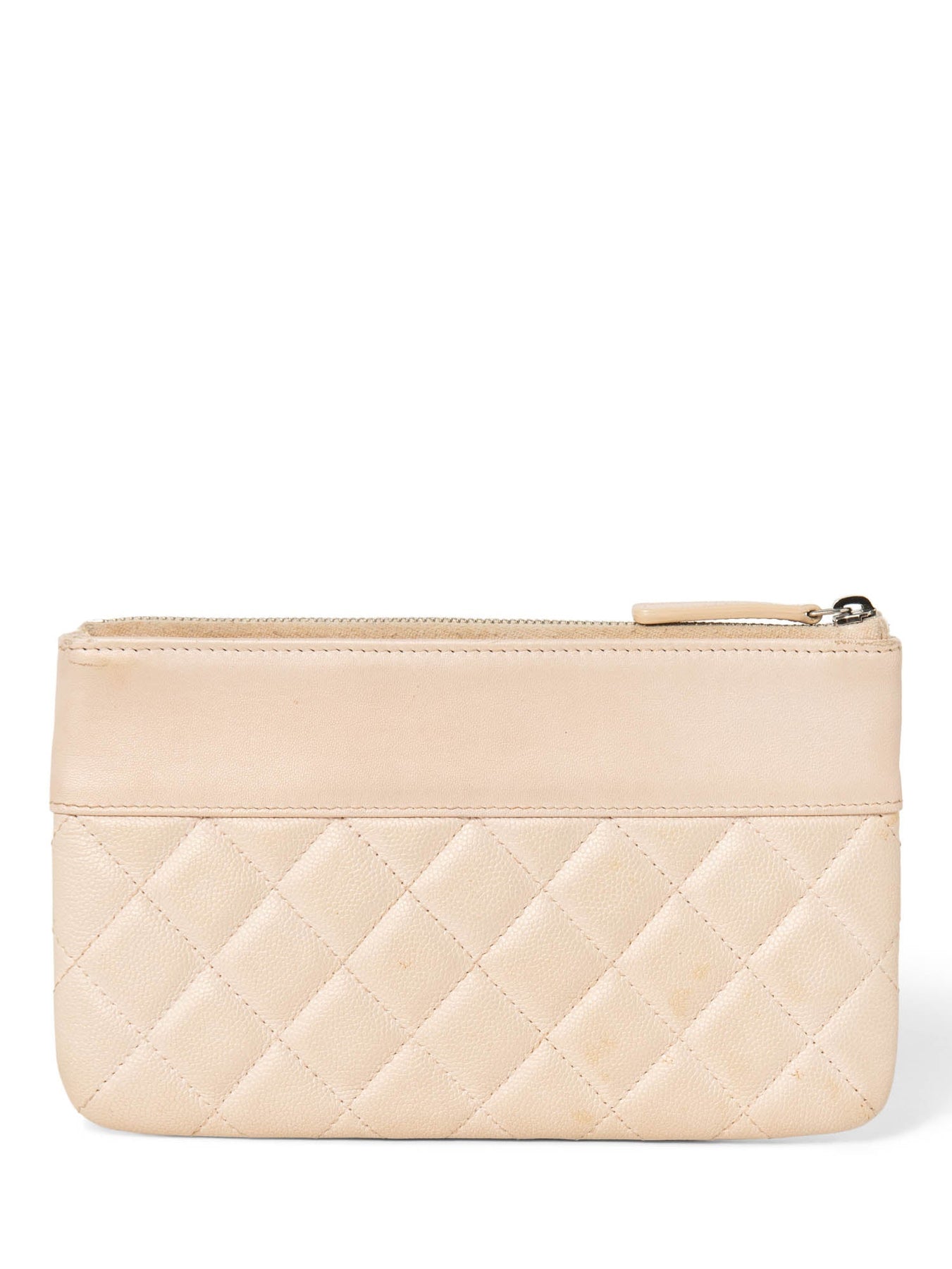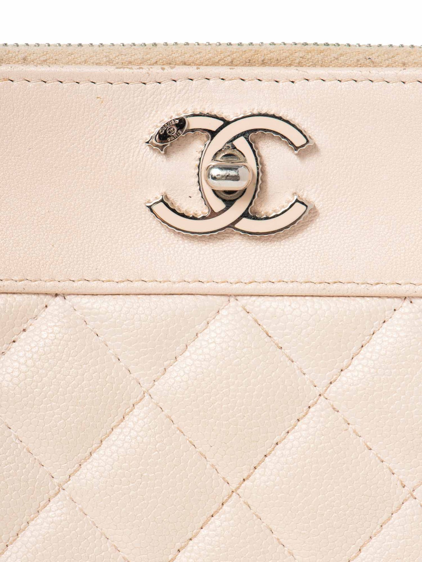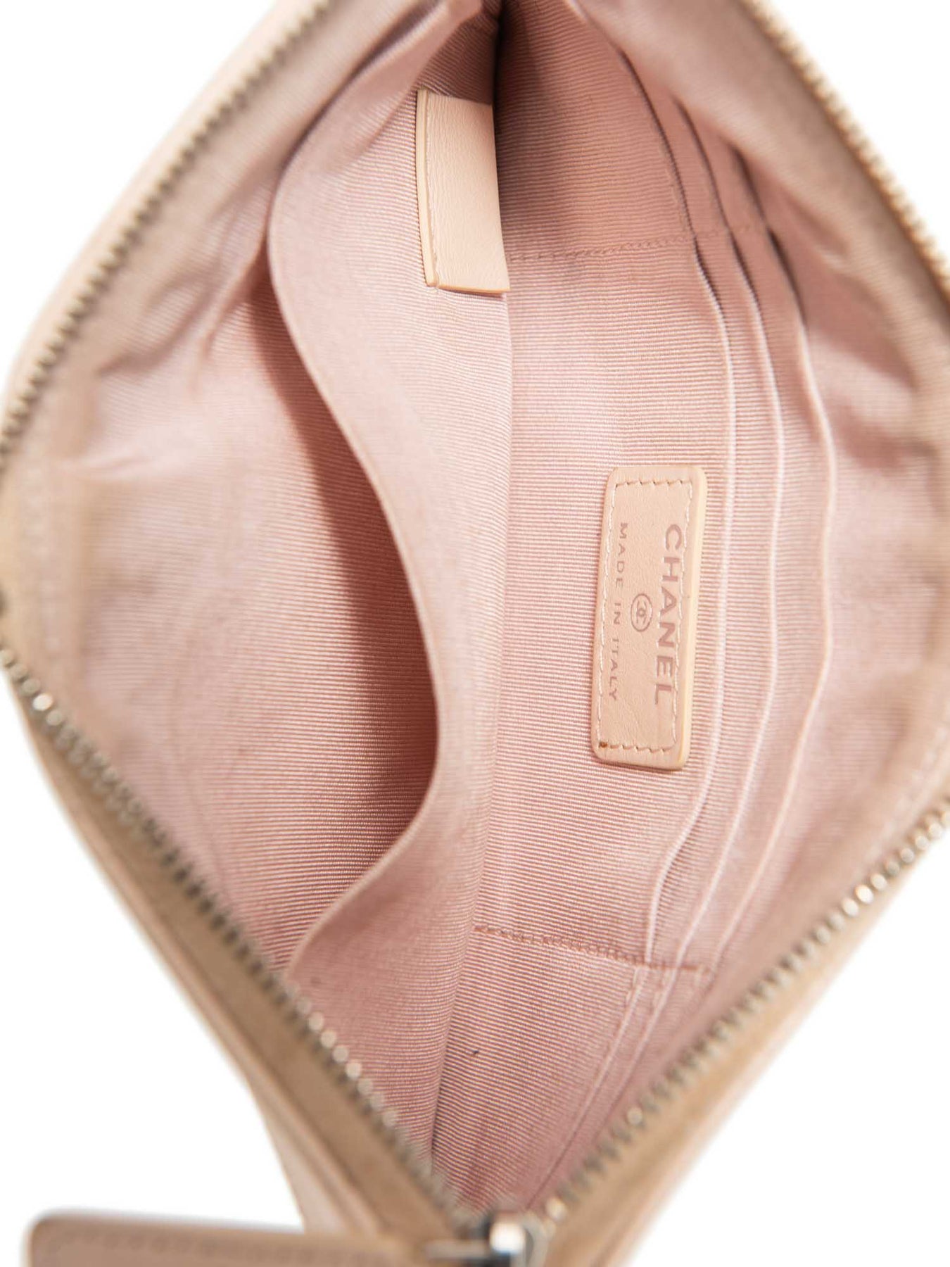 CHANEL CC Logo Leather Clutch or . It is in quilted blush pink leather with silver tone hardware. It features the signature CC logo with a top zipper closure. The clutch opens up to pink canvas lined interior with several pockets for easy storage.