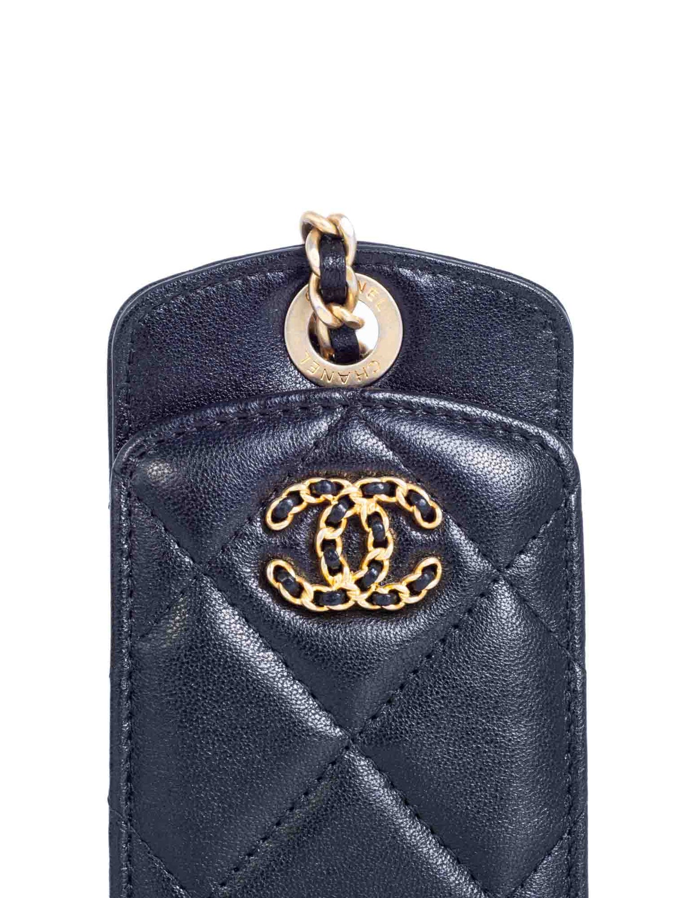 CHANEL CC Logo Quilted Leather ID Holder or . It is crafted in black leather featuring quilting throughout and CC logo on the front. It opens with a snap closure to two patch pockets. It comes with a detachable chain that loops through the wallet.