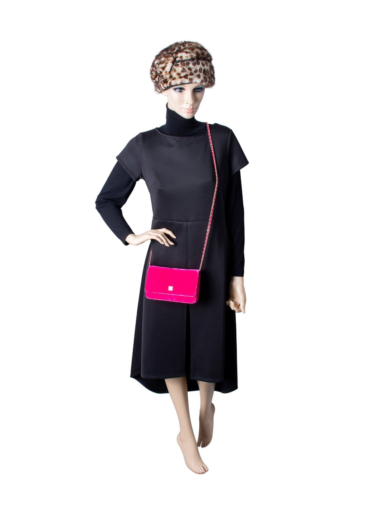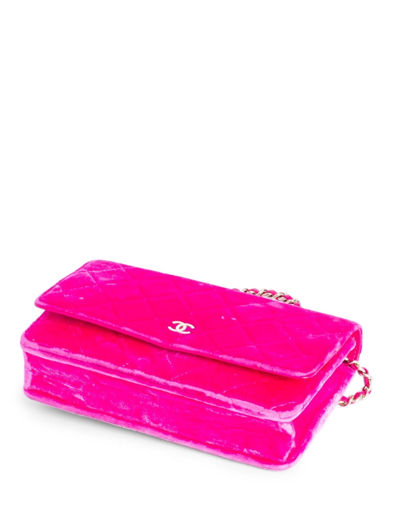 CHANEL CC Logo Messenger Wallet on Chain or . This bag is in quilted velvet with gold toned hardware. It features a CC logo snap closure, gold chain, and a hot pink leather interior. This bag has two zipped pockets, two slip pockets, six card slots on the interior, and one rear pocket.