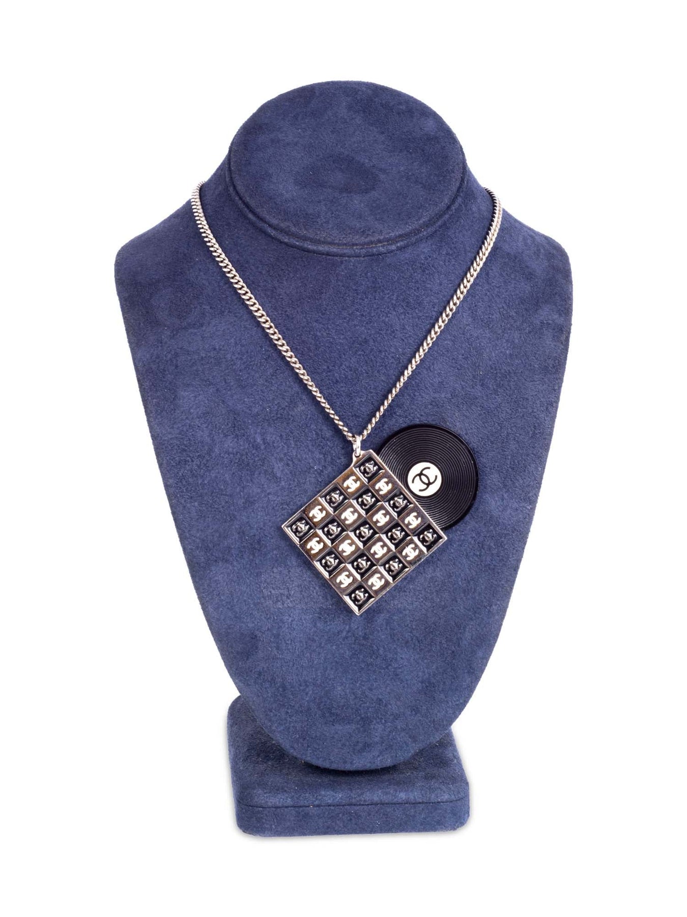 Chanel CC Logo Silver Necklace, or . This necklace features a vinyl record player with beautiful CC logos throughout multi sized double strand pearls, with Swarovski crystals, and gold chainlink hardware. It has double CC logos and a clasp closure.