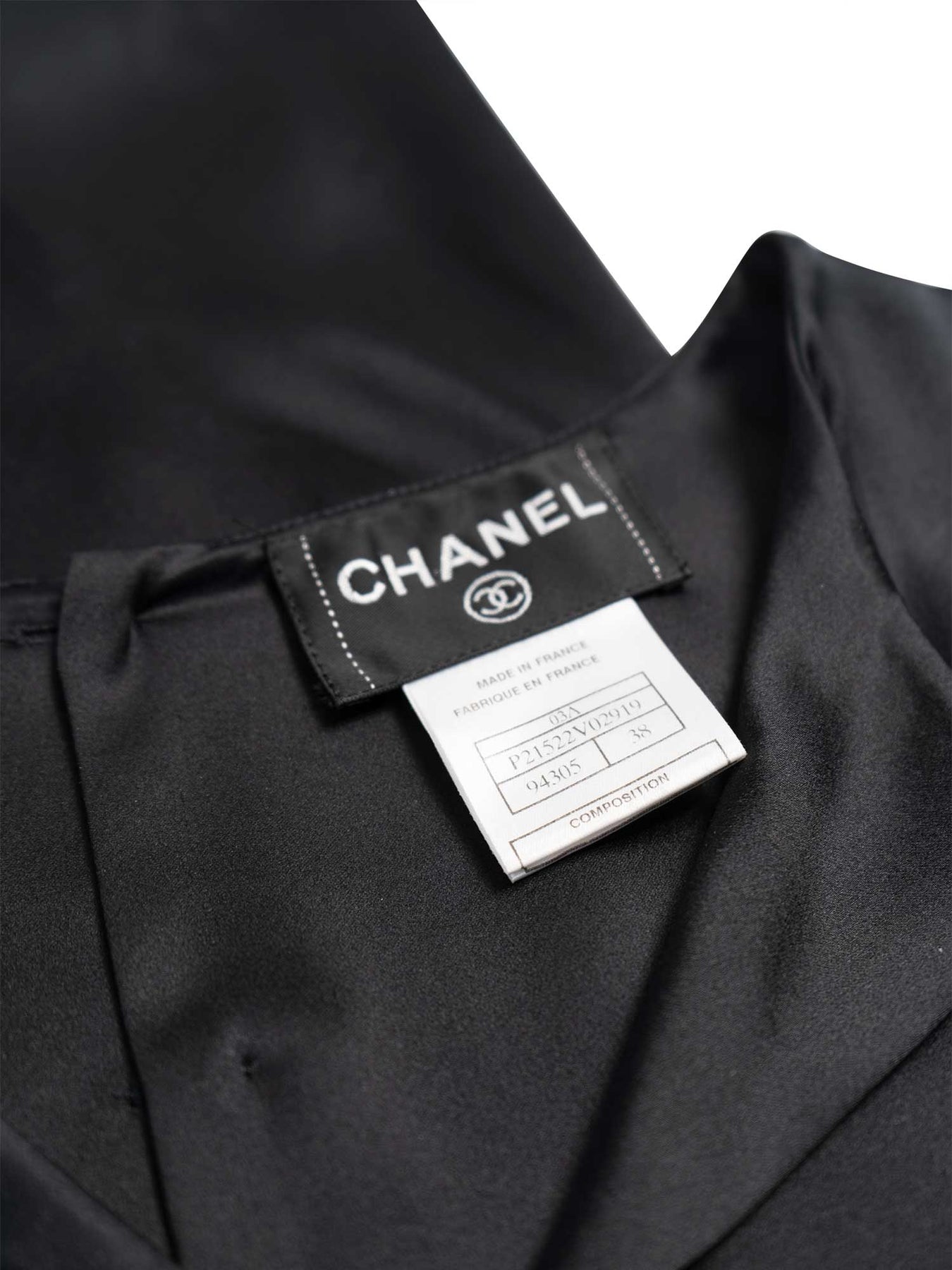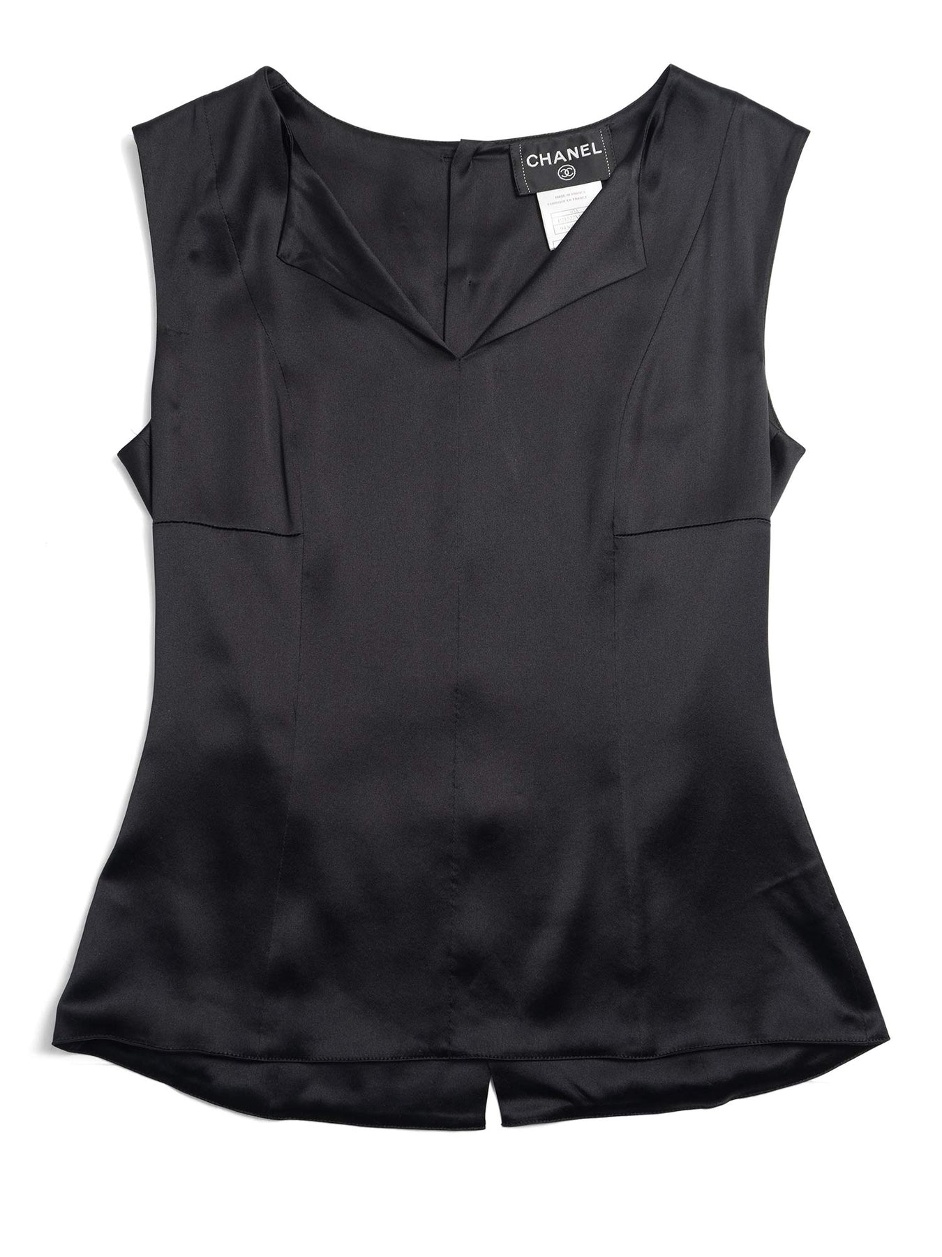 Chanel Blouse or . This sleeveless top features a black color made of the smoothest satin silk material. It has a v-neck front with beautifully crafted CC logo buttons on the back that acts as a rear closure.