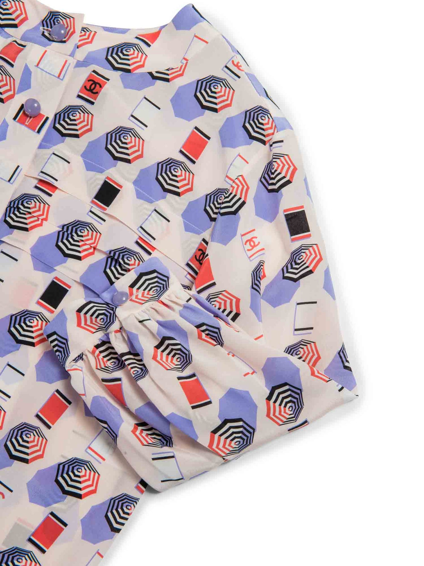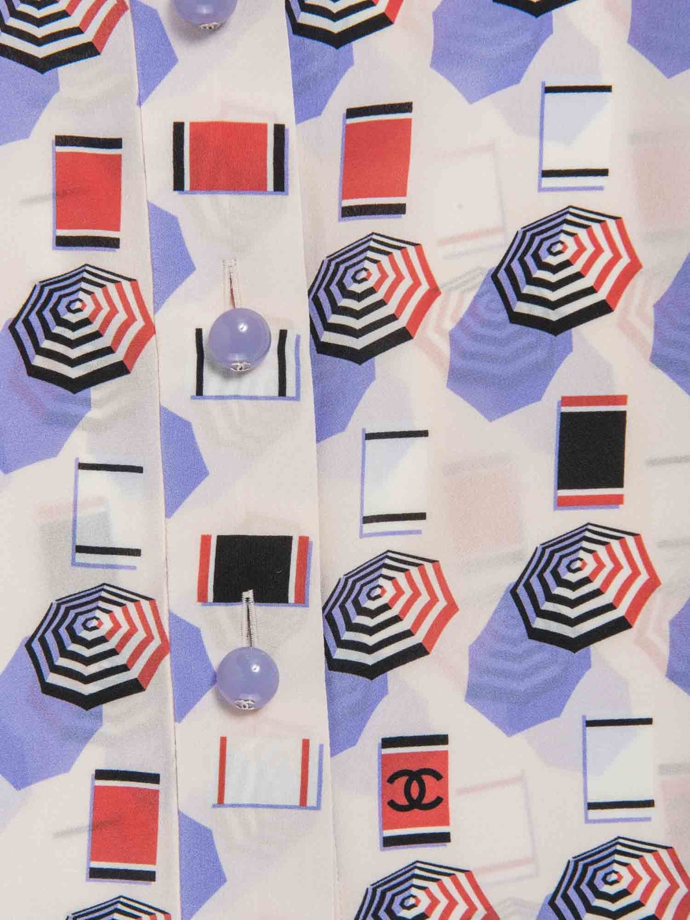 CHANEL Beach Blouse or . This CHANEL top is crafted in pink silk fabric that showcases a multicolor beach motif. It features purple opaque CC logo buttons and pleated embellishments on the chest and back.