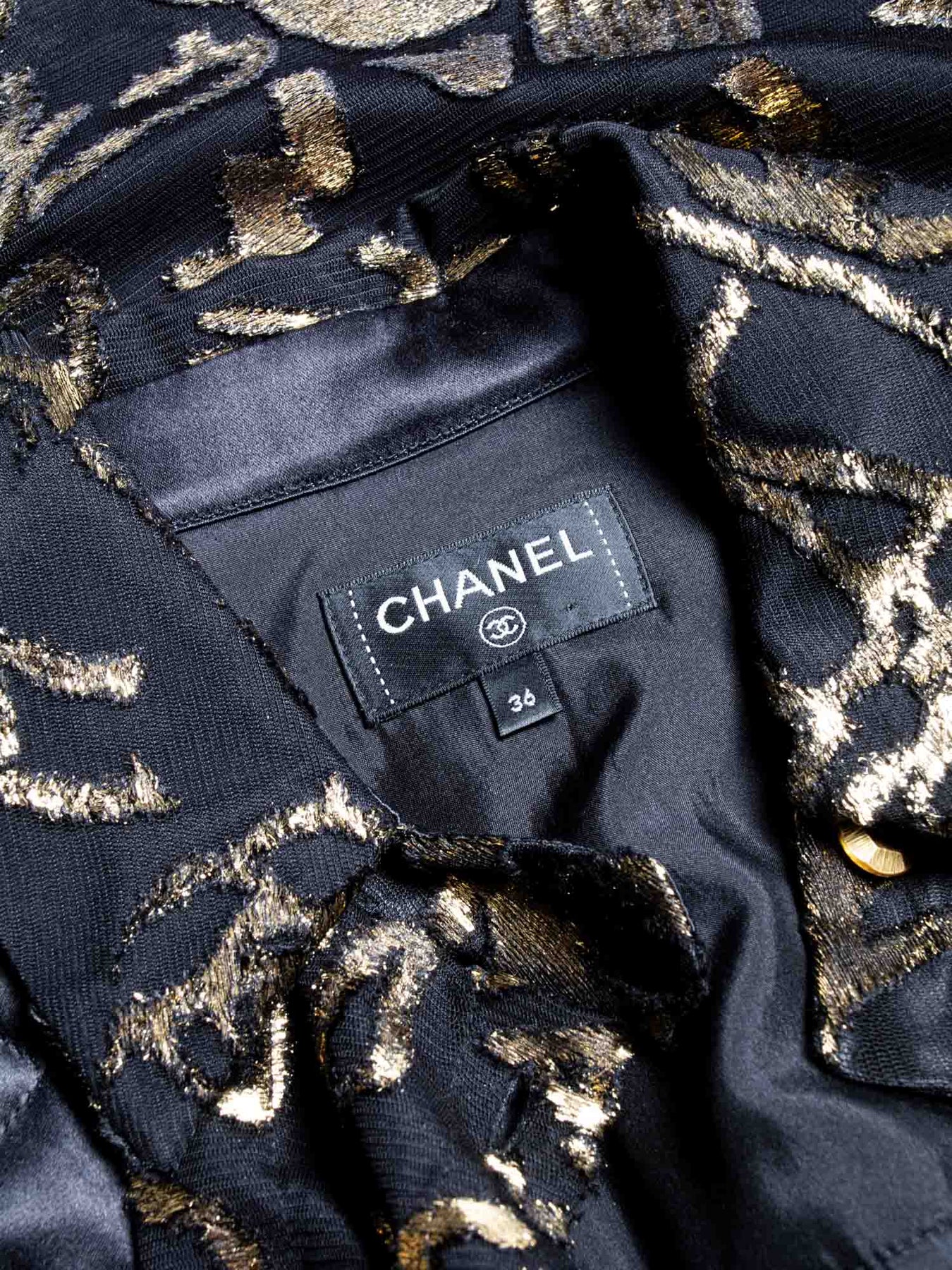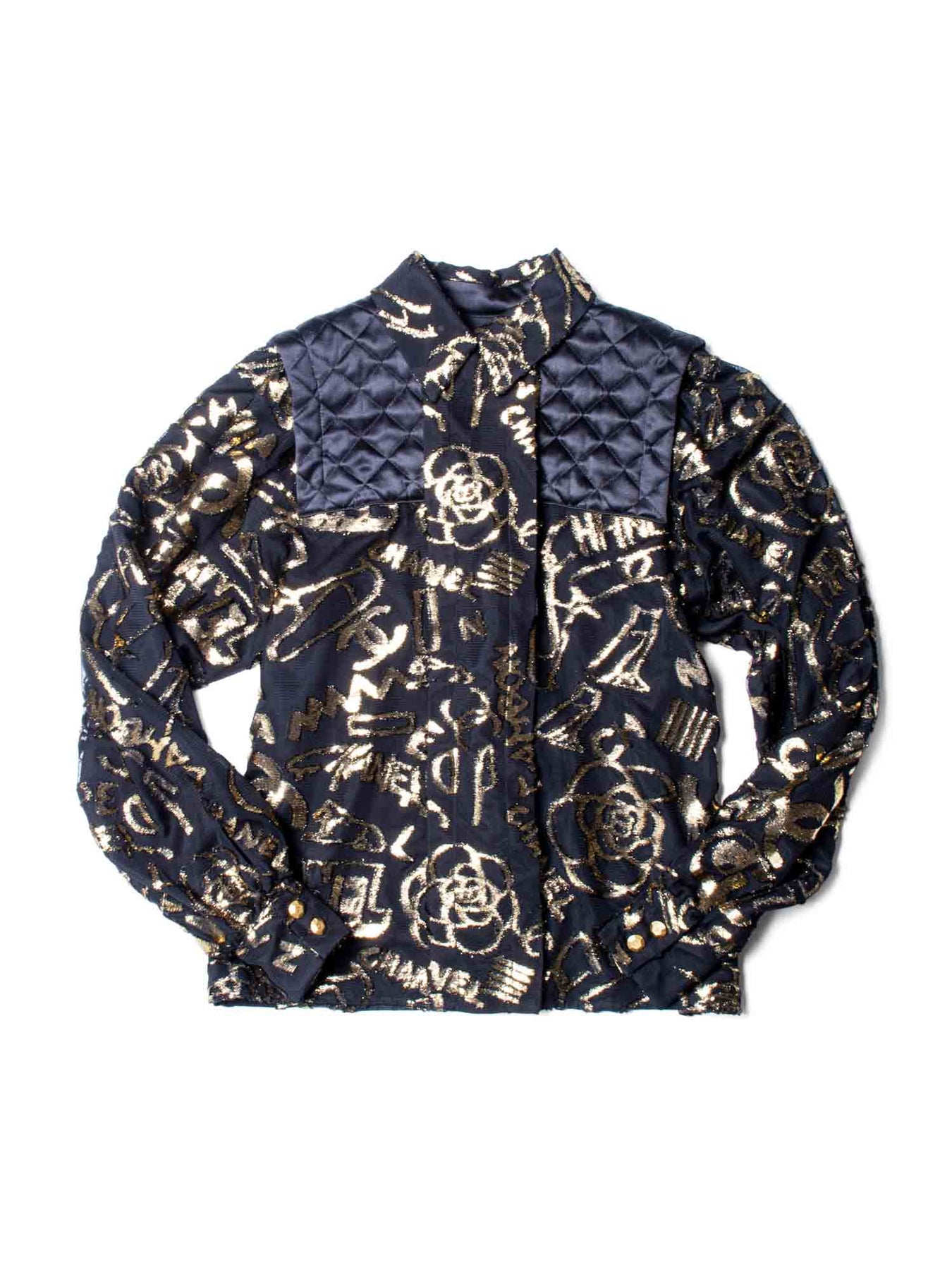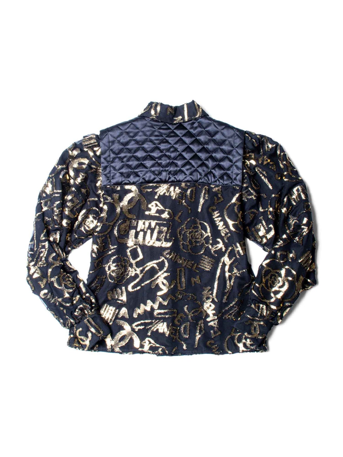 CHANEL Graffiti Button Up Blouse or . This blouse is crafted in black silk with a gold Metiers d'Art Paris New York Graffiti design, featuring quilted fabric over the shoulder, gold CHANEL buttons, and CC Logos throughout. It was in CHANEL's Pre-Fall 2019 Ancient Egypt Collection, and was one of Karl Lagerfeld's last Metiers designs.