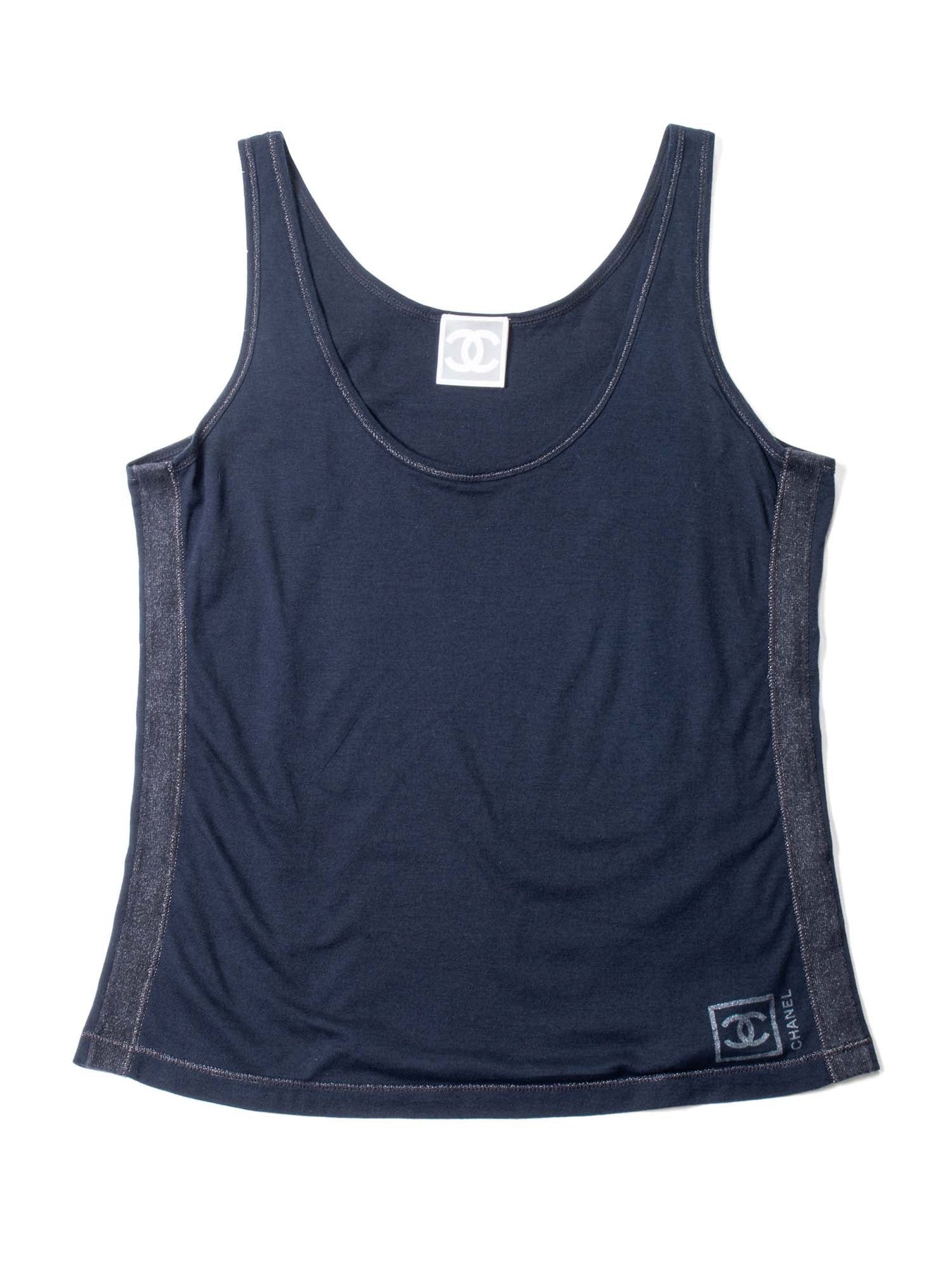 CHANEL Sleeveless Blouse or . This CHANEL blouse is crafted in black fabric with silver lurex on the outline. It features a scoop neckline and a CC Logo on the front right corner.