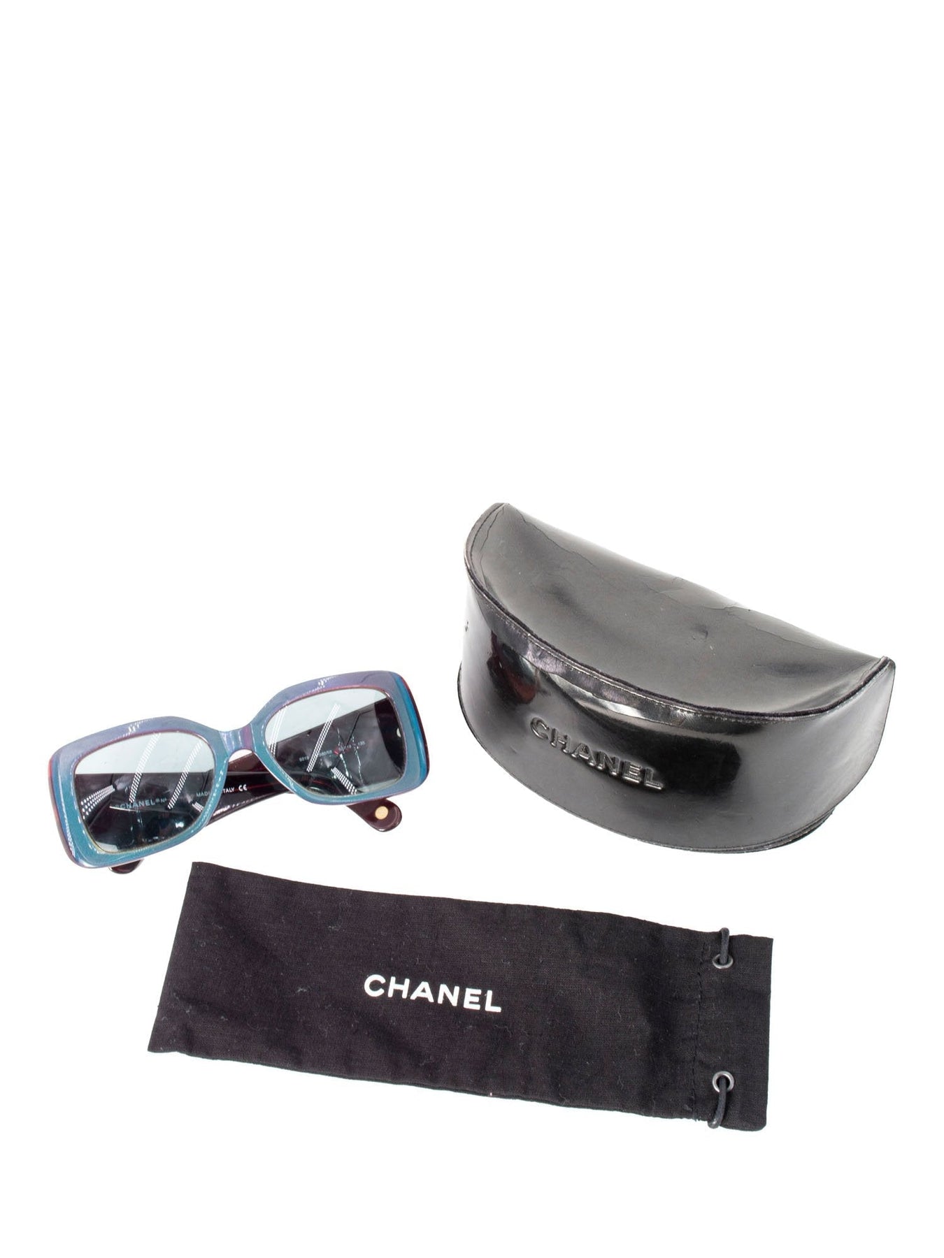 Chanel Square Sunglasses or . These stylish sunglasses are in blue acetate with red frame and smooth edges, along with a gold CC logo.