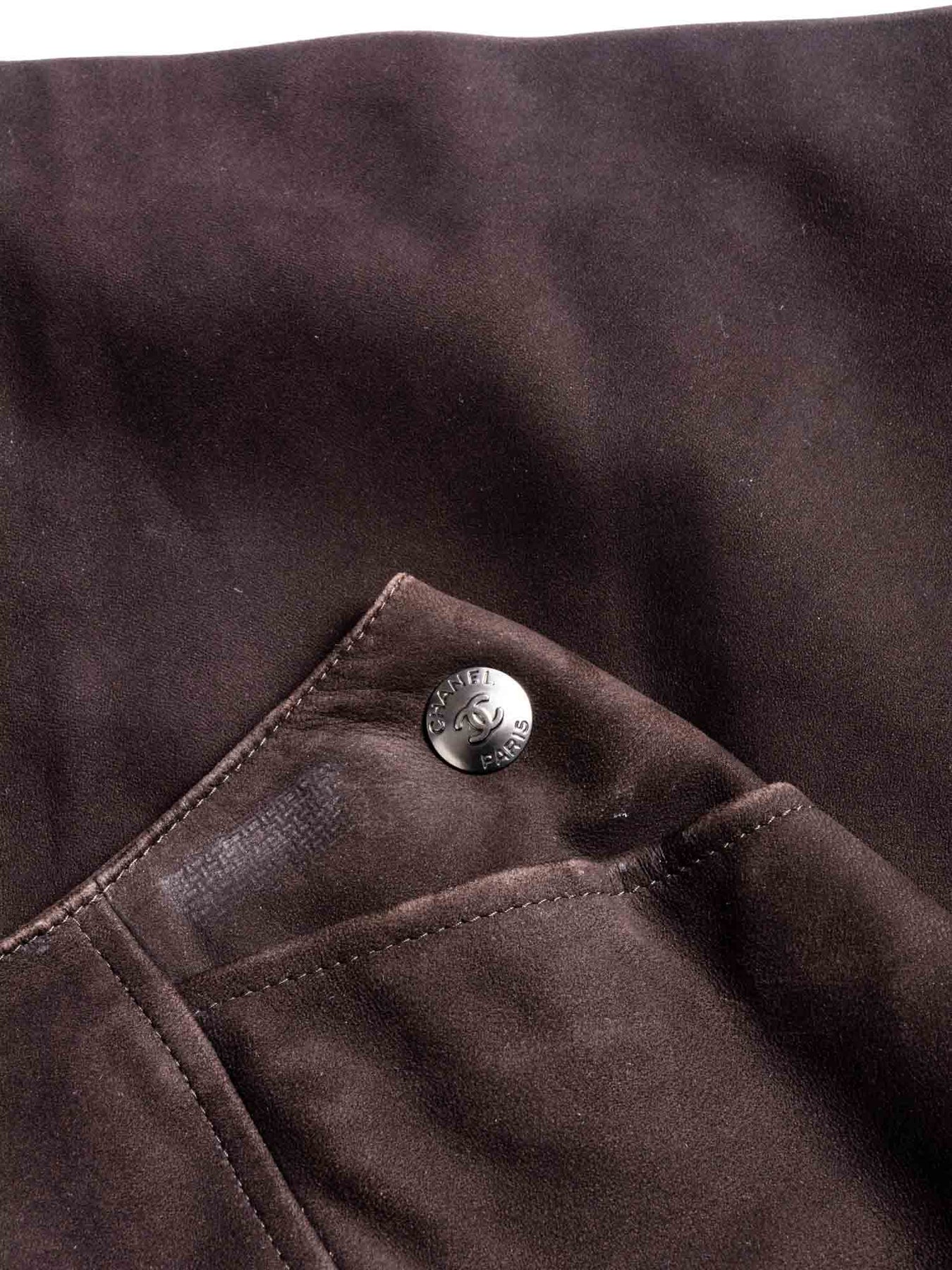 CHANEL CC Logo Suede Pocketed Skirt or . This CHANEL skirt is in brown suede lambskin fabric with two front pockets and a hidden zip closure on the back. It also has button on the top right corner stamped with "CHANEL CC PARIS".
