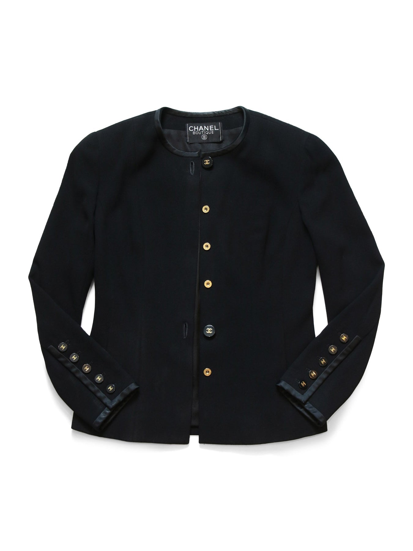 CHANEL Jacket or . This CHANEL jacket comes in a stunning black fine tweed fabric accented with a matching silk trim. It features large CC logo buttons on the front and sleeves, gold tone CHANEL buttons, two front pockets, and a CC logo silk lining.