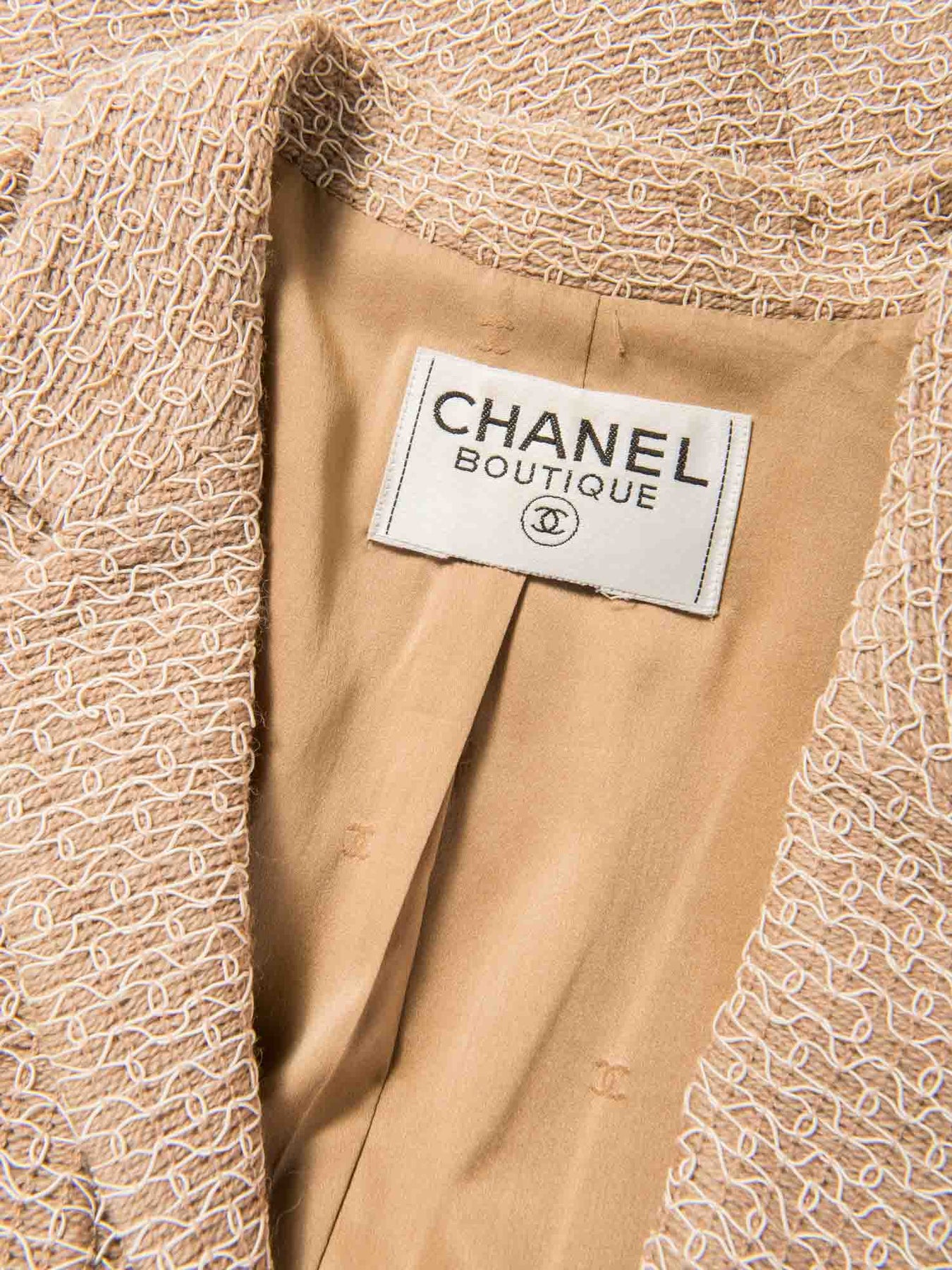 CHANEL CC Logo Tweed Jacket or . This exquisite CHANEL jacket is in beige tweed with white woven embroidery throughout. It features CC logo button closure, CC logo button detail on the sleeves, two front pockets, CC logo lining and interior silver tone chain trim.