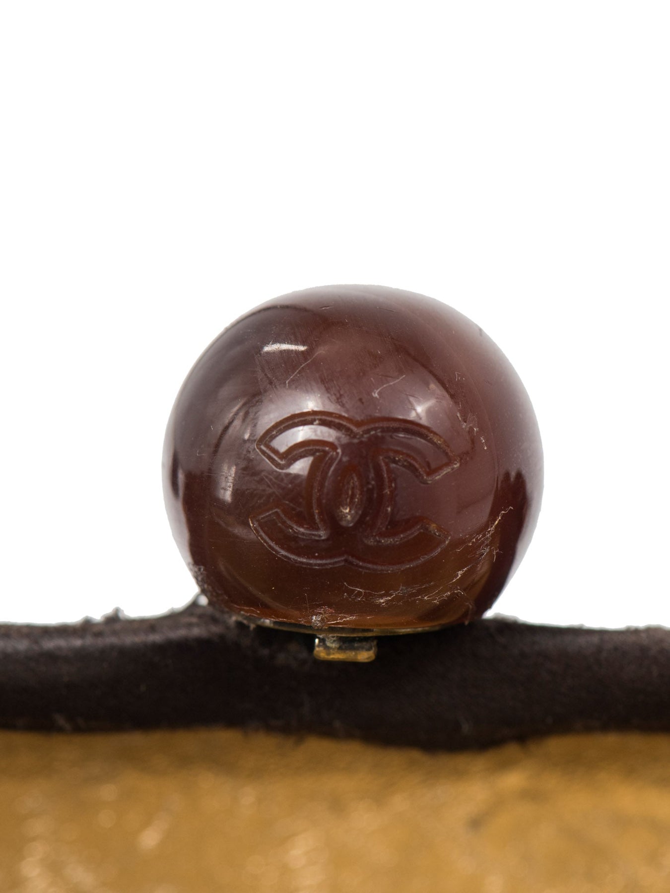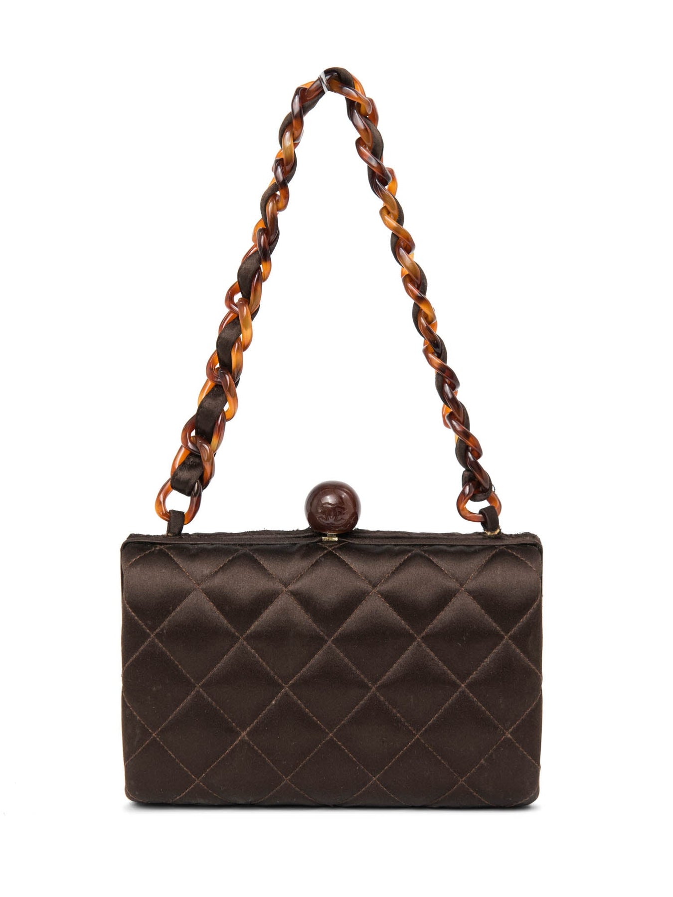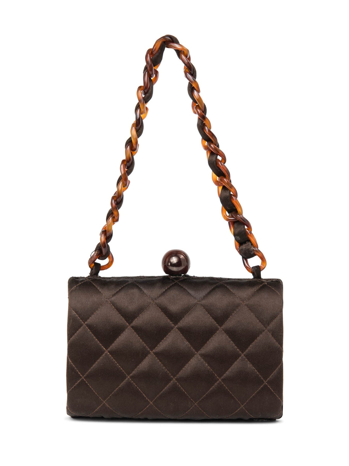 CHANEL Vintage Chain Bag or . This bag is in lush brown quilted silk with a dual brown tone lucite chain and closure. It features the CC Logo on the clasp closure which opens up to a metallic gold leather interior with a patch pocket.