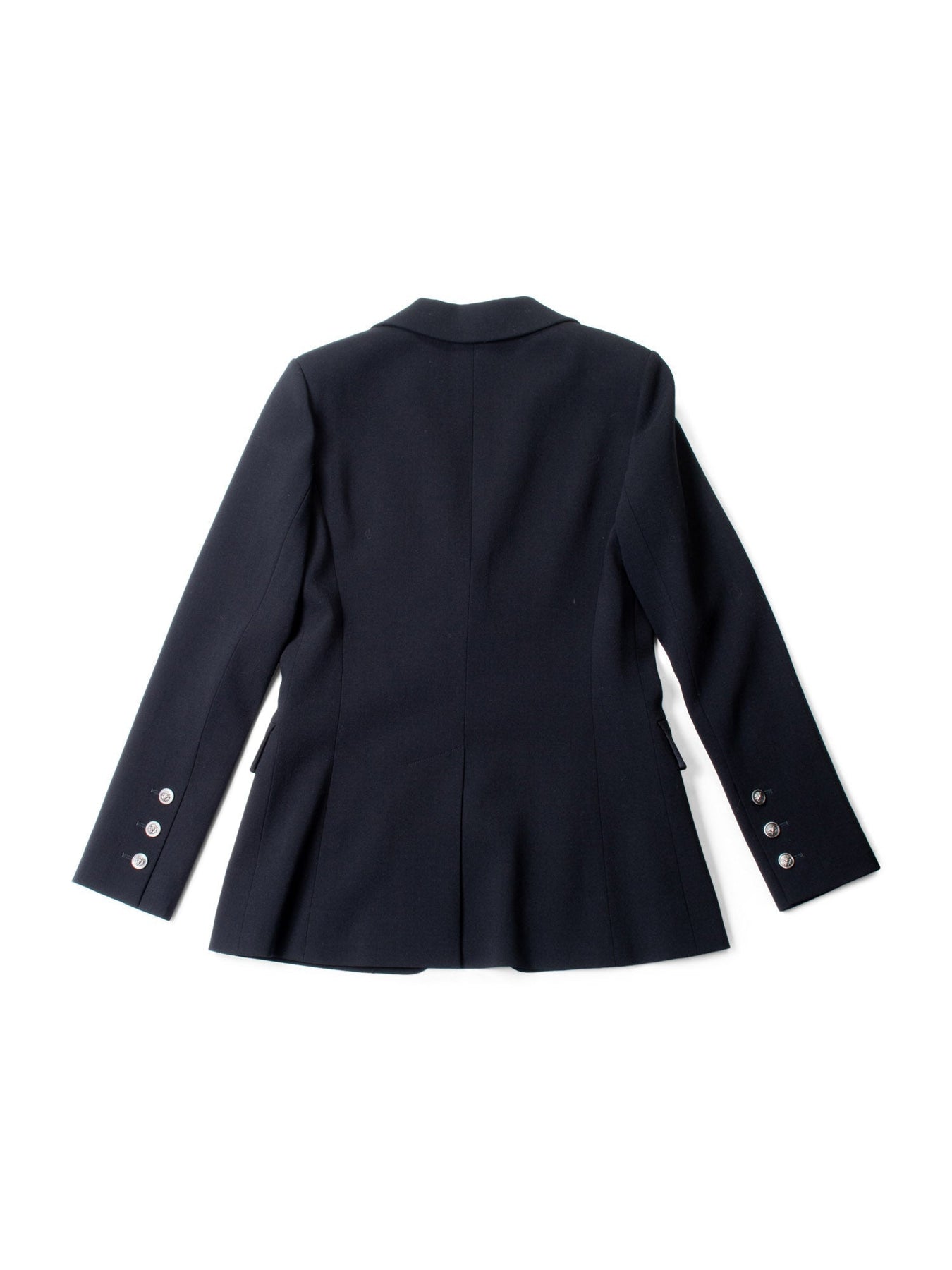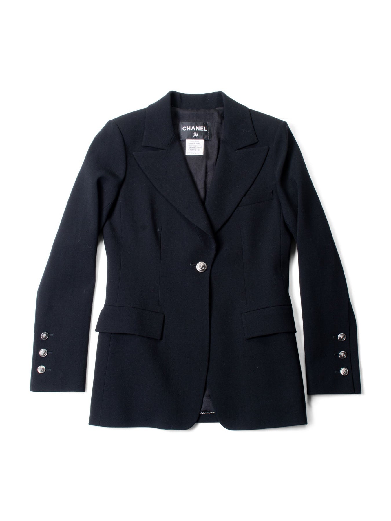 CHANEL Jacket or . It is in black wool fabric with silver tone hardware. It features two front pockets, a chest pocket, CC logo lion buttons, and a hand-sewn CHANEL chain along the bottom for a perfectly draped look. The interior features a silk camellia lining.