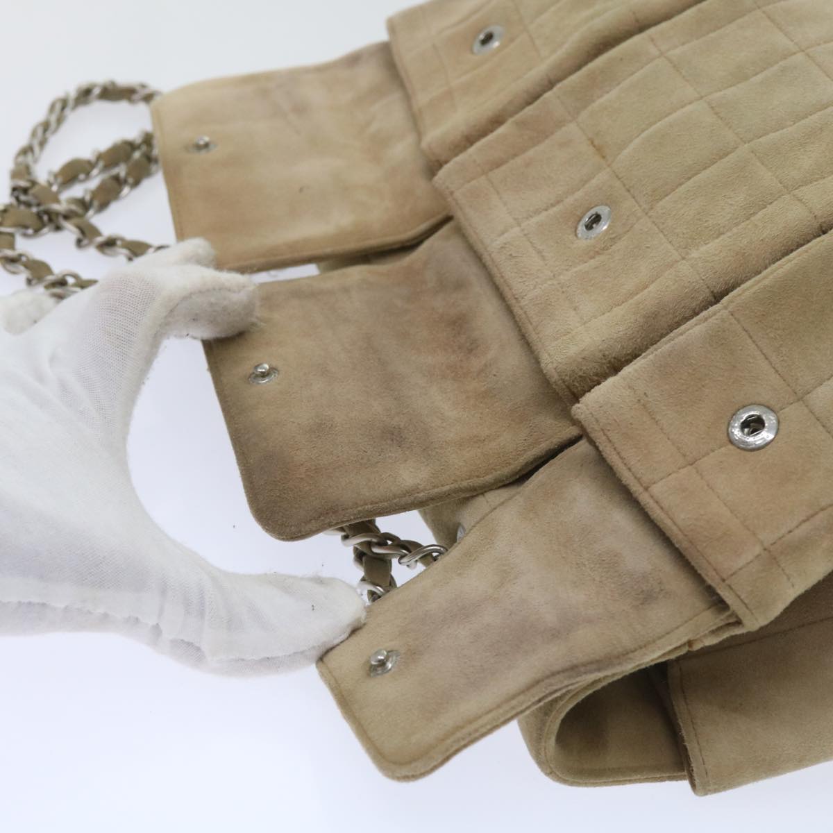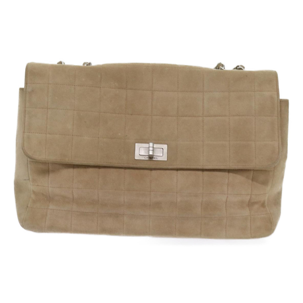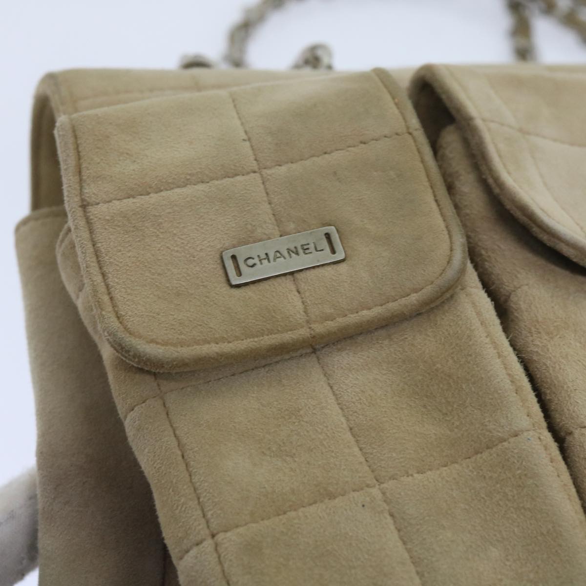 CHANEL Choco Bar Chain Shoulder Bag Suede Beige CC Auth bs11679