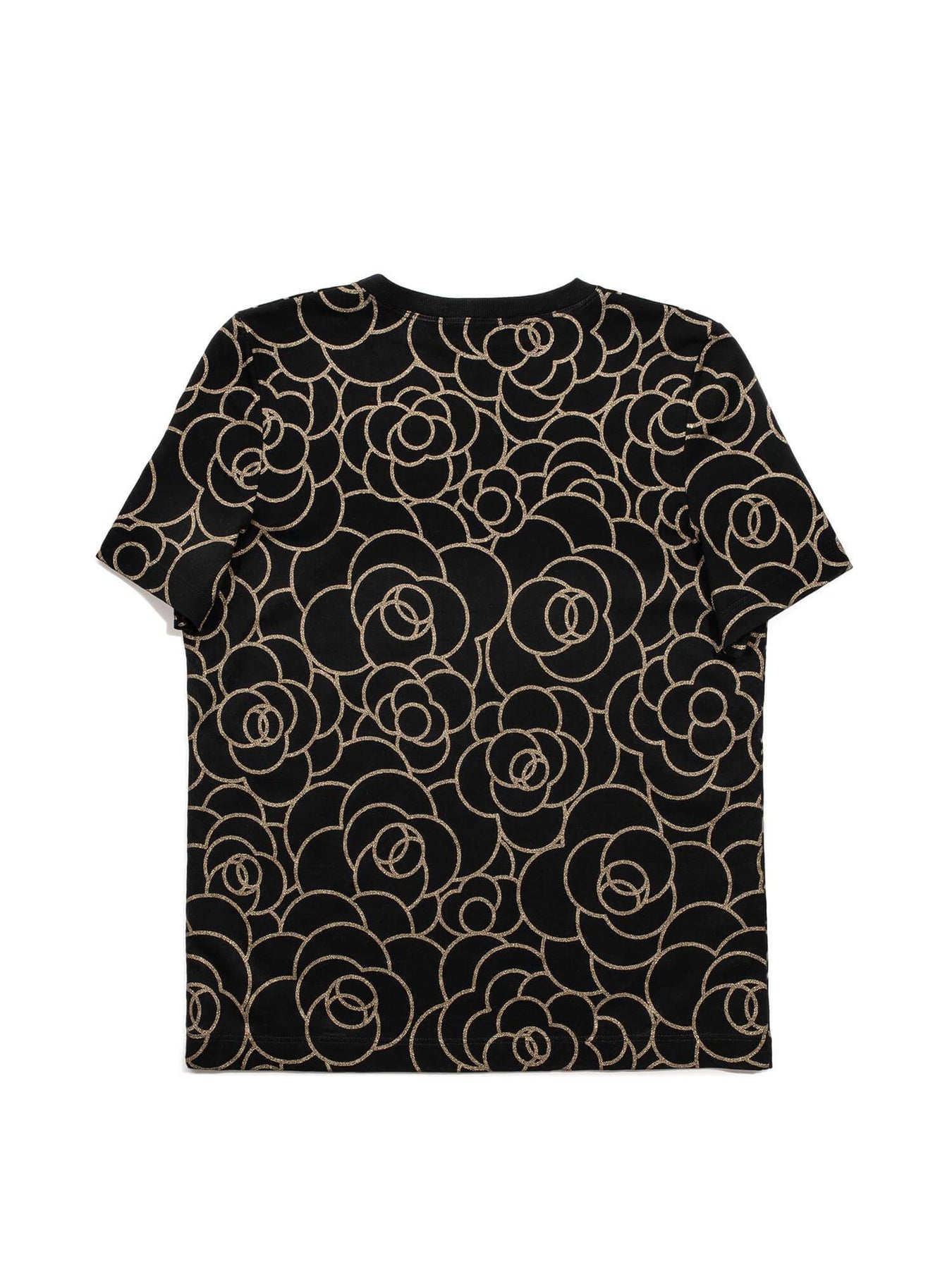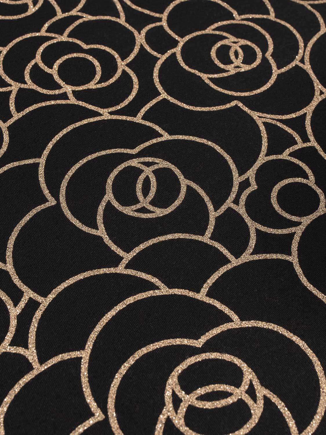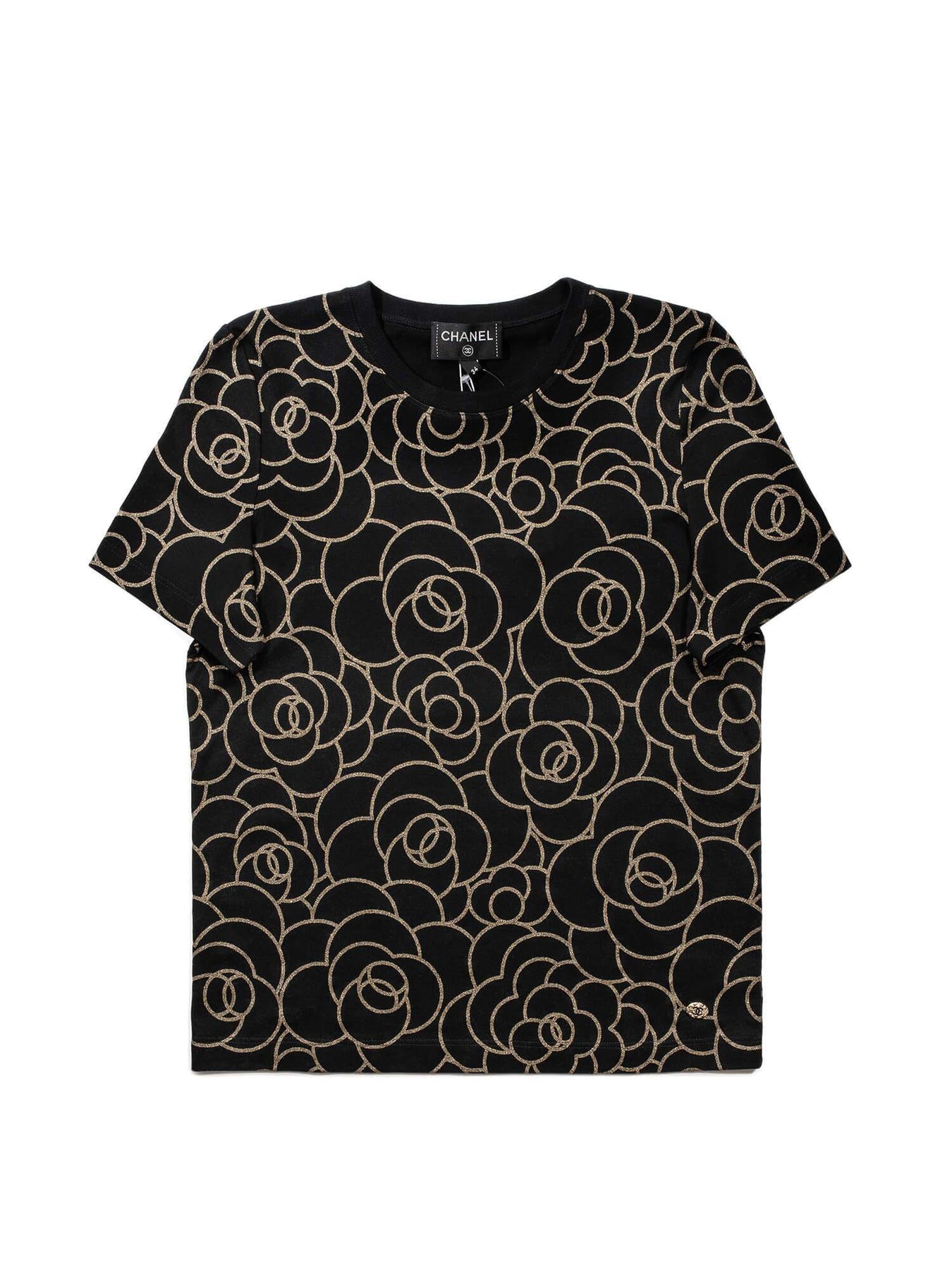 Chanel Camellia Tee Shirt or . This Chanel shirt is in black cotton and glittery gold. It features scoop neckline, oval quilted CC logo plaque at bottom right, and famous camellia flower motif. The perfect gift for the Chanel lovers. Pairs perfectly with leather leggings or jeans!