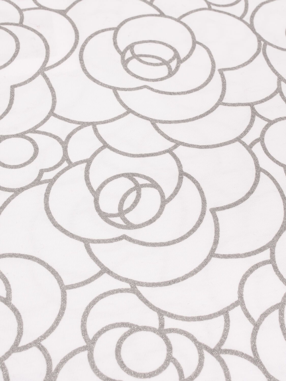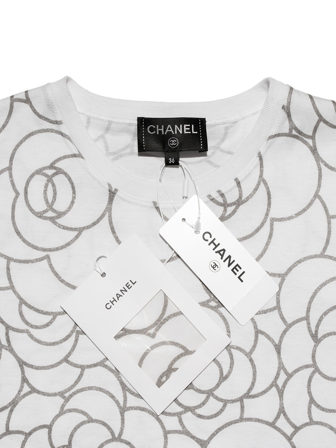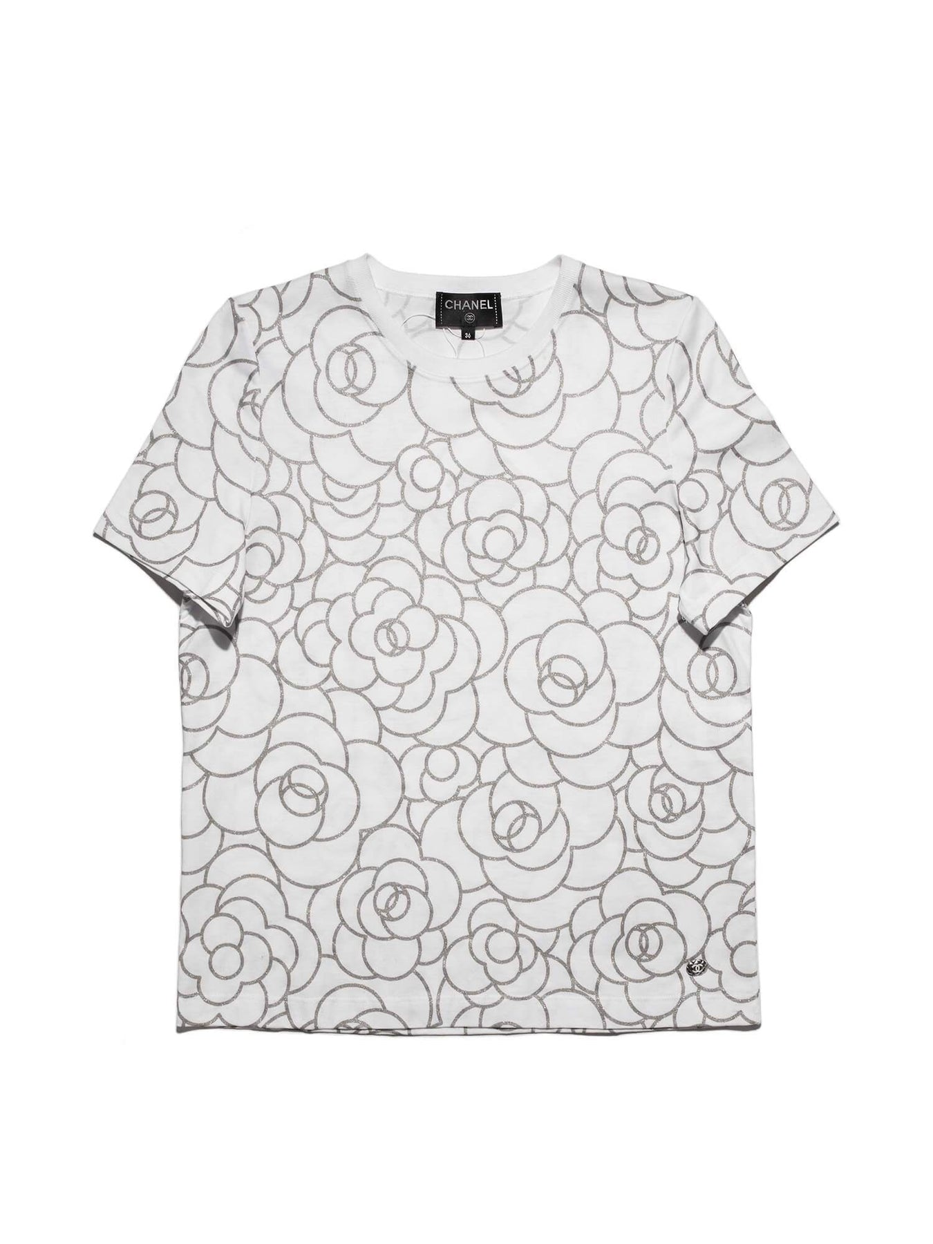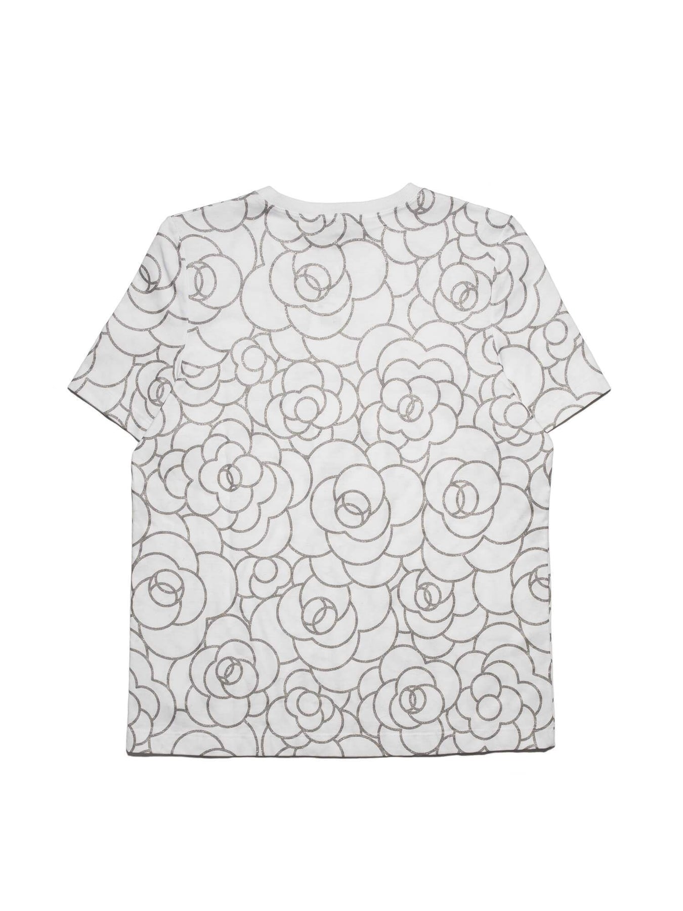 Chanel Camellia Tee Shirt or . This shirt is in white cotton and glittery silver. It features scoop neckline, oval quilted CC logo plaque at bottom right, and famous camellia flower motif. The perfect gift for Chanel lovers. Pairs perfectly with leather leggings or jeans!