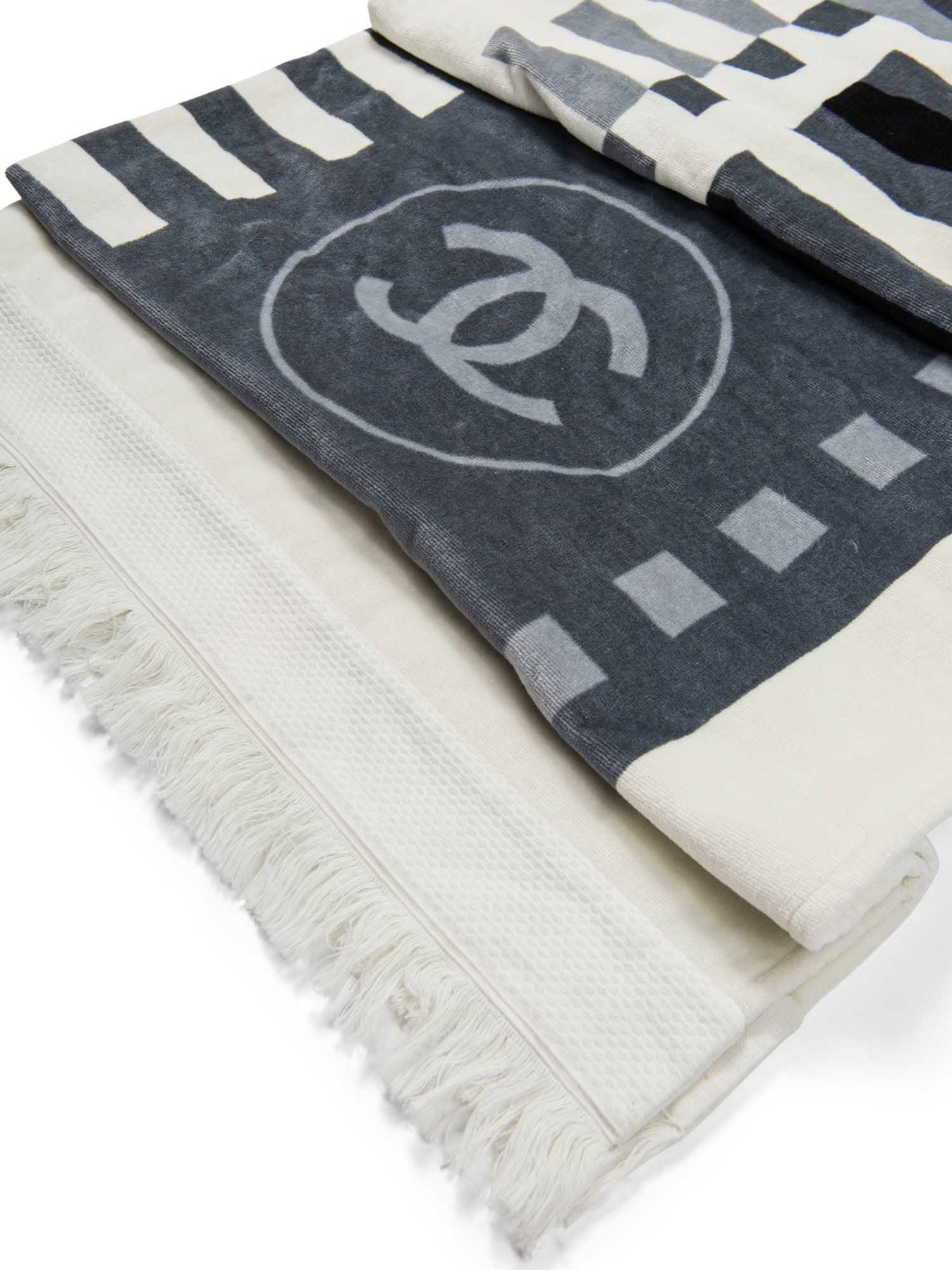 This beach towel is in grayscale cotton fabric, featuring a CC logo on the front and fringe along the edges.