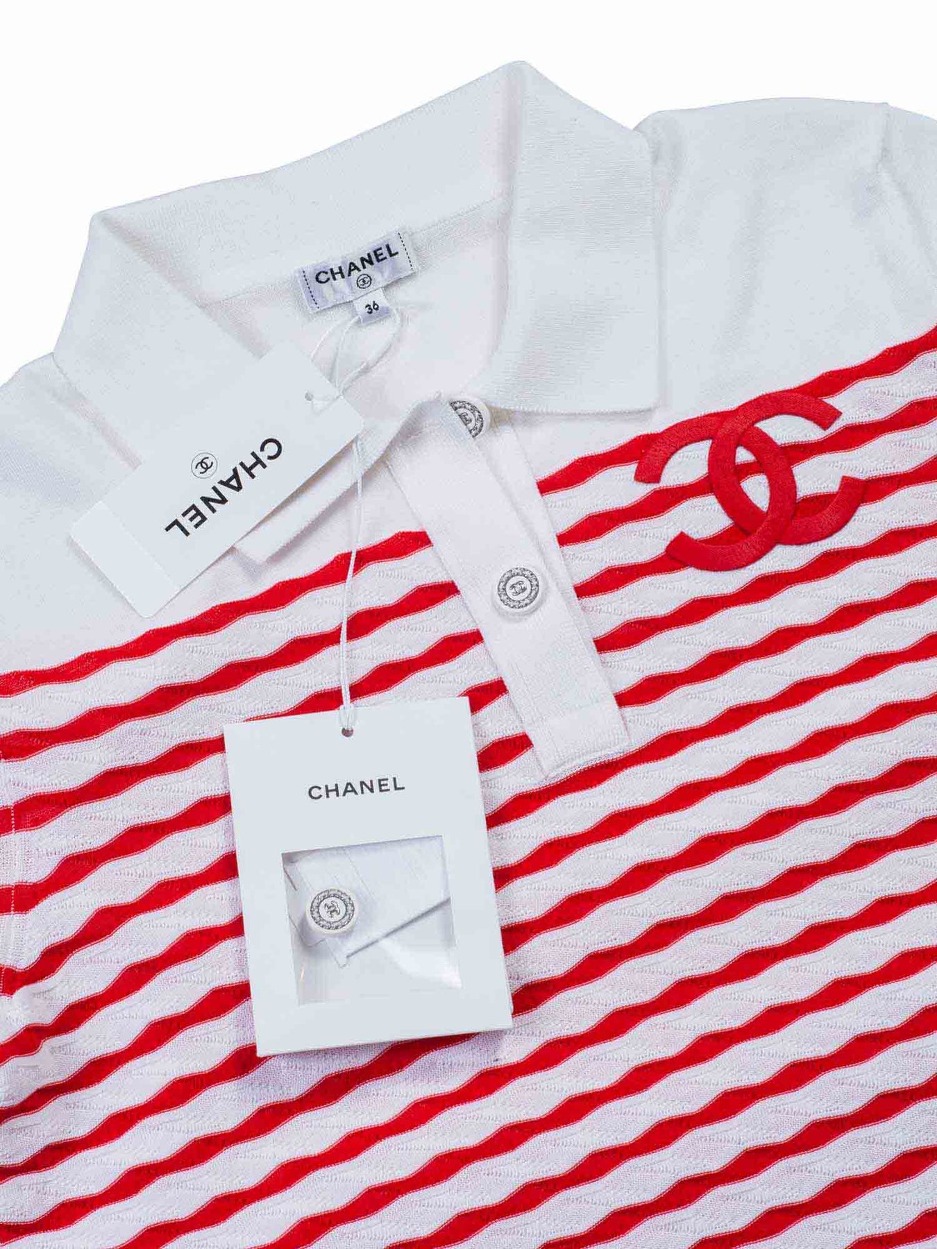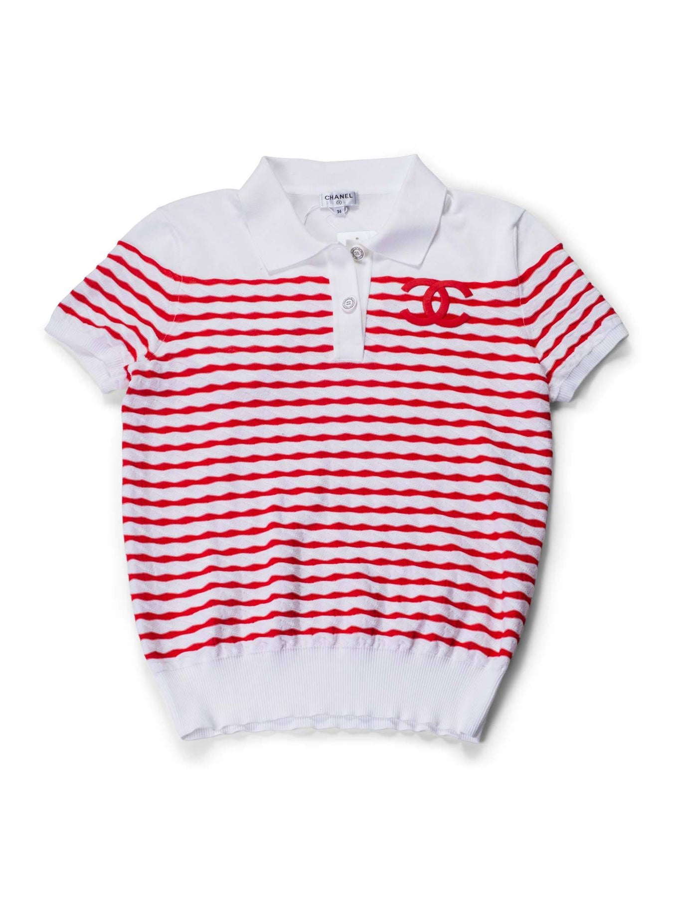 Chanel Cotton Polo T-Shirt or . Chanel Cruise/Resort 2019 collection. This shirt is made from a soft cotton fabric. It features red and white stripes, large embroidered CC logo accent along with 2 Chanel buttons accents and a collar neckline.