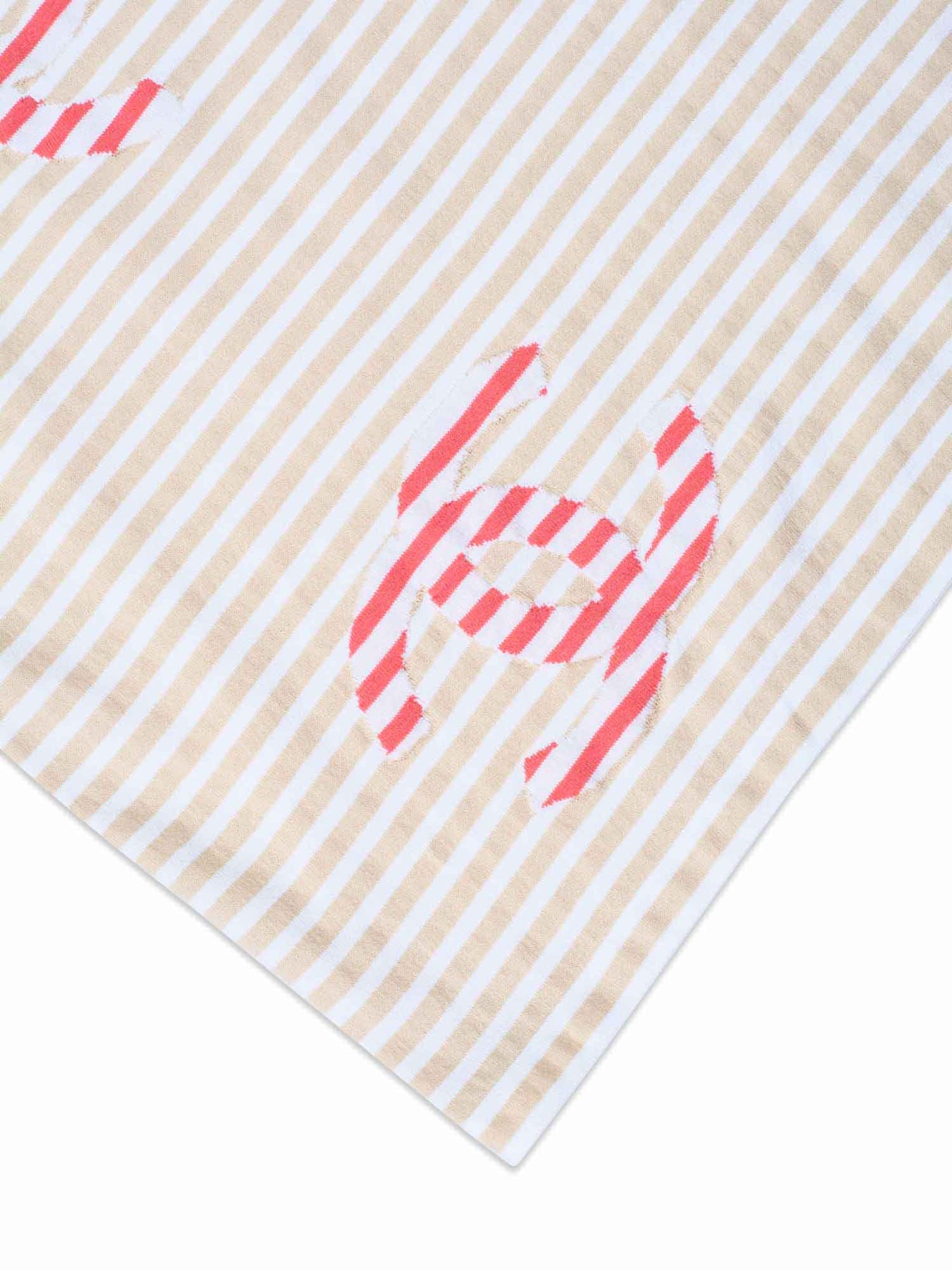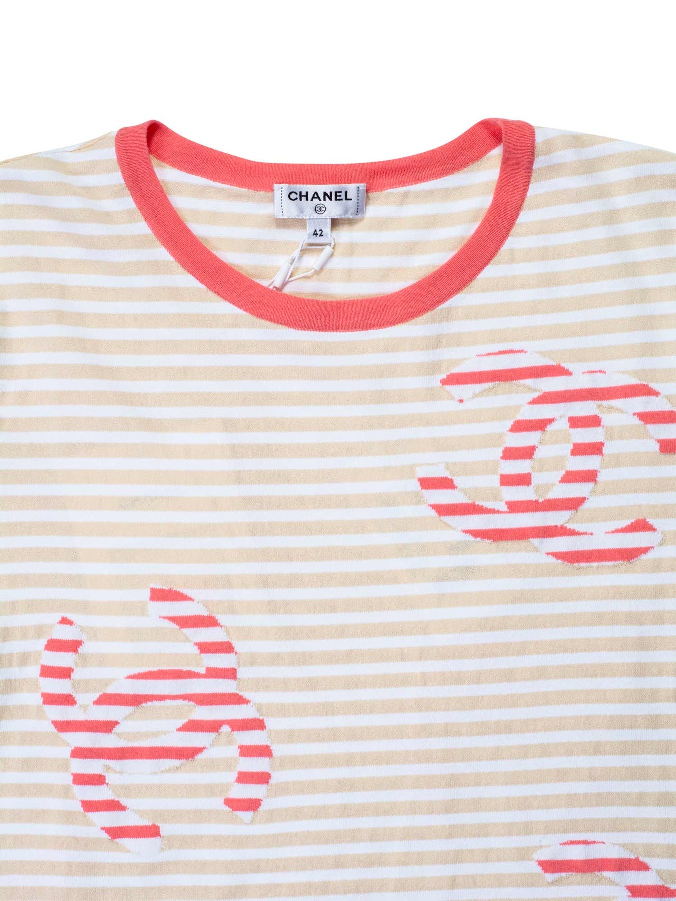 Chanel Cotton Stripe Top or . This top is in cotton with white and tan stripes. It features scoop neckline, pink and white CC logo throughout the shirt, and pink trim. The perfect gift for Chanel lovers. Pairs perfectly with leather leggings or jeans!