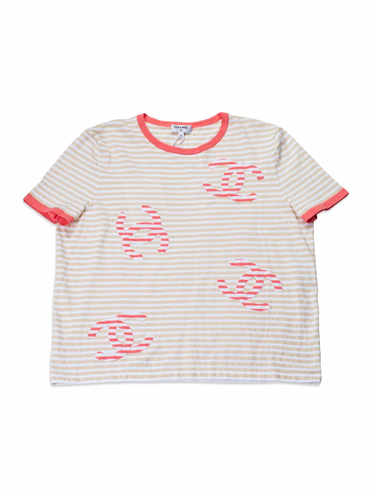 Chanel Cotton Stripe Top or . This top is in cotton with white and tan stripes. It features scoop neckline, pink and white CC logo throughout the shirt, and pink trim. The perfect gift for Chanel lovers. Pairs perfectly with leather leggings or jeans!