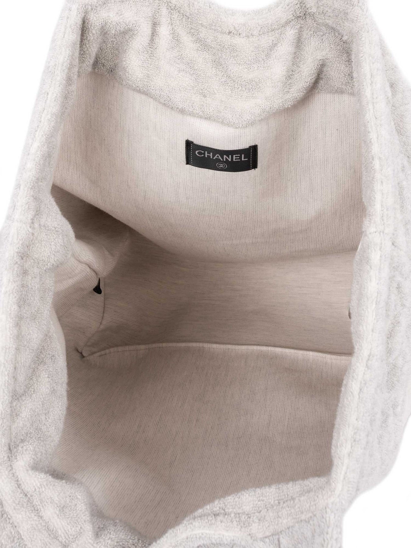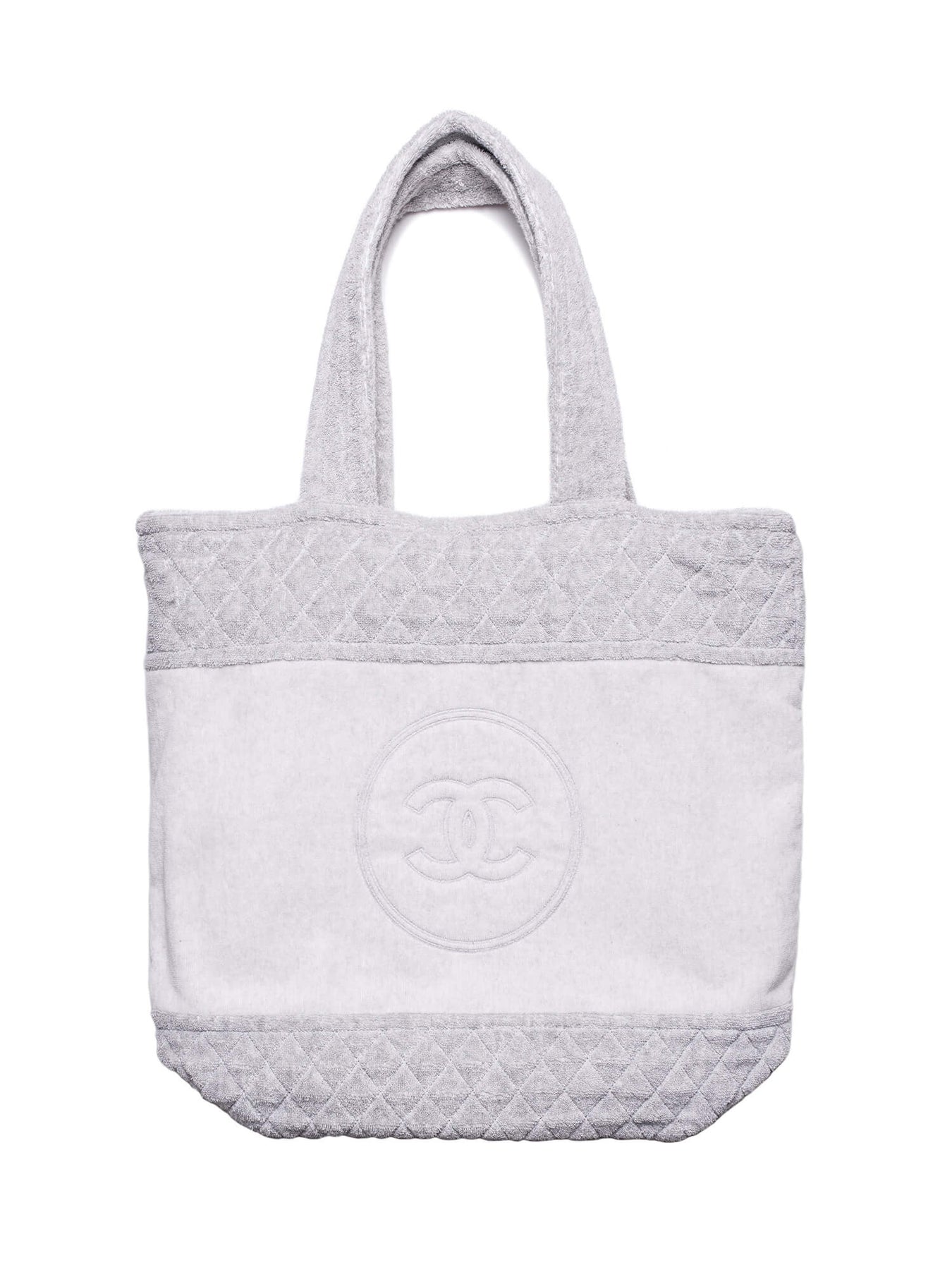 Chanel Beach Bag or . This Chanel tote is in premium grey cotton, featuring quilted trim, frontal large CC logo, dual handles, and attached pouch.The pouch is in matching quilted cotton and frontal CC logo with top zipped closure.