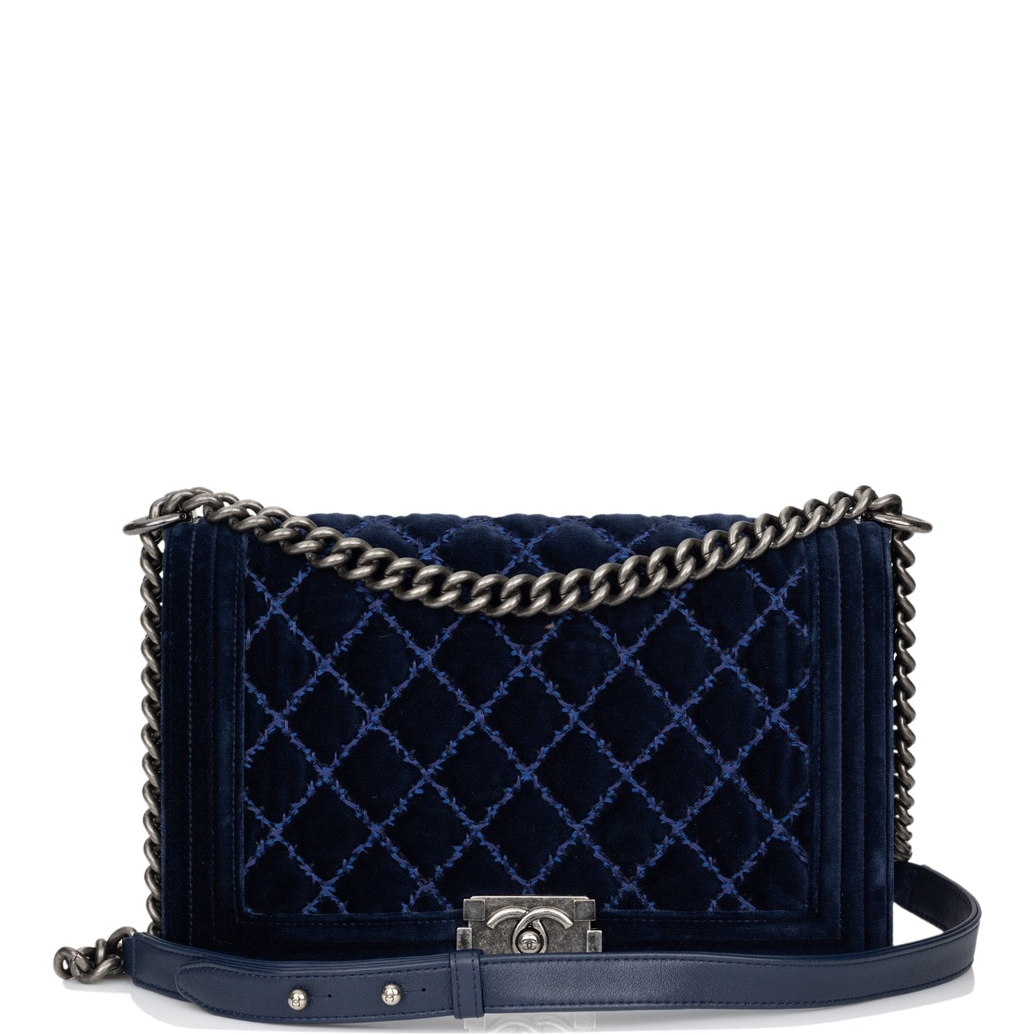 This Large Medium Boy bag is in blue quilted velvet with ruthenium tone hardware and features a full front flap with the Le Boy CC push lock closure and a ruthenium tone chain link and blue leather padded shoulder/crossbody strap.