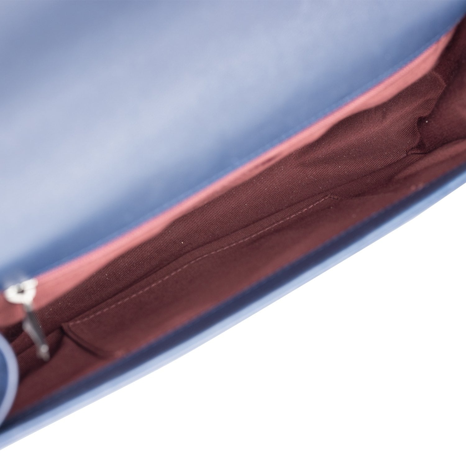 The interior is lined in blue fabric with an open pocket on rear wall.
