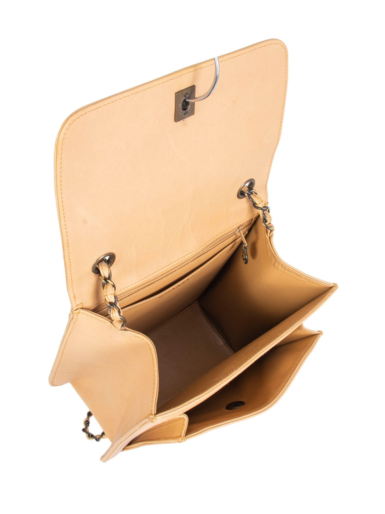 Chanel Bag or . This bag is in beige leather with brass hardware. It features frontal CC logo with turn lock closure, leather shoulder strap, an open pocket on exterior, an open pocket in interior, and one zipped interior pocket.