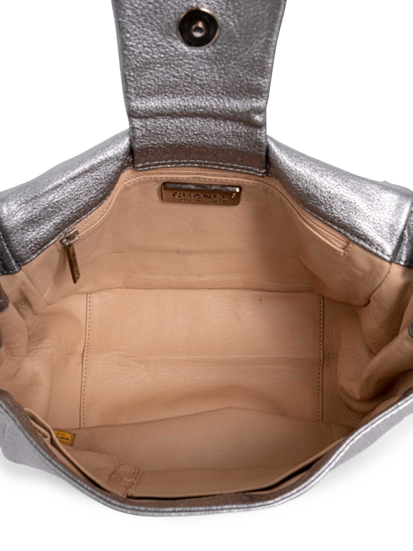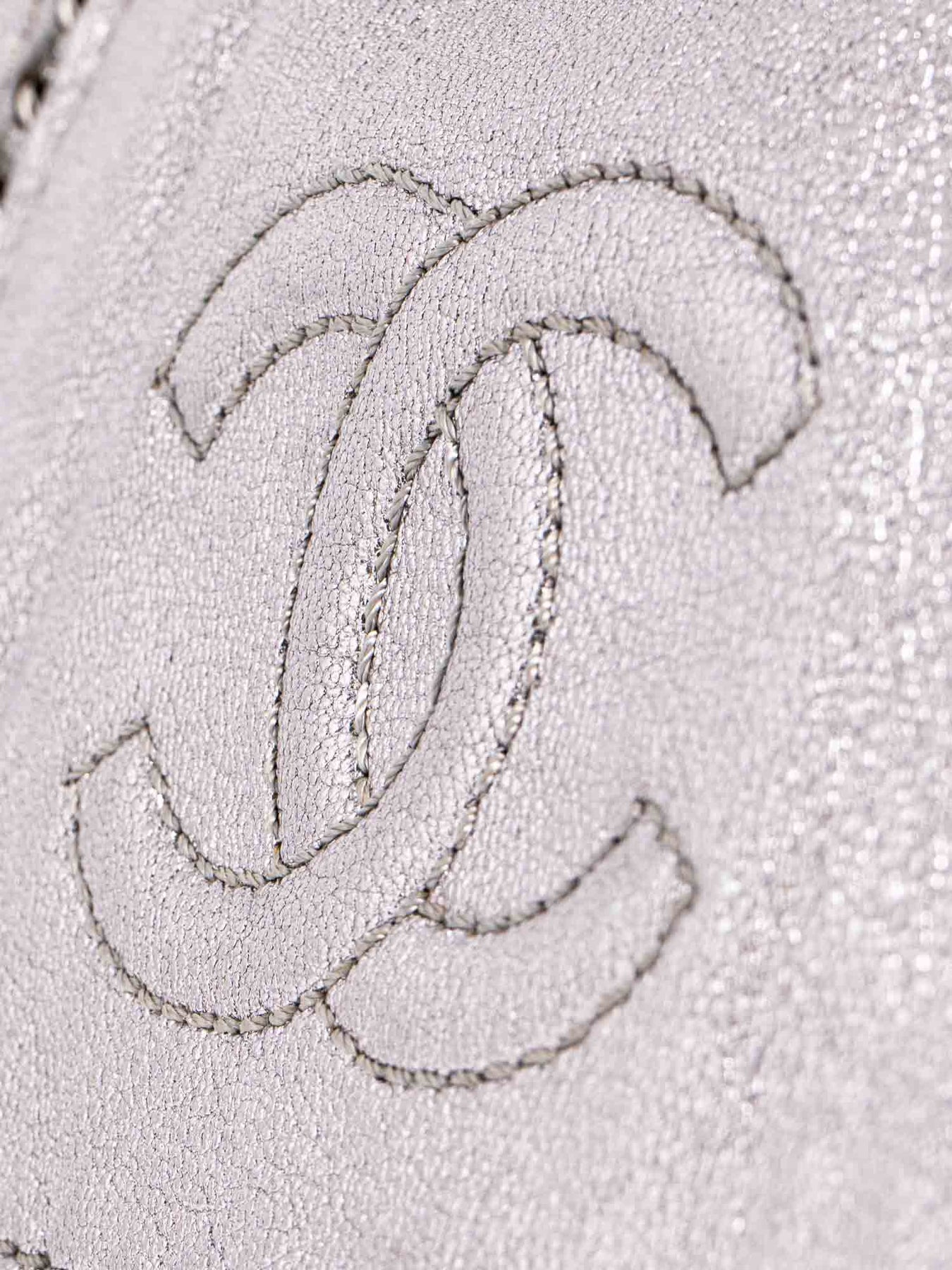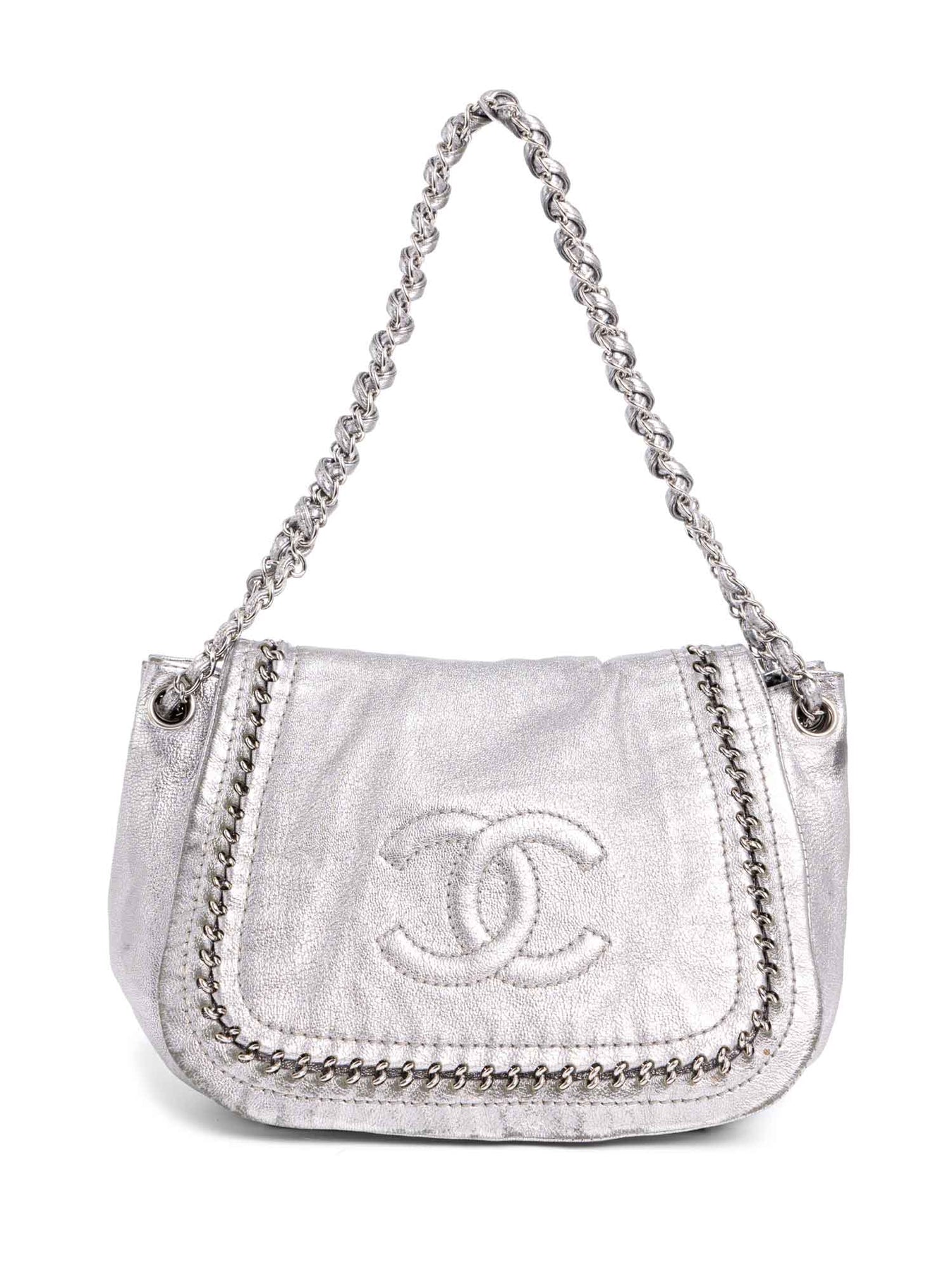 Chanel Chain Around Flap Bag or . This Chanel bag is in metallic leather with prominent silver-tone hardware. It features the signature CC logo on the front, chain around detailing, and a double leather woven silver chain. It opens up to a beige leather interior with one interior zip pocket and two slip pockets.
