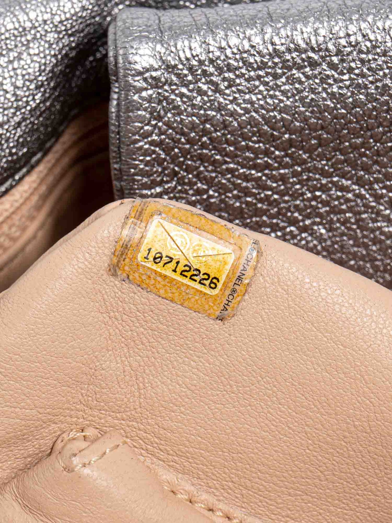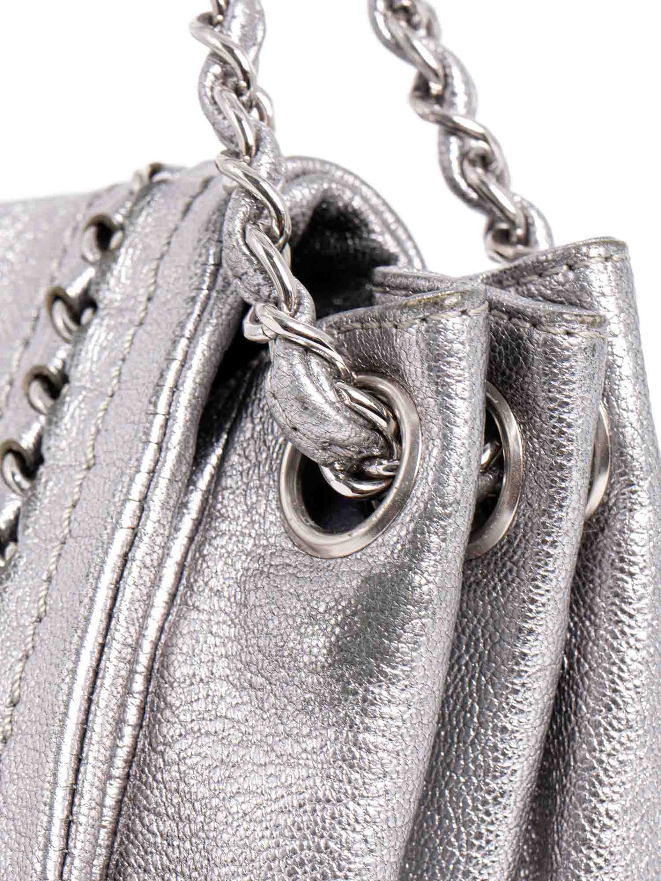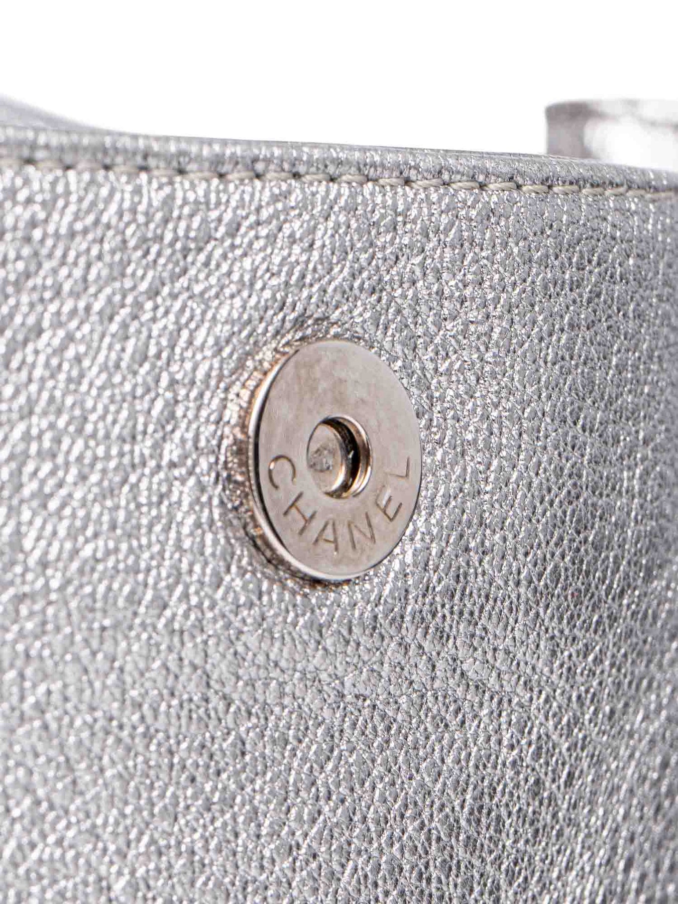 Chanel Chain Around Flap Bag or . This Chanel bag is in metallic leather with prominent silver-tone hardware. It features the signature CC logo on the front, chain around detailing, and a double leather woven silver chain. It opens up to a beige leather interior with one interior zip pocket and two slip pockets.